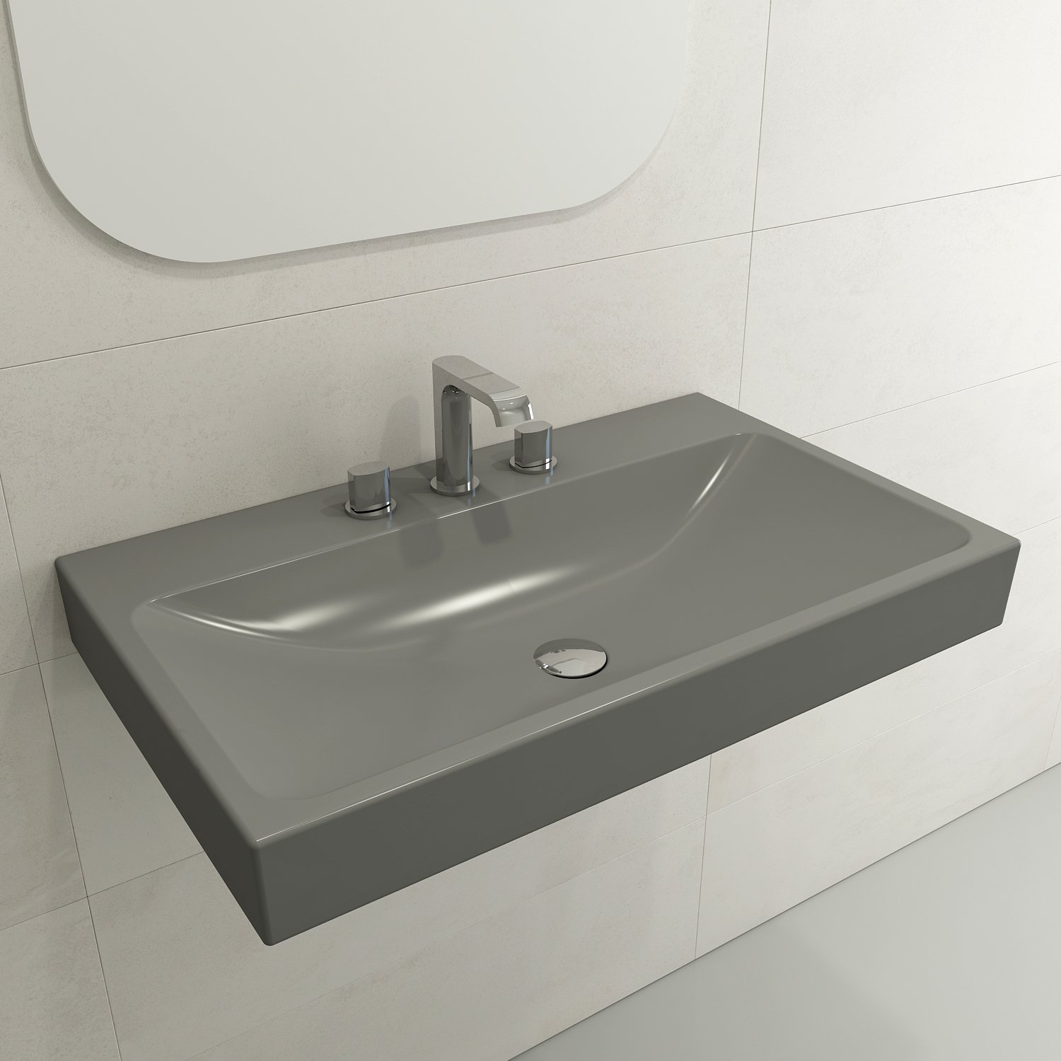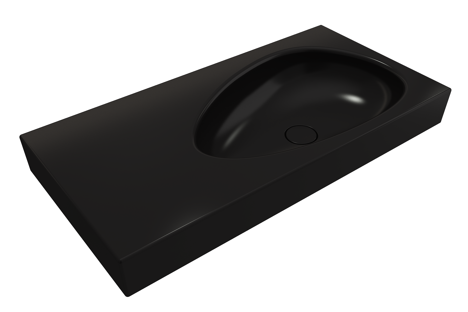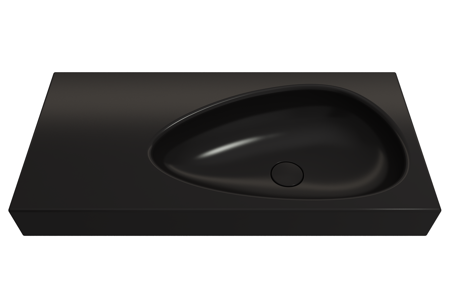 Unique wall-mount sink with counter shape and artist's palette shaped basin. Features counter area around the asymetrically, left-set basin. Without overflow or faucet setting; requires a wall-mounted faucet. Comes with a color-matched, pop-up drain cover.