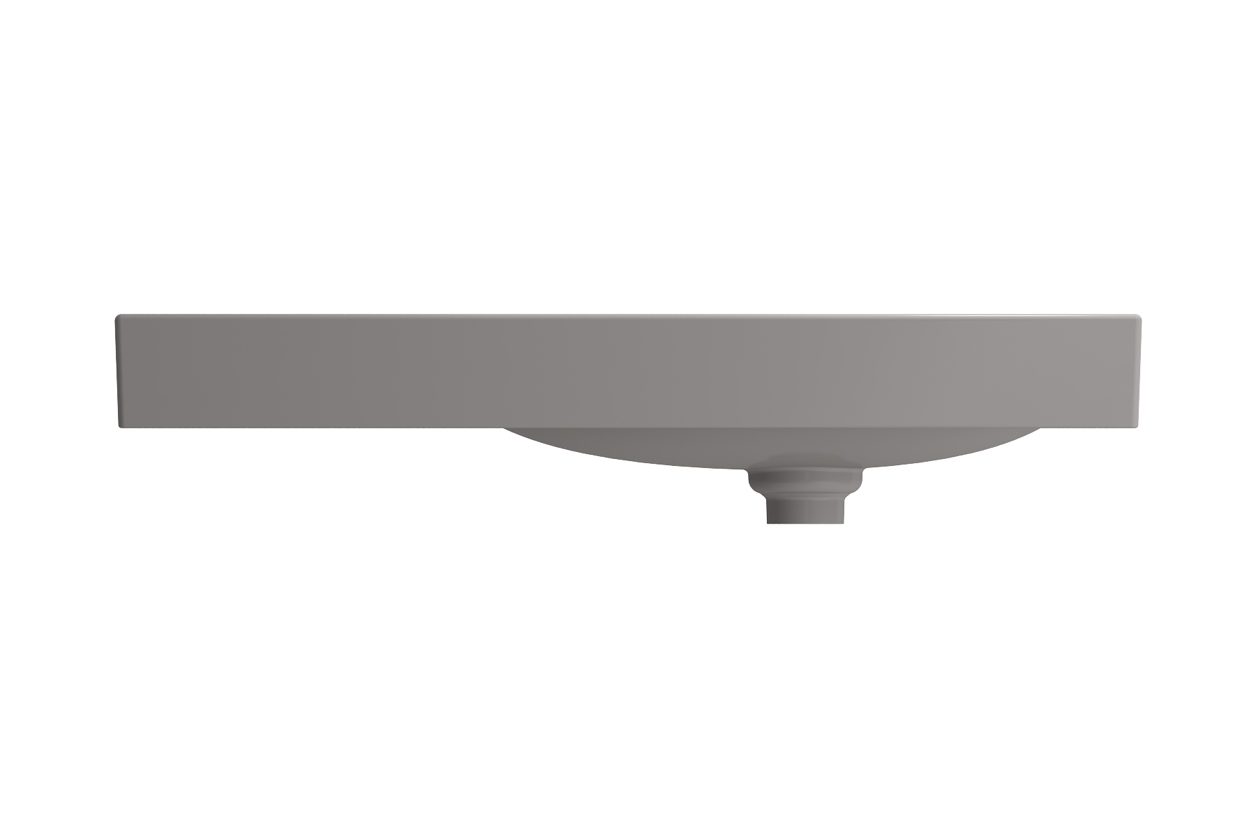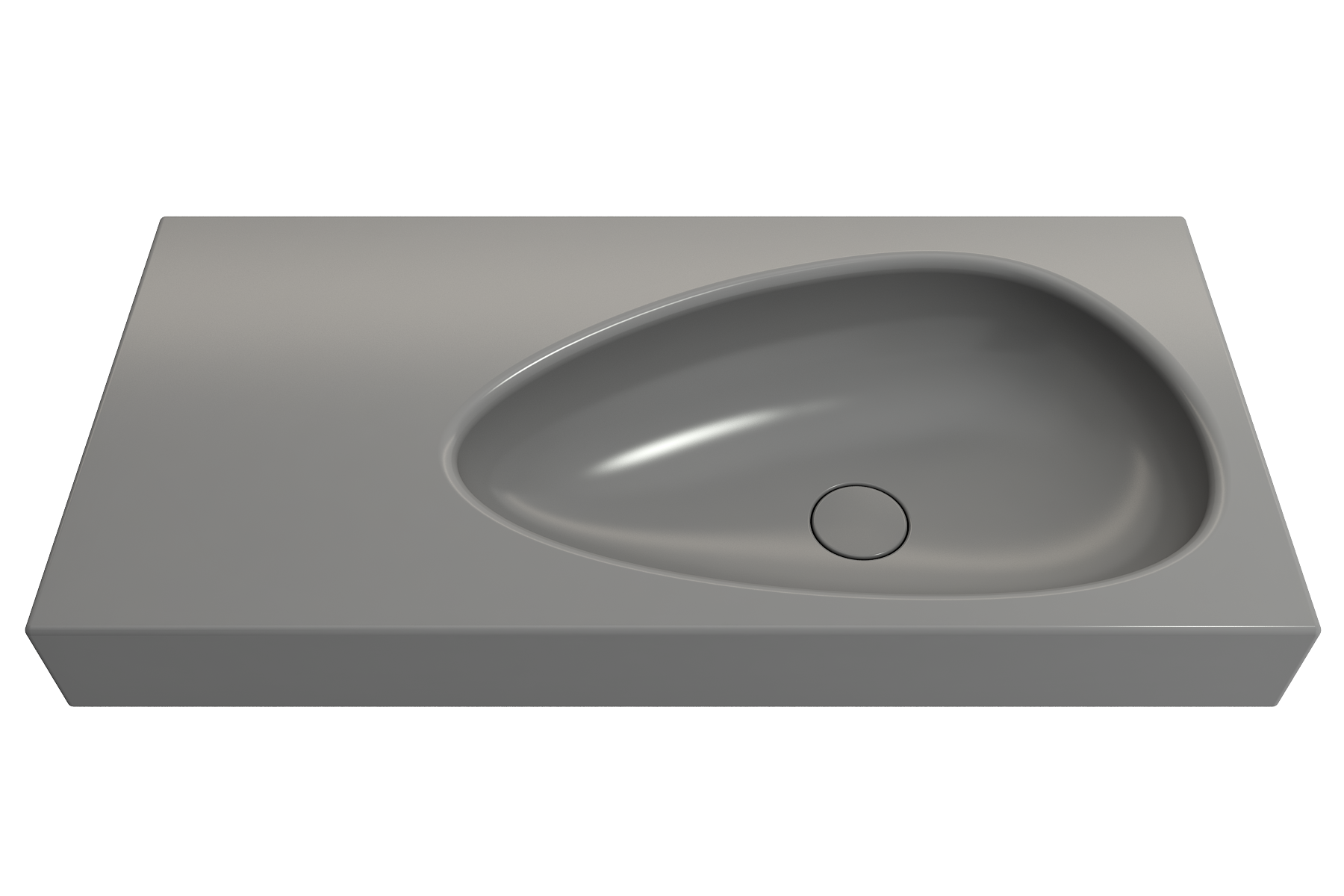 Unique wall-mount sink with counter shape and artist's palette shaped basin. Features counter area around the asymetrically, left-set basin. Without overflow or faucet setting; requires a wall-mounted faucet. Comes with a color-matched, pop-up drain cover.