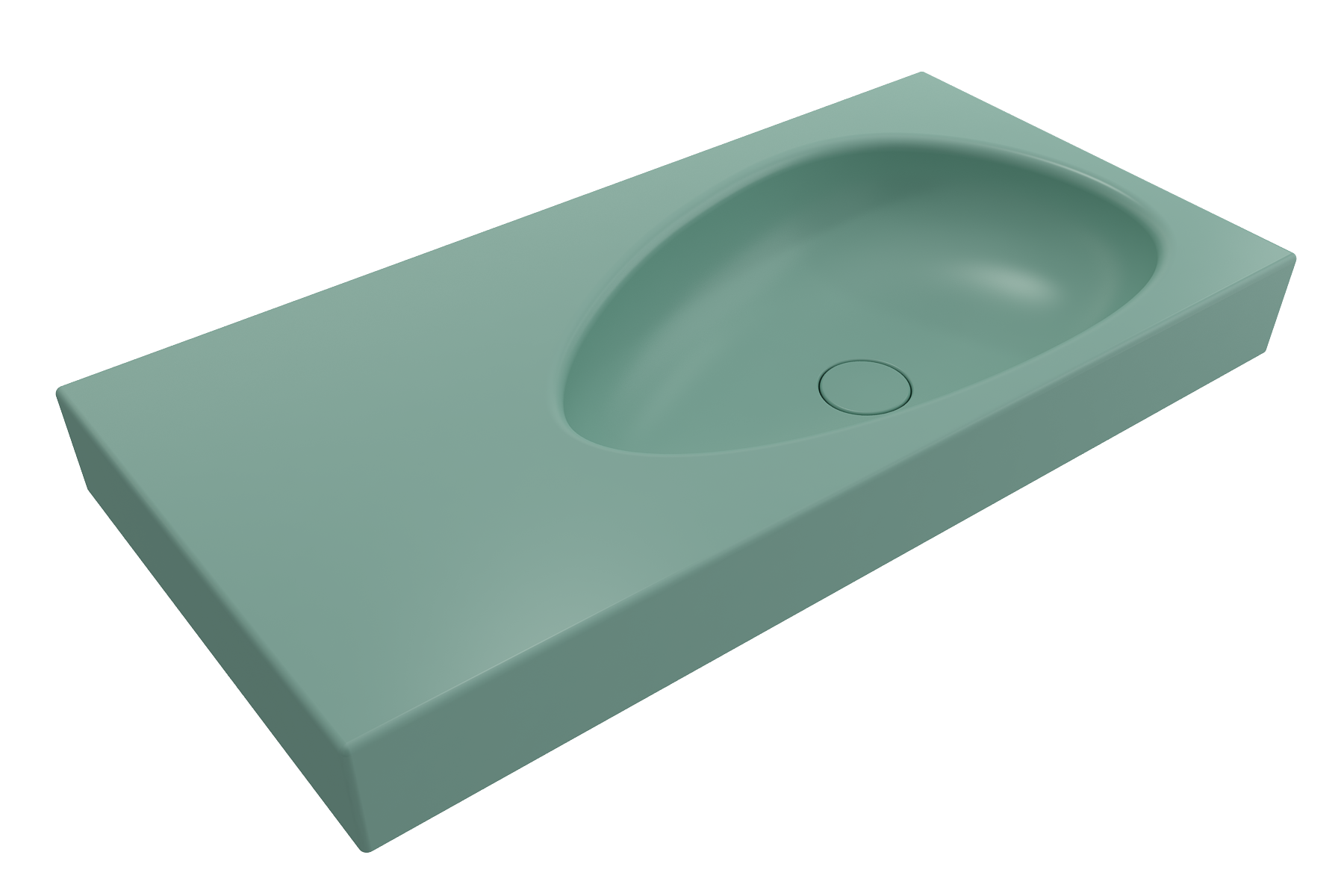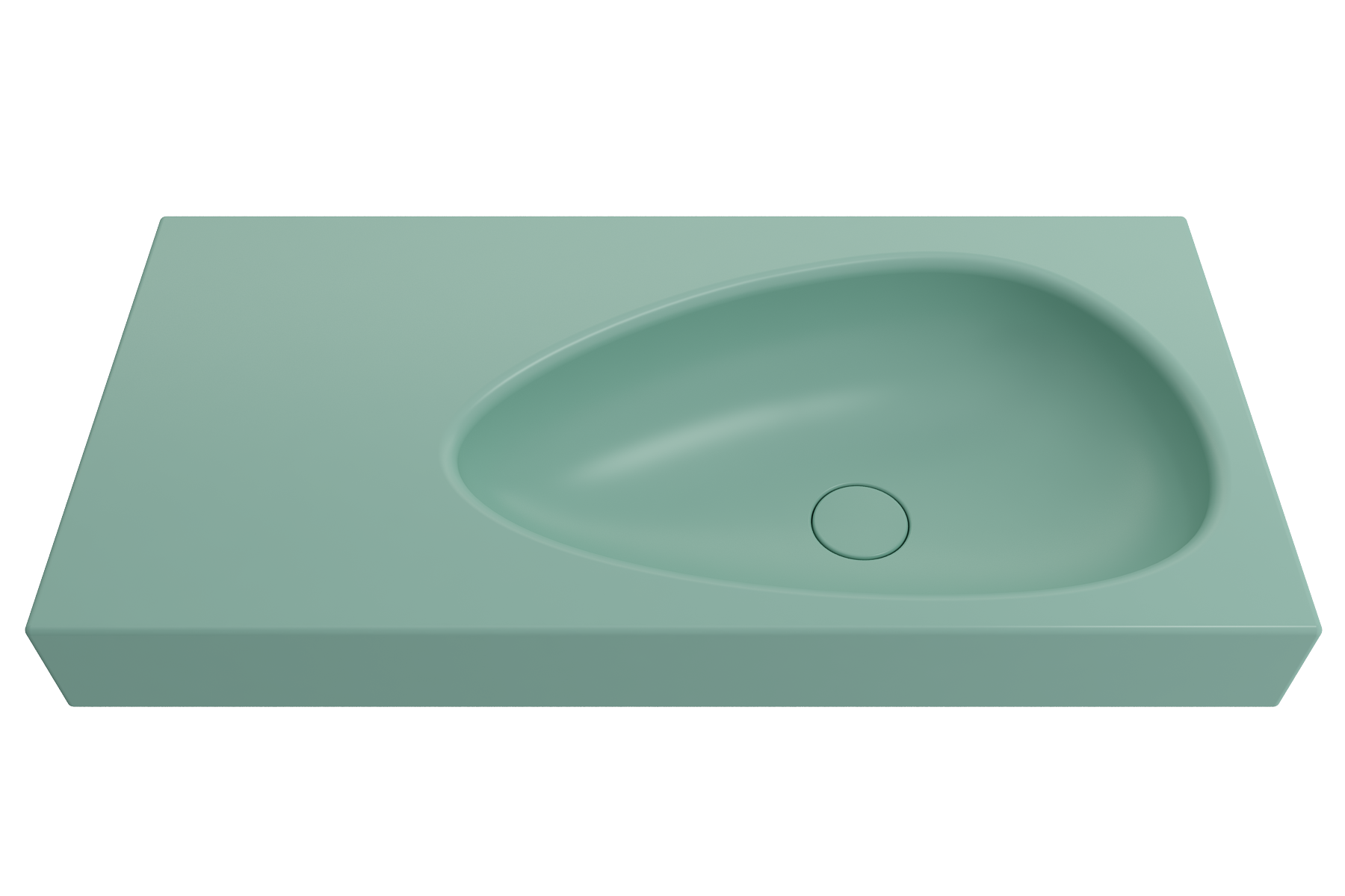 Unique wall-mount sink with counter shape and artist's palette shaped basin. Features counter area around the asymetrically, left-set basin. Without overflow or faucet setting; requires a wall-mounted faucet. Comes with a color-matched, pop-up drain cover.