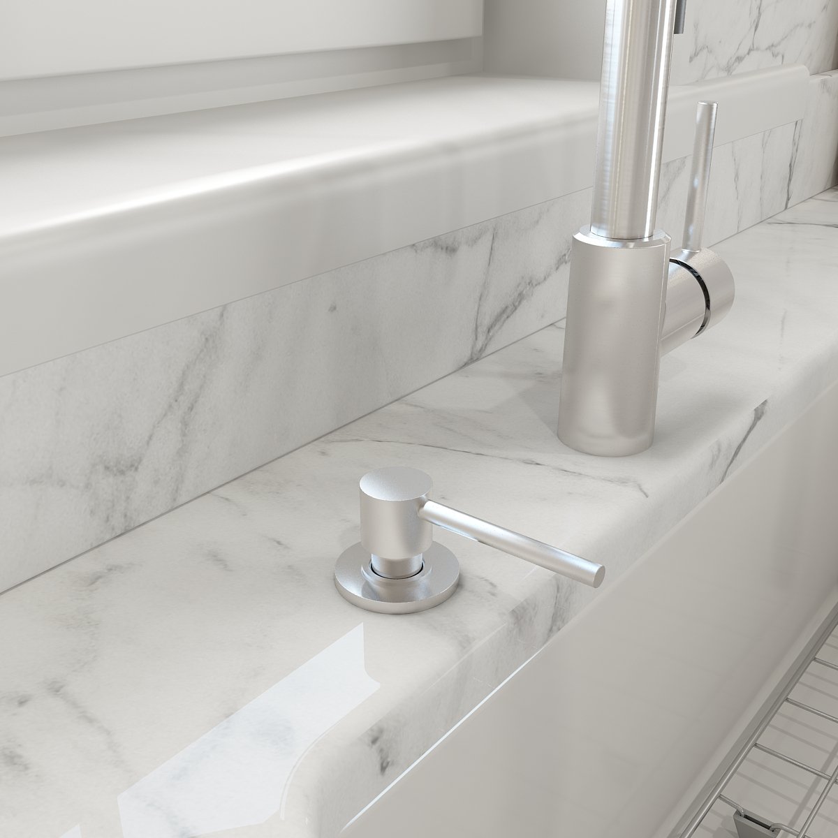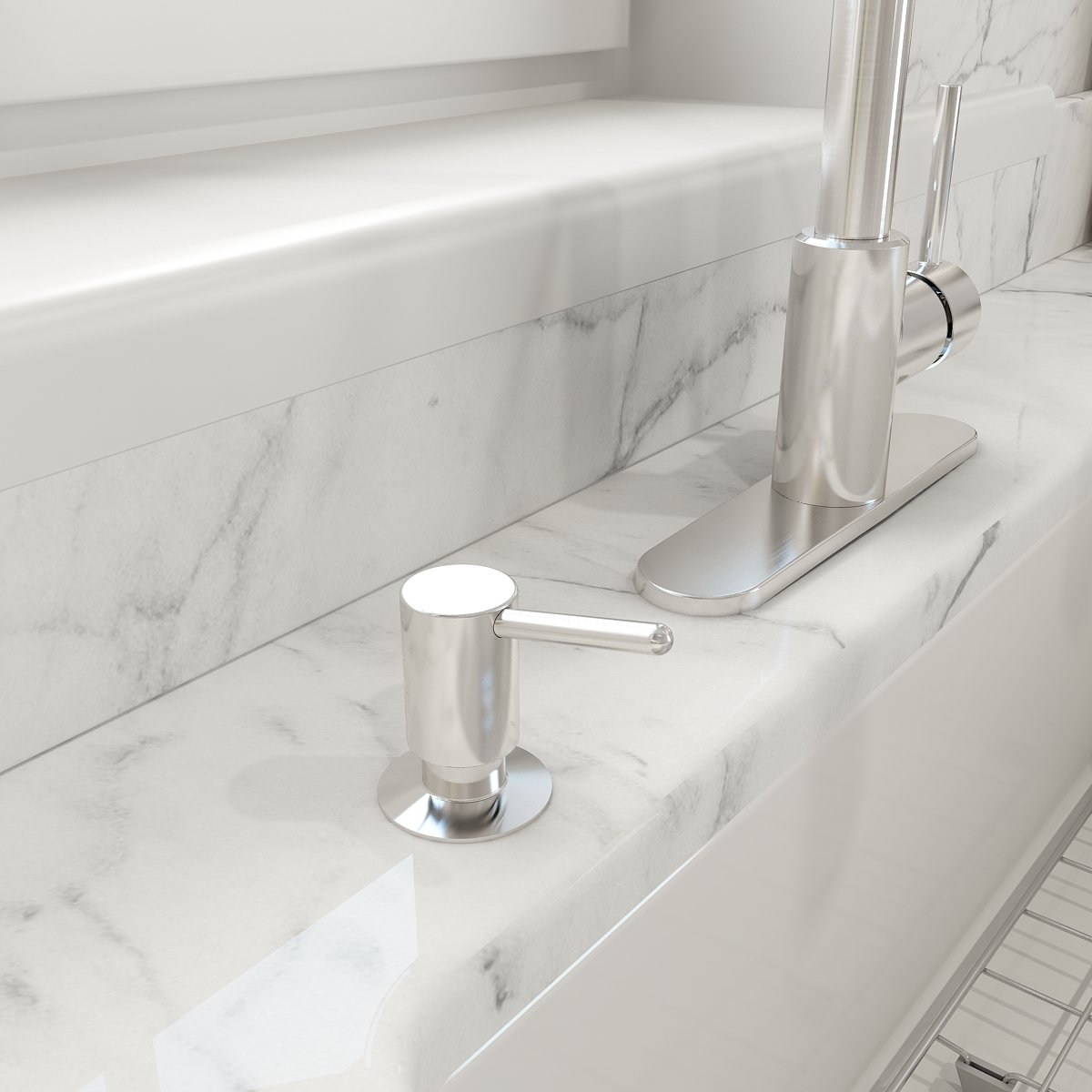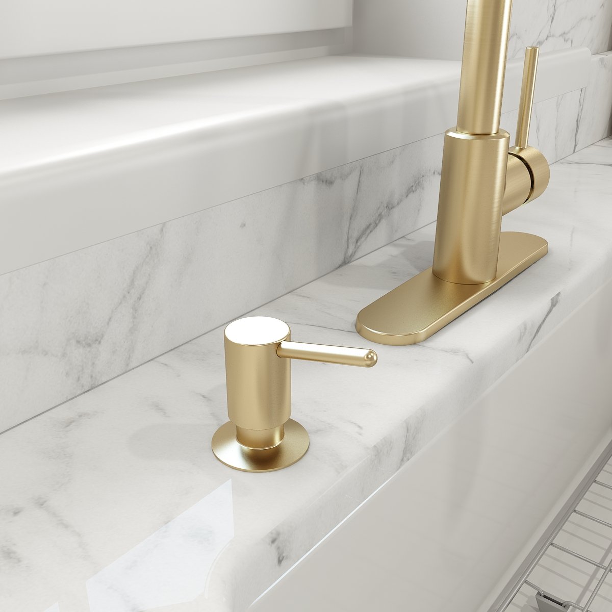 Brass soap dispenser can dicharge liquid soap, dishwashing liquid, or hand lotion in a convenient dispenser with a traditional design matching BOCCHI kitchen faucets. The self-priming pump is constructed from 100% lead-free brass for maximum durability. The pump swivels 360° and is refillable from above for added convenience.
