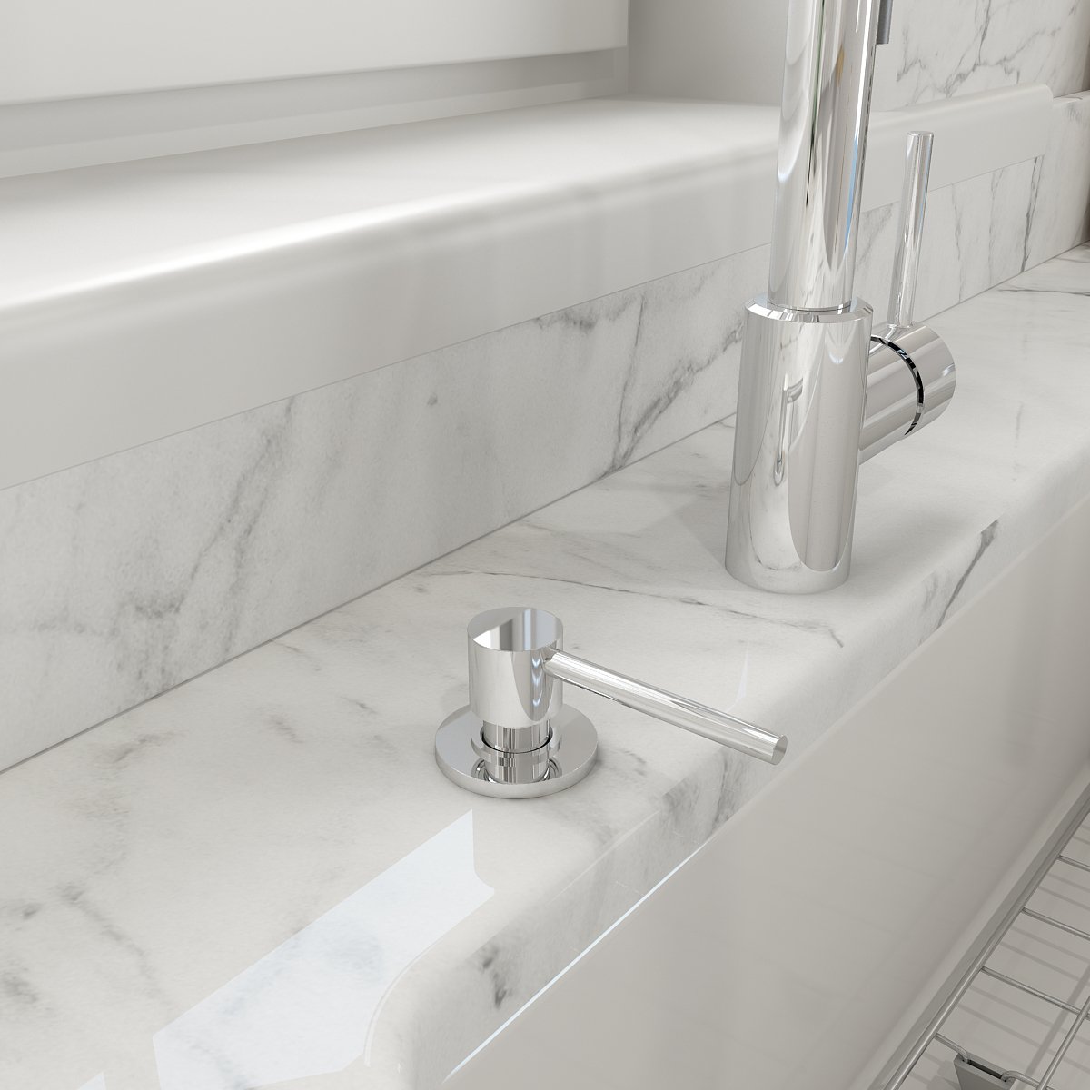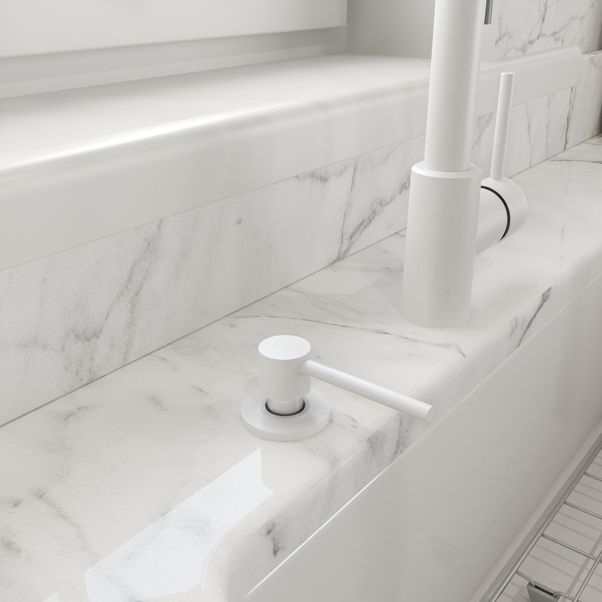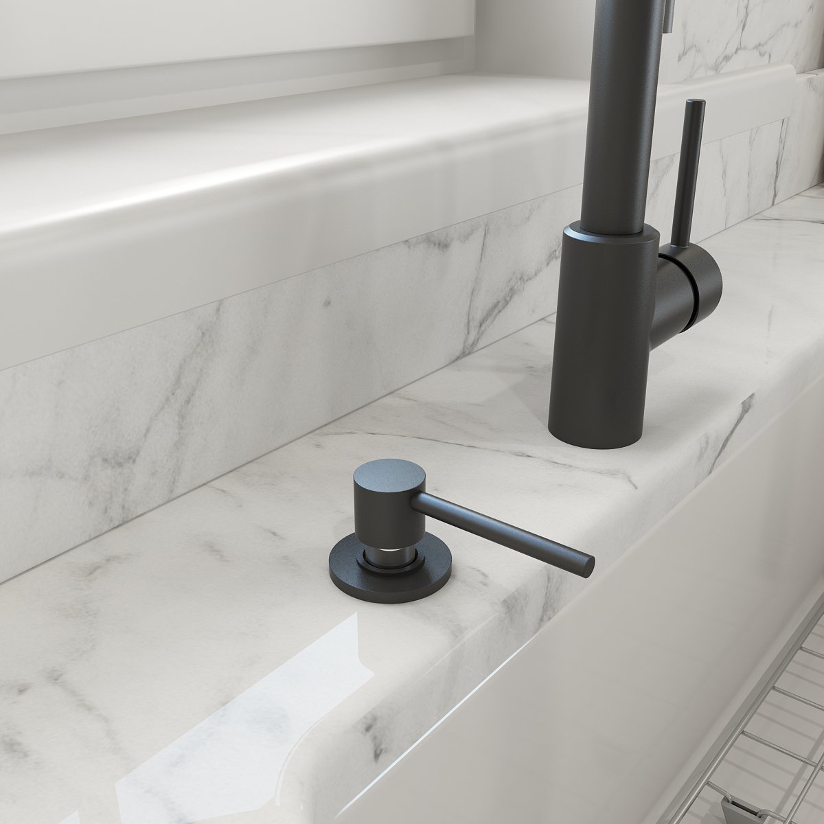 Brass soap dispenser can dicharge liquid soap, dishwashing liquid, or hand lotion in a convenient dispenser with a traditional design matching BOCCHI kitchen faucets. The self-priming pump is constructed from 100% lead-free brass for maximum durability. The pump swivels 360° and is refillable from above for added convenience.