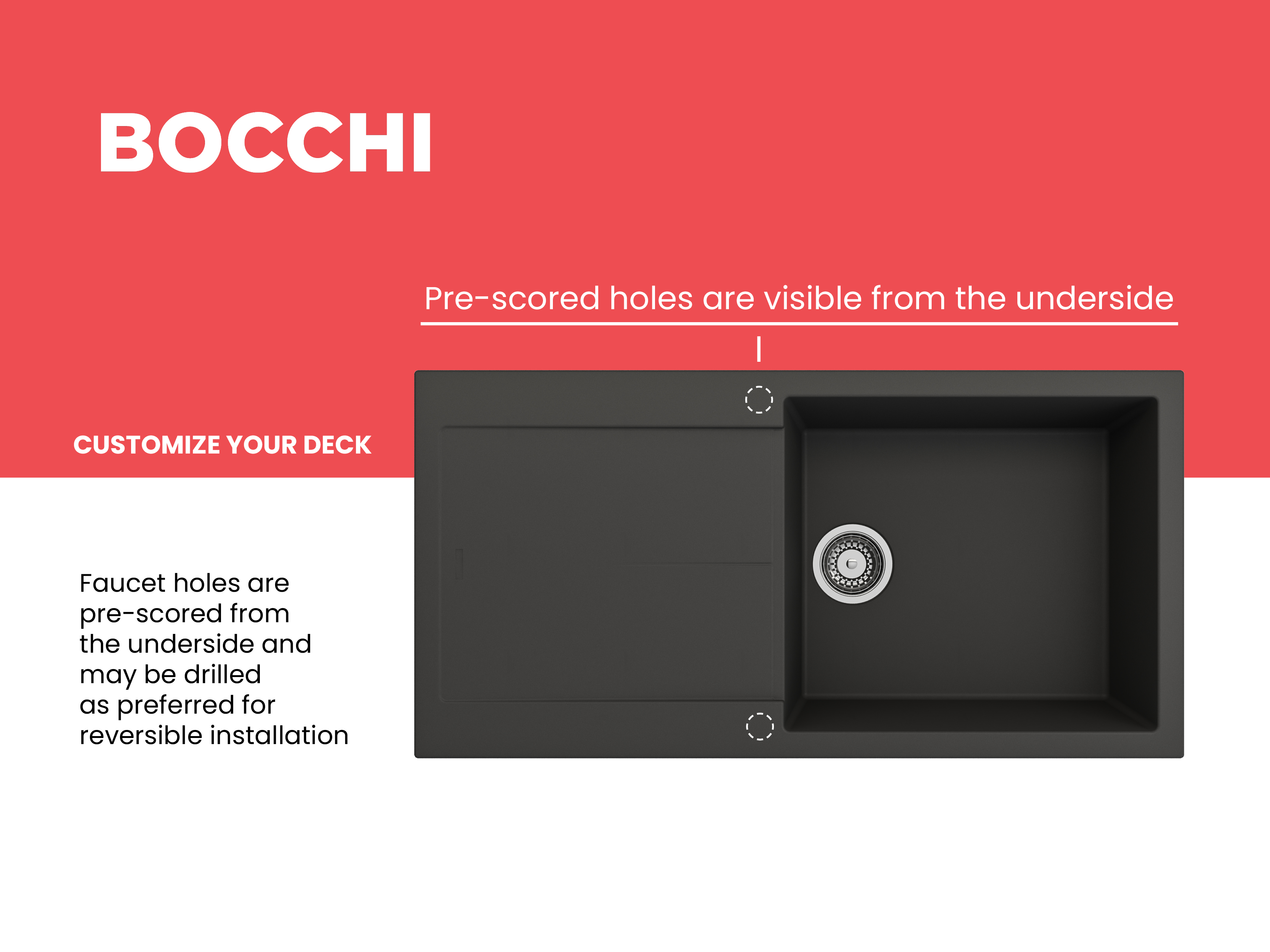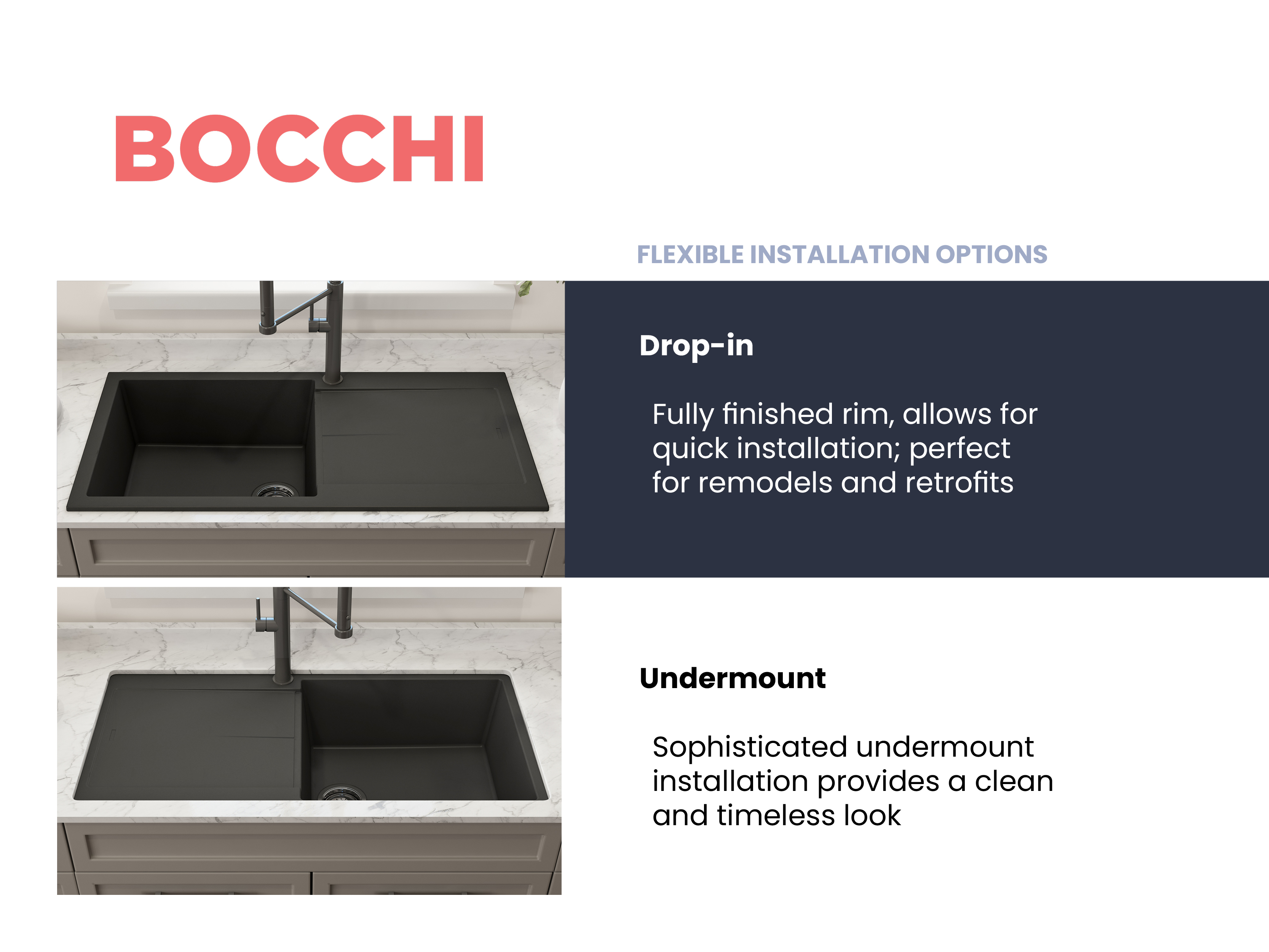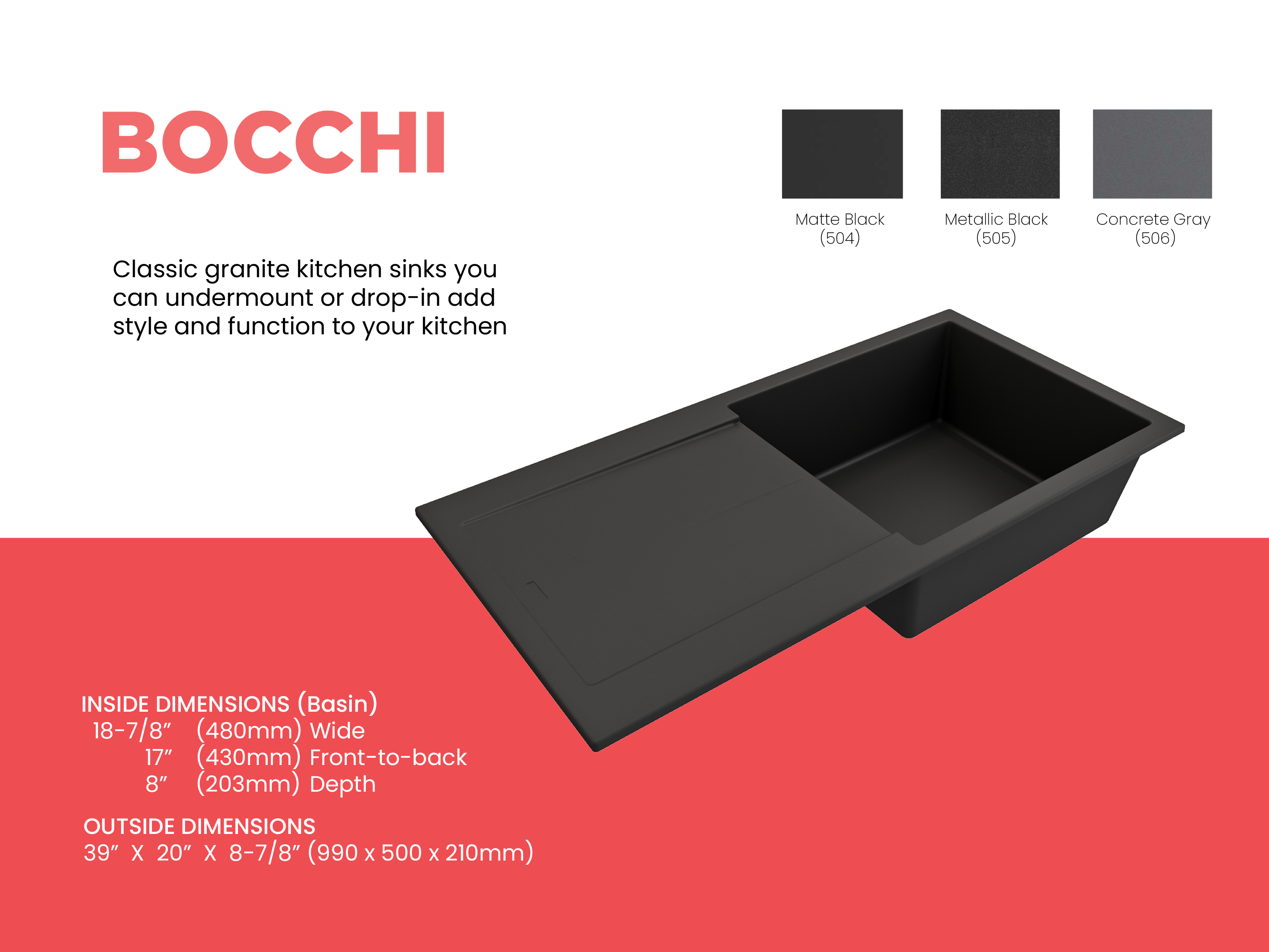 BOCCHI Granite Sinks bring a timeless, durable and all-natural material to your home with all the latest in technology and style. Crafted in Italy, BOCCHI Granite Sinks are anti-bacterial, odor neutralizing, impact and scratch proof and won’t discolor due to sun while resisting stains and other buildup. Unique installation options allow homeowners to choose their style and personalize their homes.