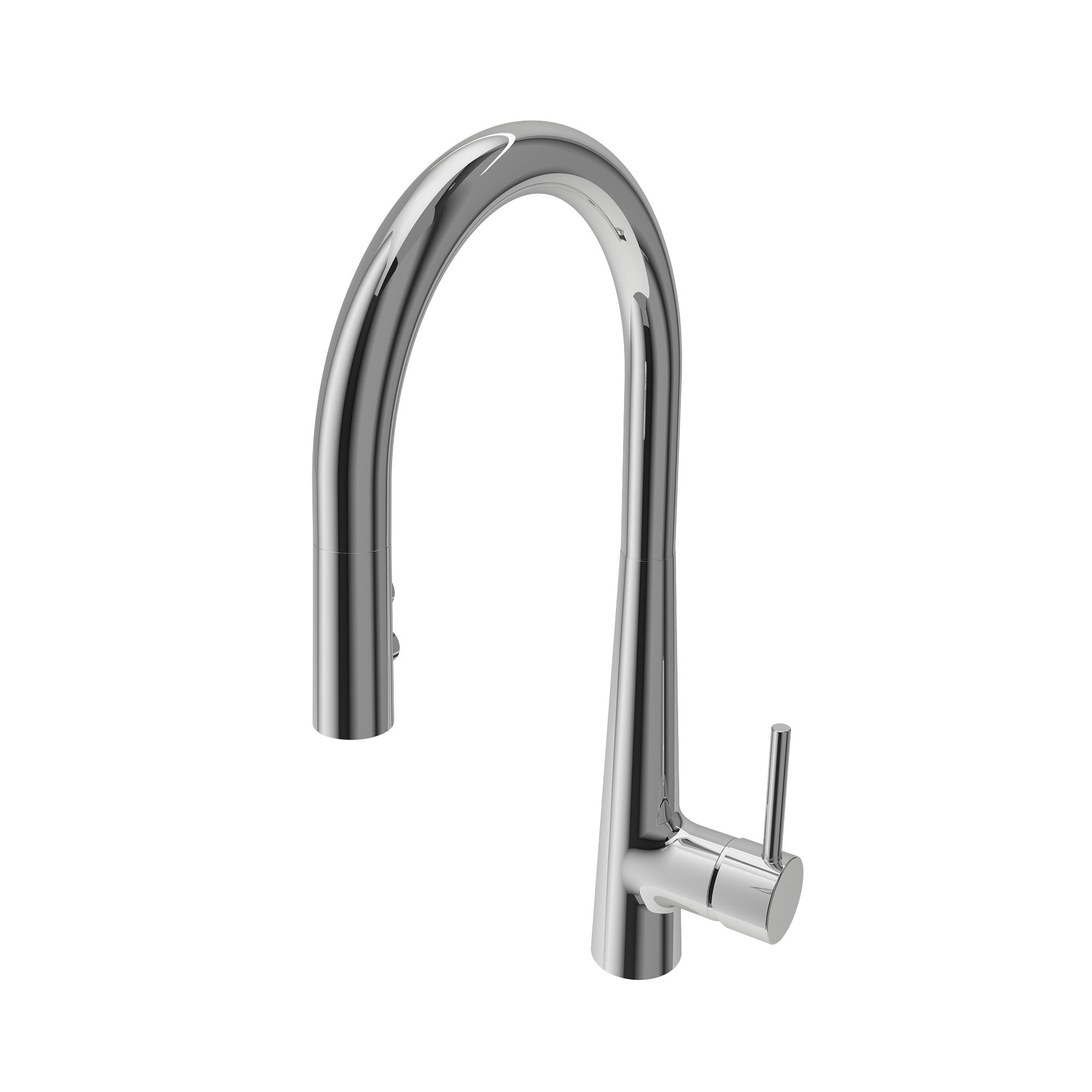 Pull-down kitchen faucet with ceramic cartridges and brass body. Features standard or needle spray with weighted shower hose.