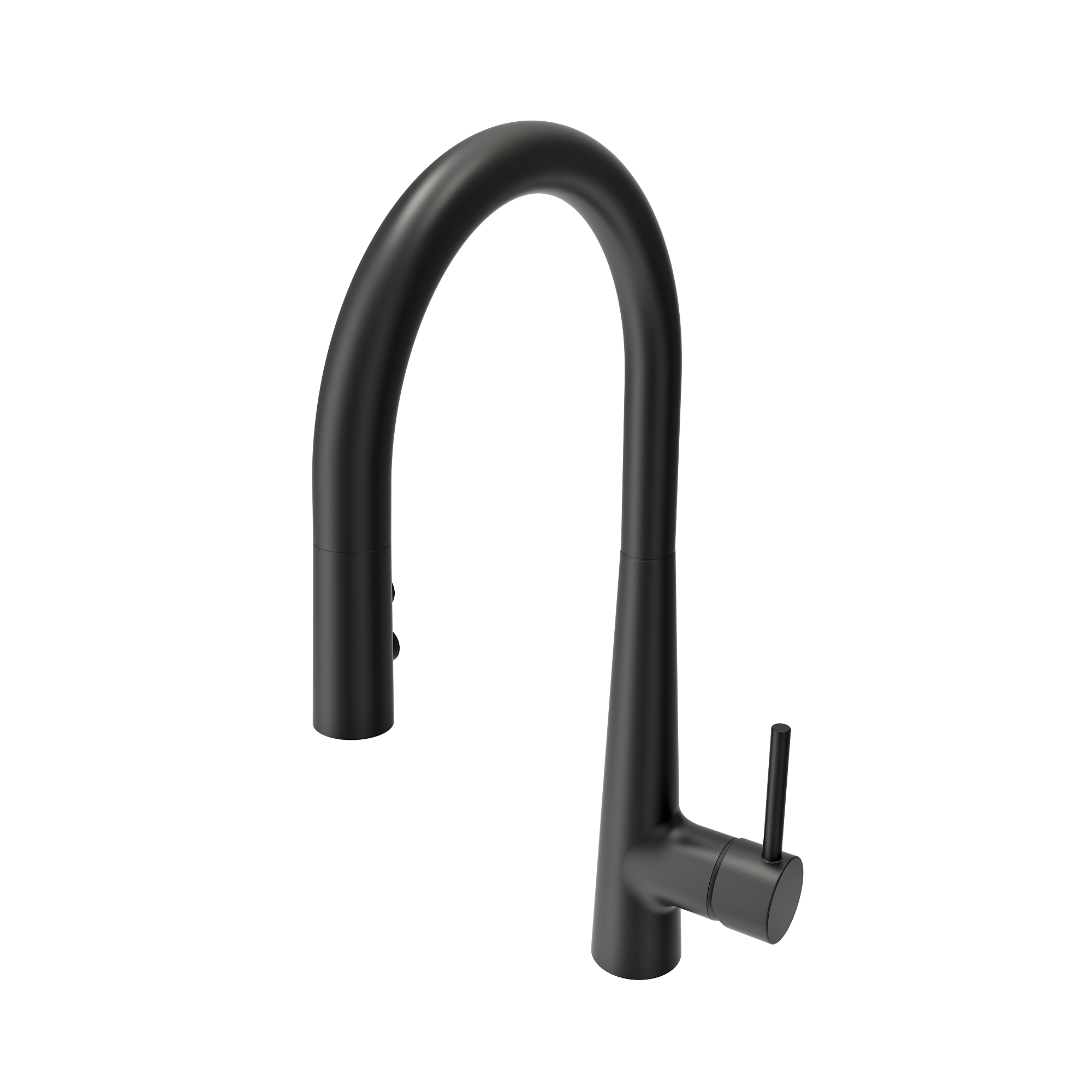 Pull-down kitchen faucet with ceramic cartridges and brass body. Features standard or needle spray with weighted shower hose.