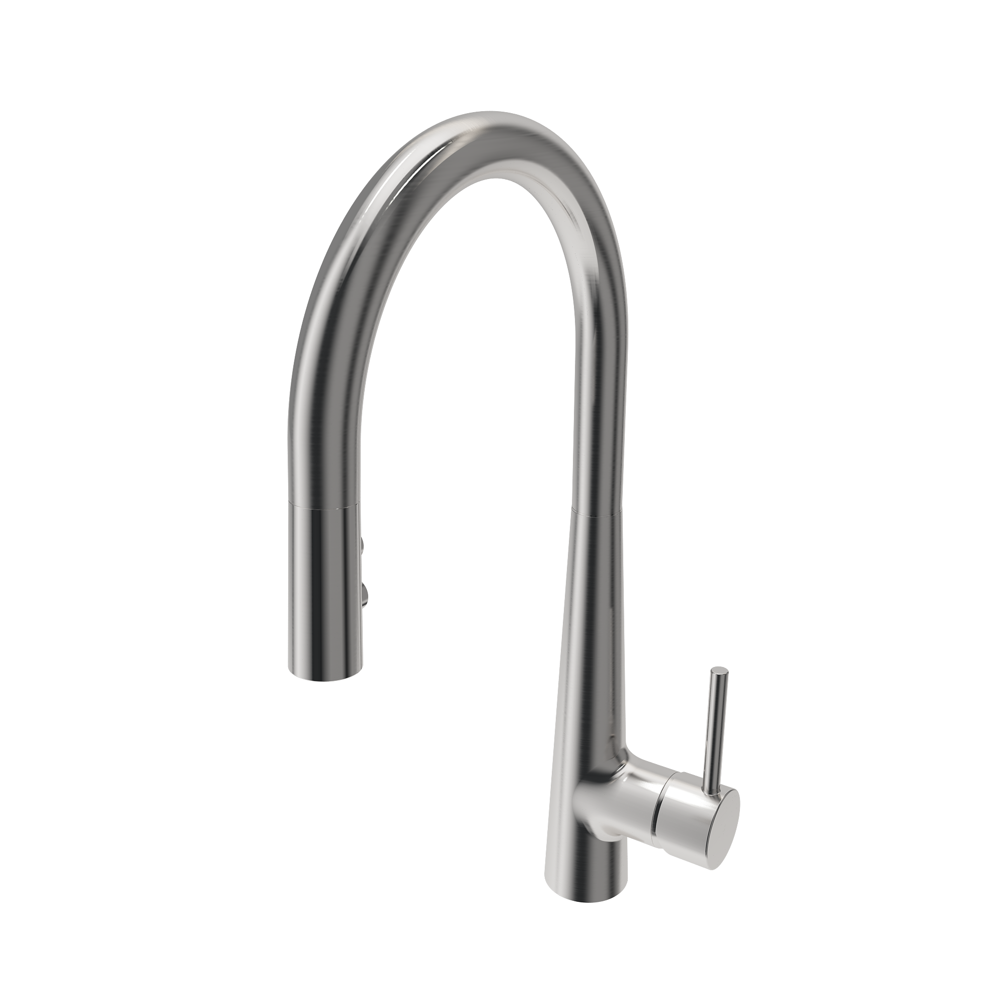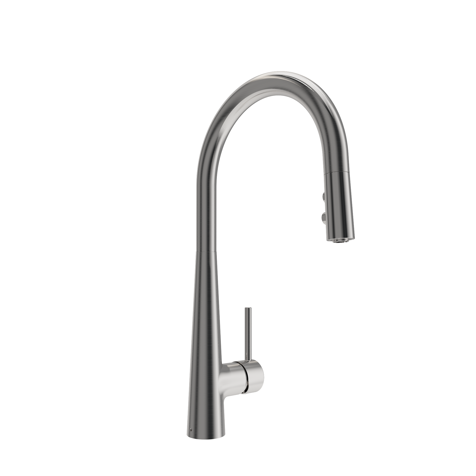 Pull-down kitchen faucet with ceramic cartridges and brass body. Features standard or needle spray with weighted shower hose.