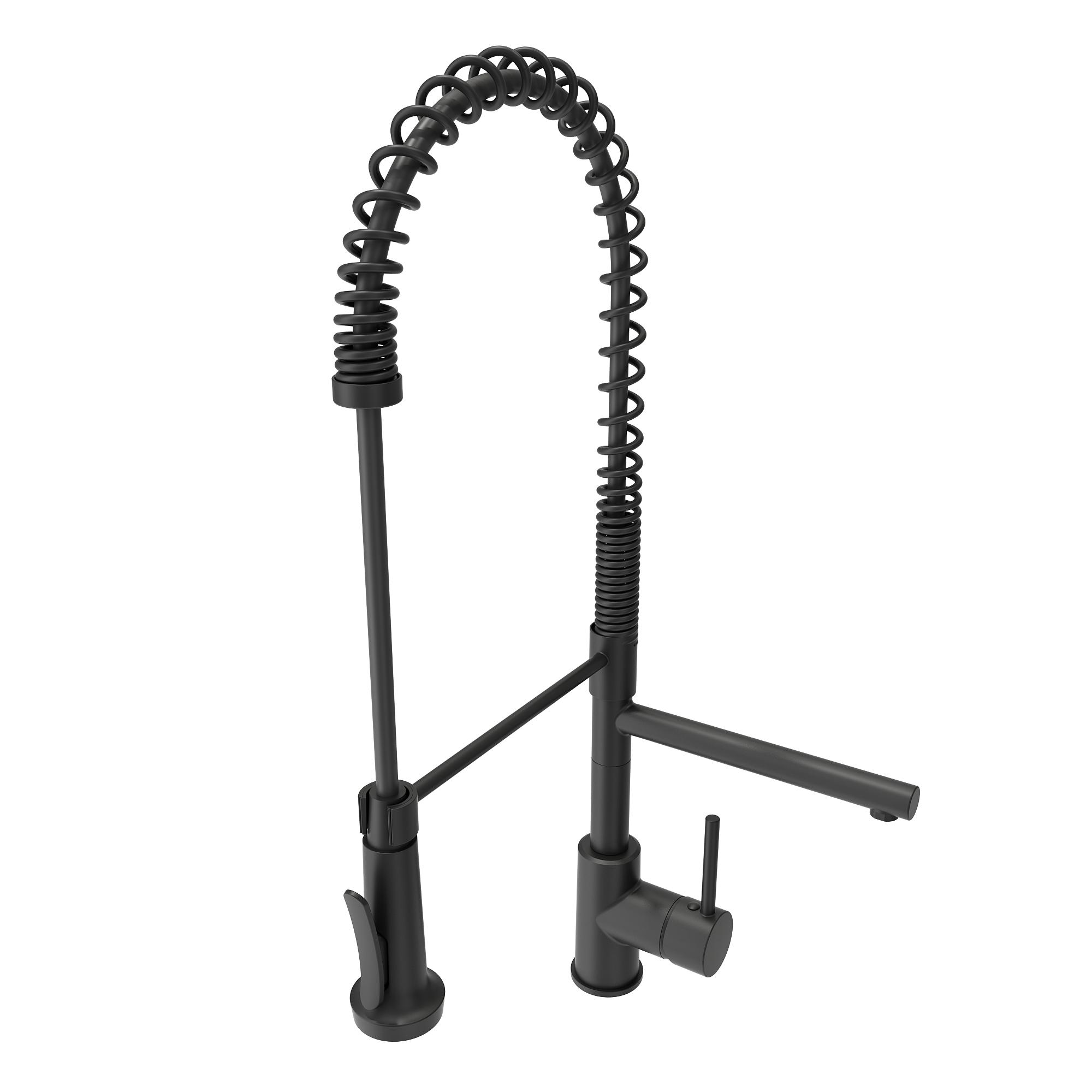 Dual-spout professional kitchen faucet with ceramic cartridges and brass body. Features needle spray with flexible, weighted shower hose.