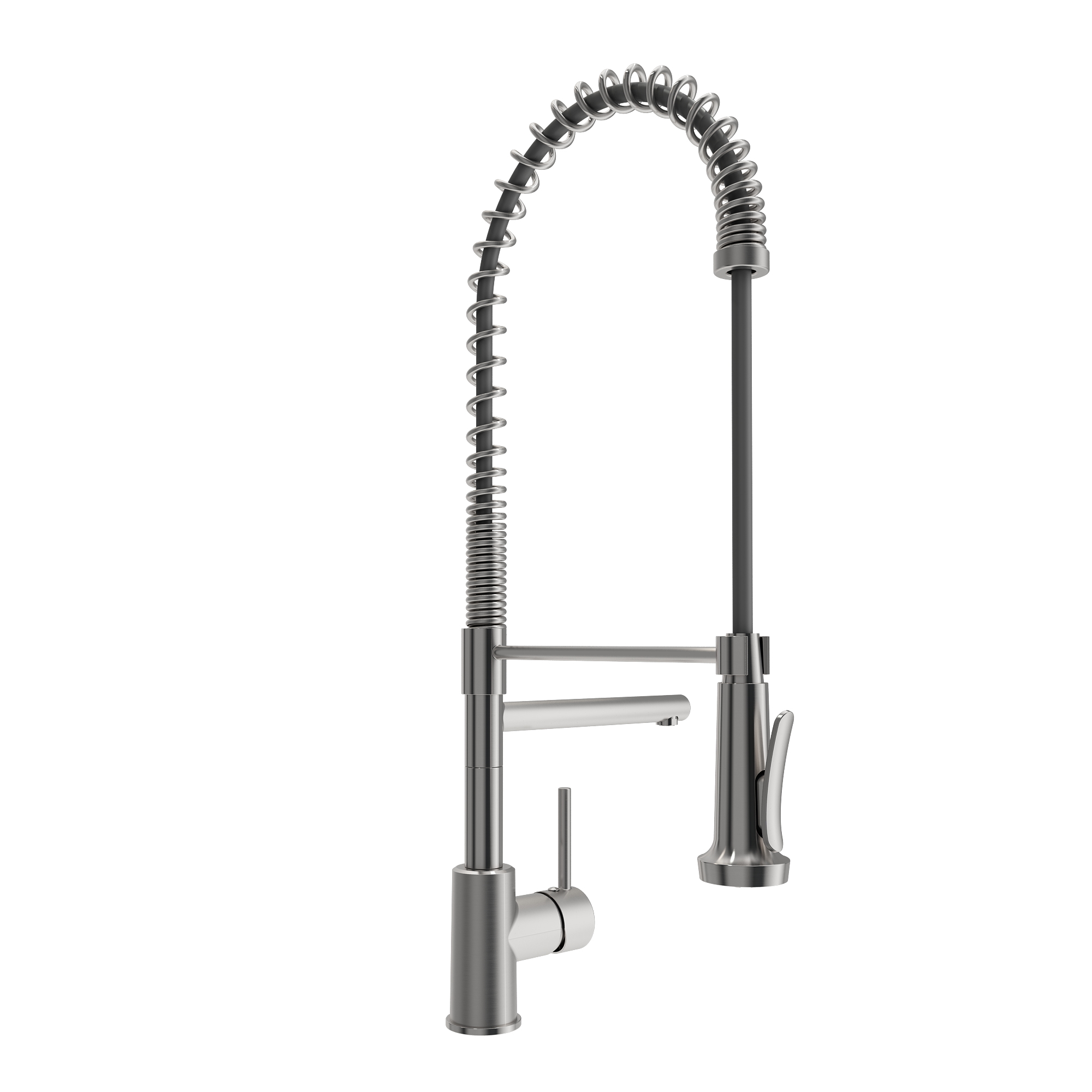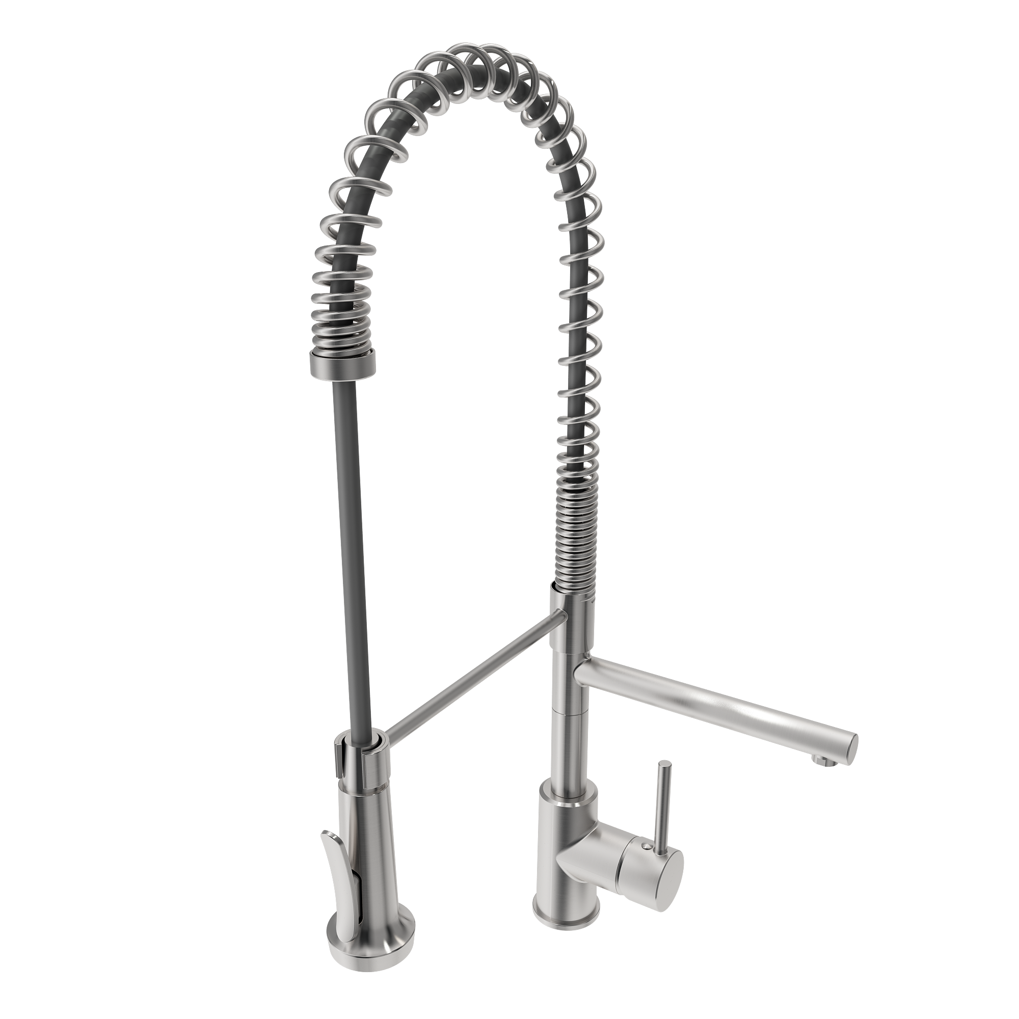 Dual-spout professional kitchen faucet with ceramic cartridges and brass body. Features needle spray with flexible, weighted shower hose.
