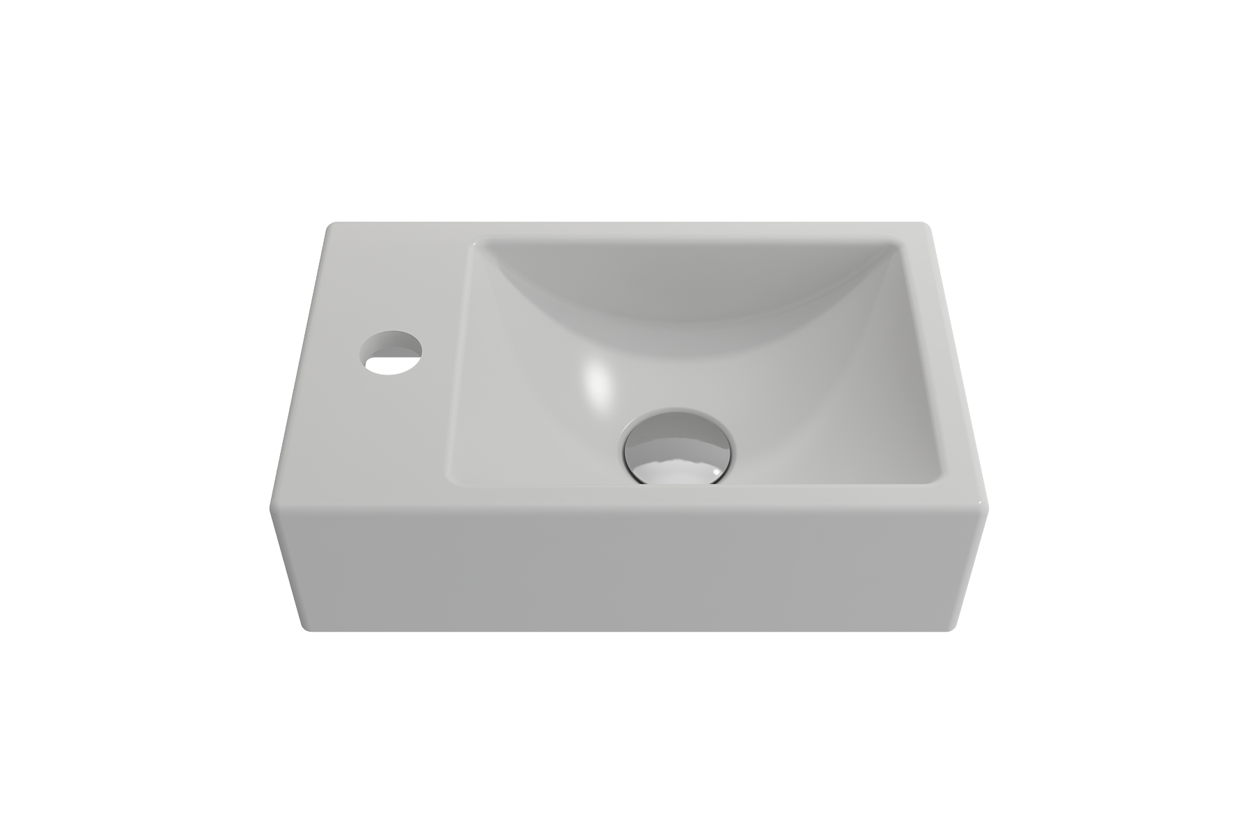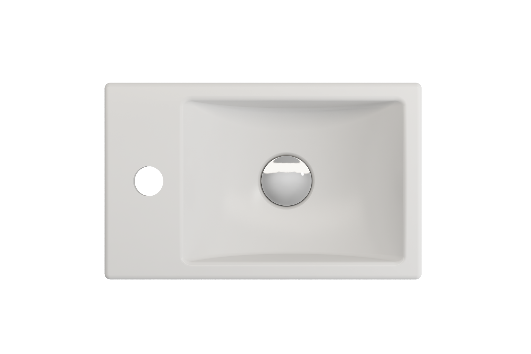 Petite wall-hung sink with single-hole faucet on left-side-facing. May be set on counter as a vessel.