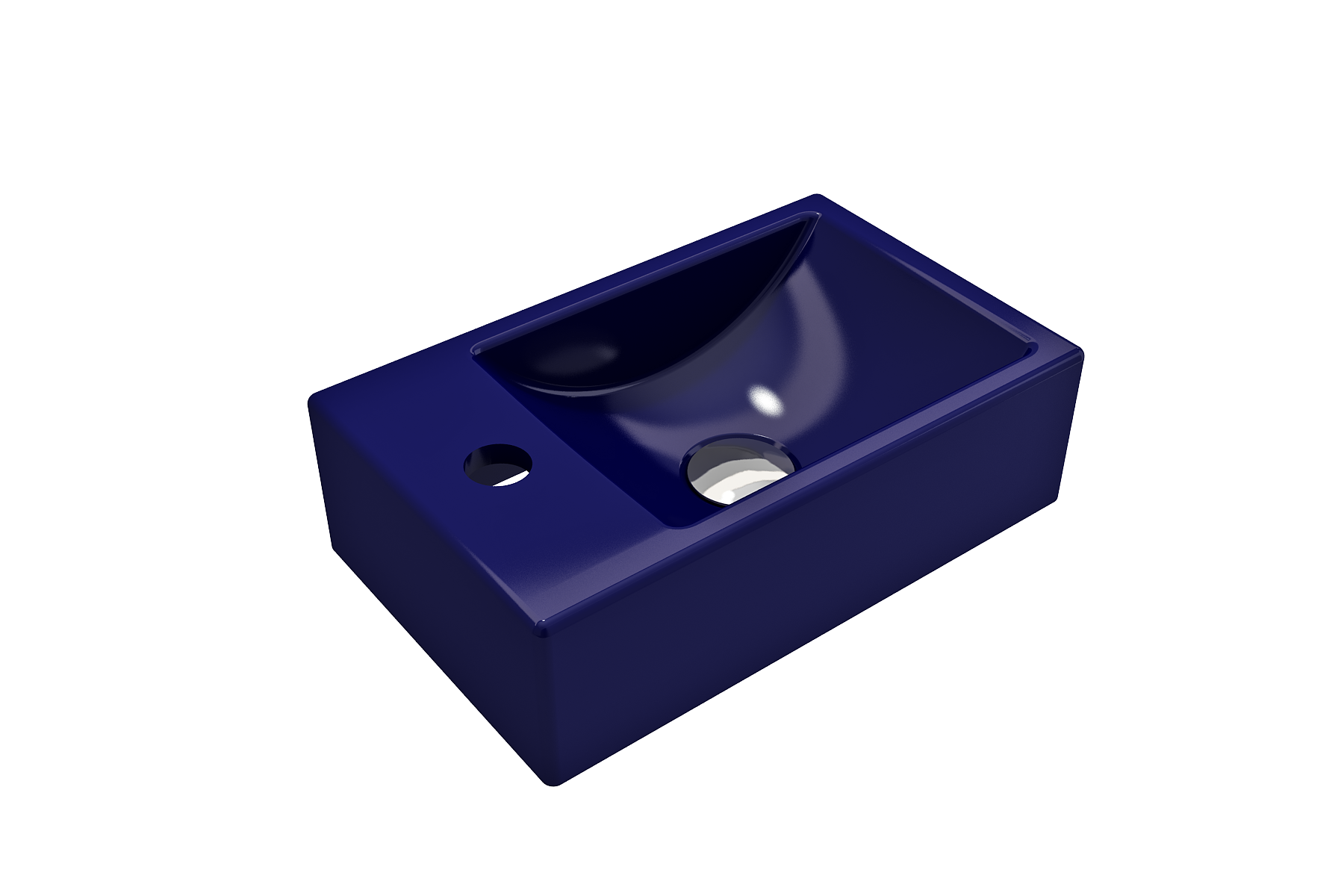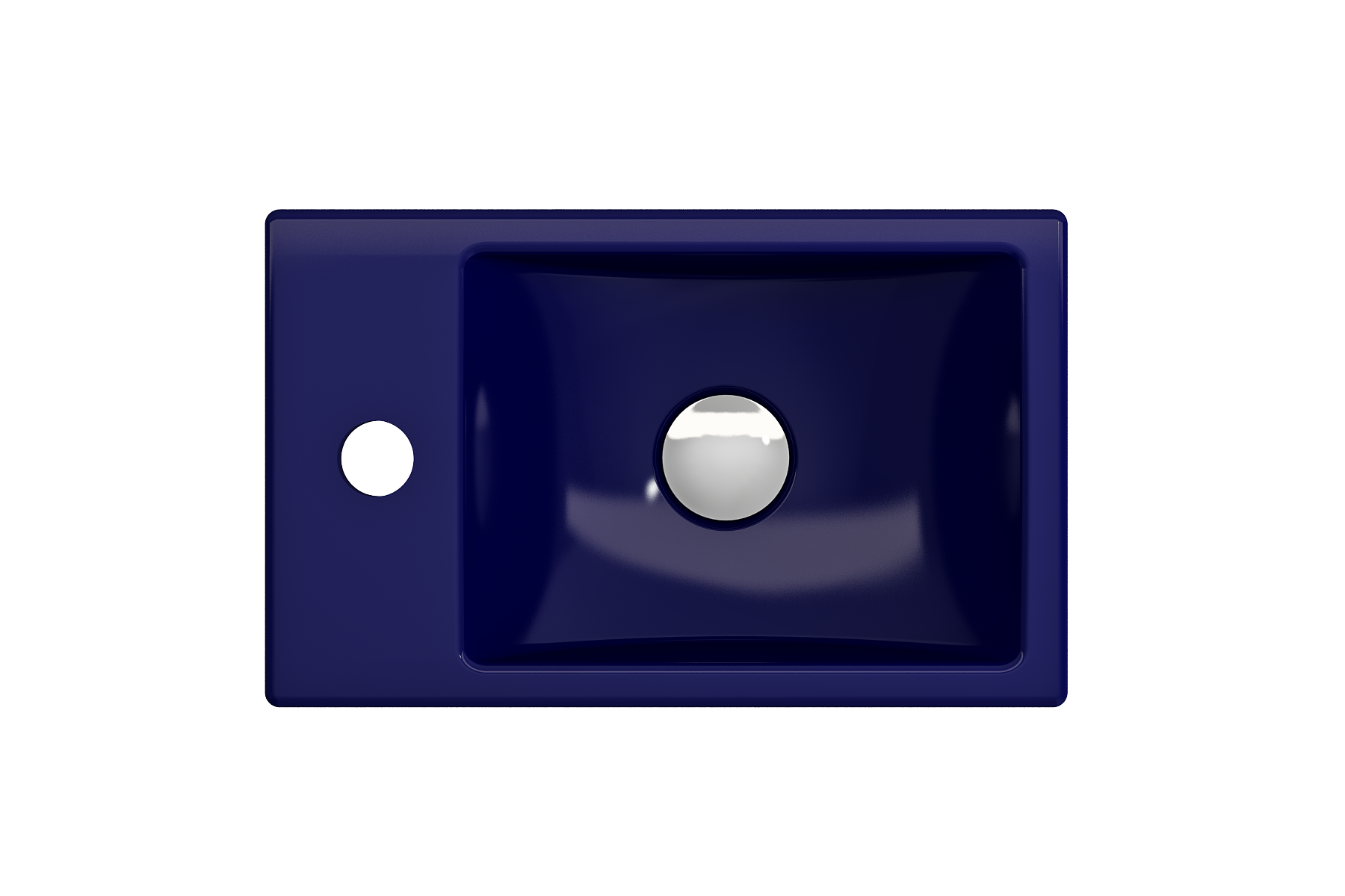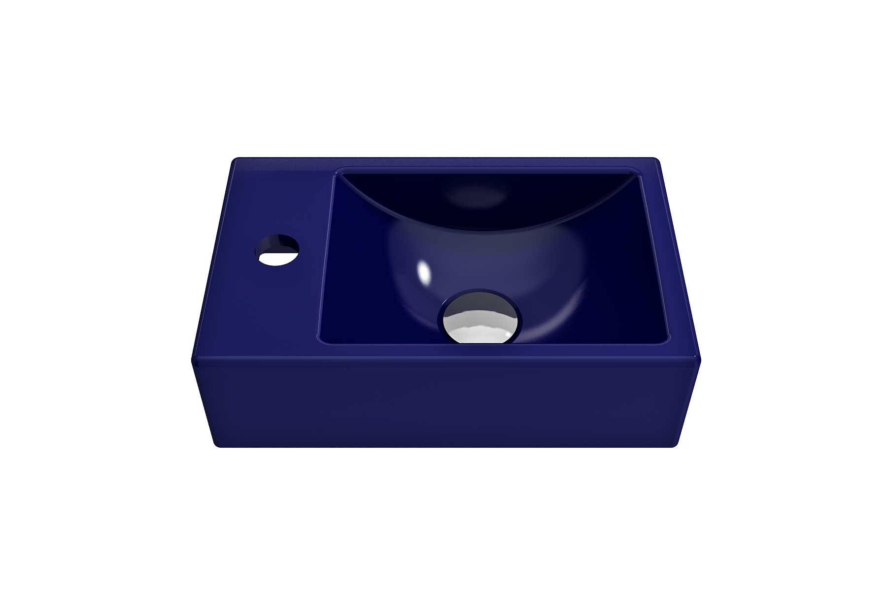 Petite wall-hung sink with single-hole faucet on left-side-facing. May be set on counter as a vessel.