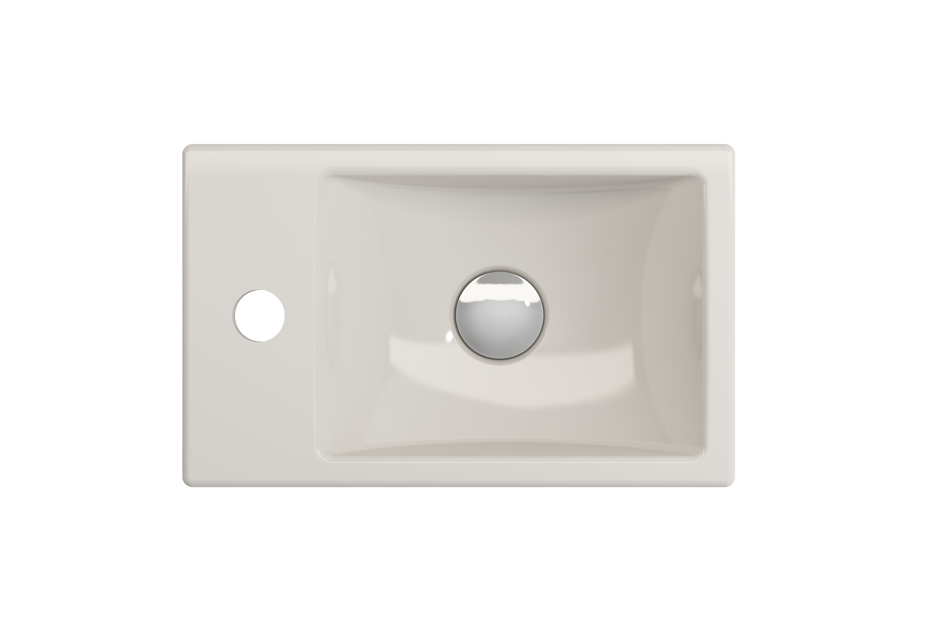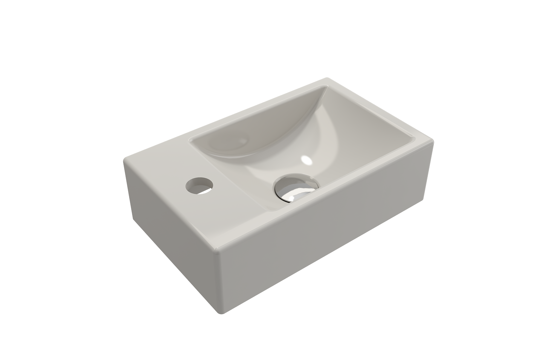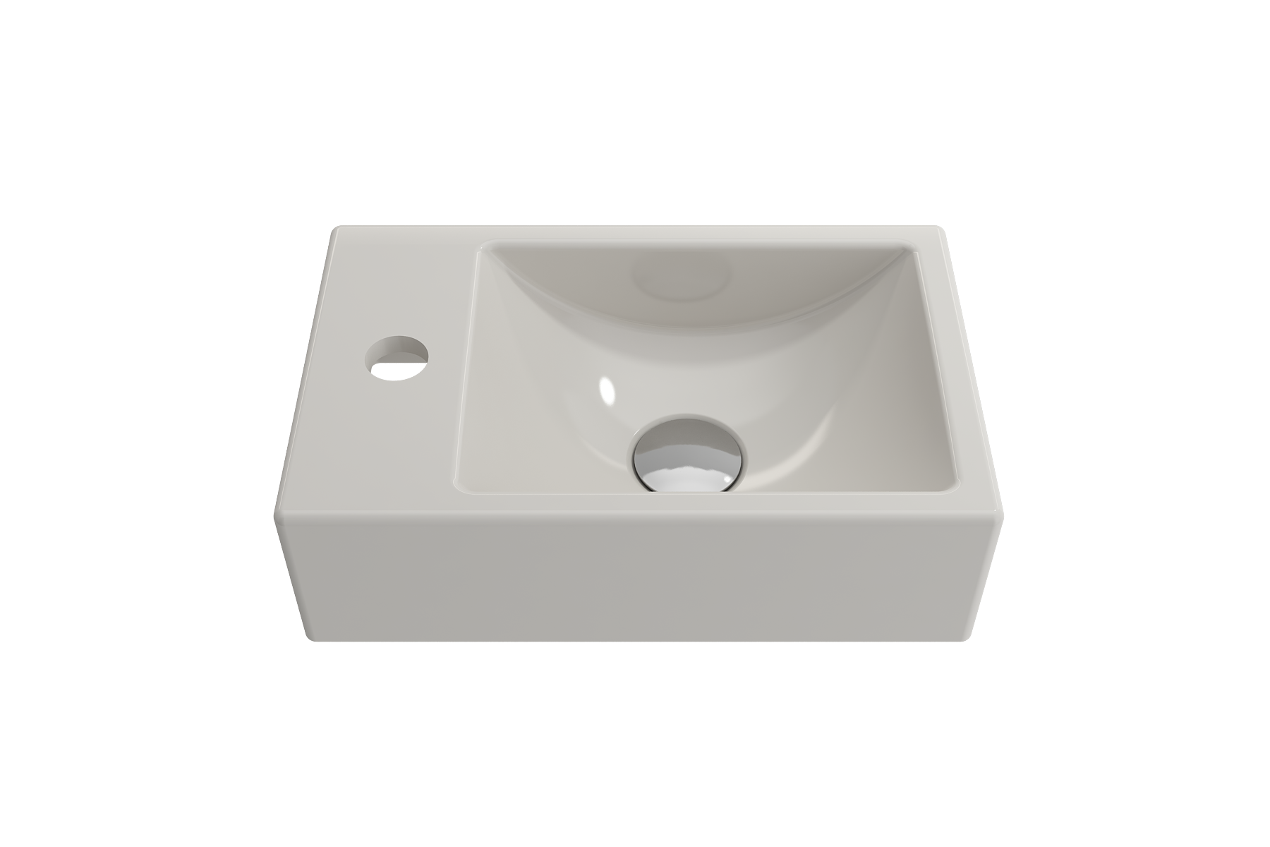 Petite wall-hung sink with single-hole faucet on left-side-facing. May be set on counter as a vessel.