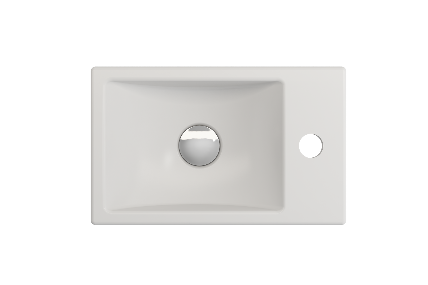 Petite wall-hung sink with single-hole faucet on right-side-facing. May be set on counter as a vessel.