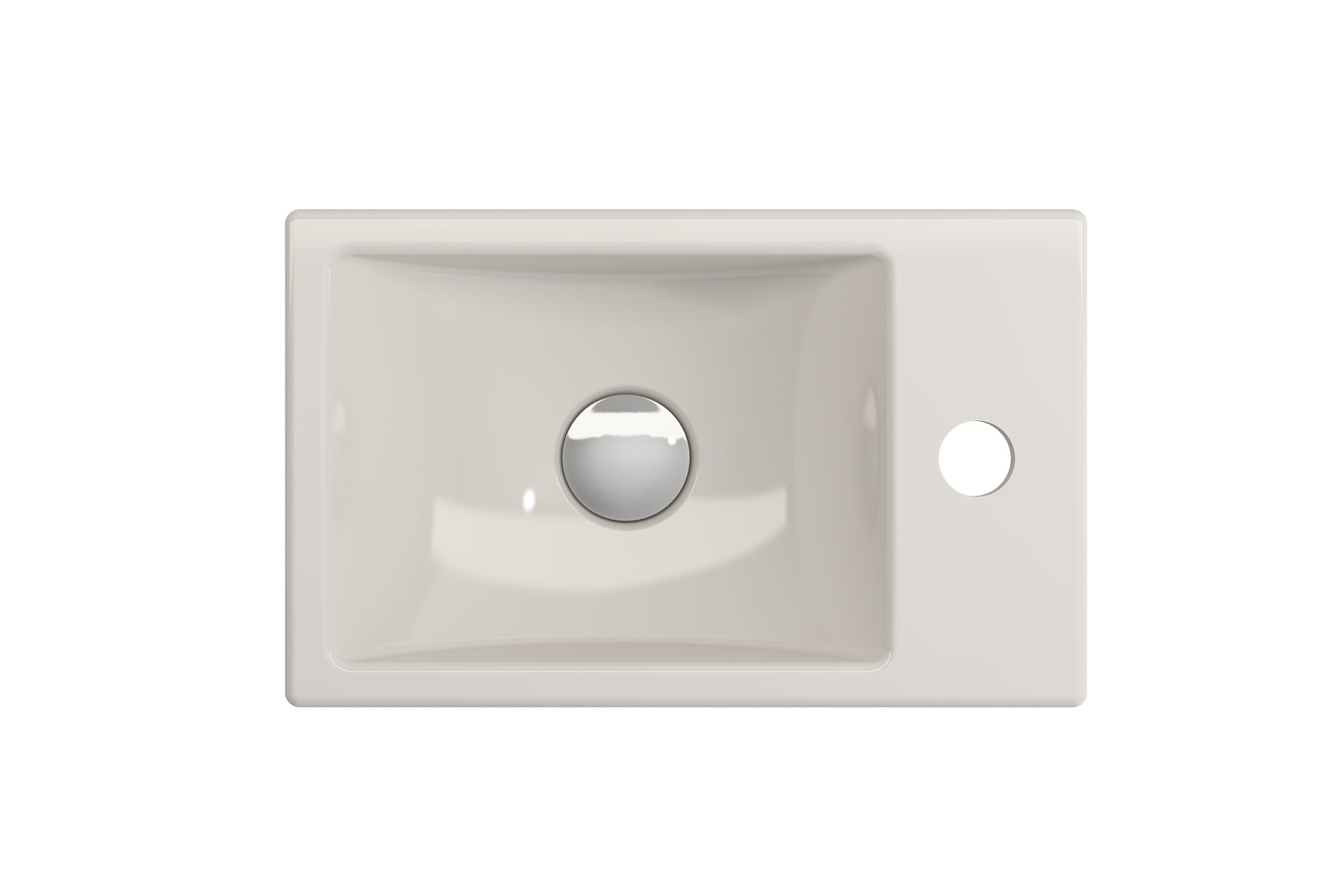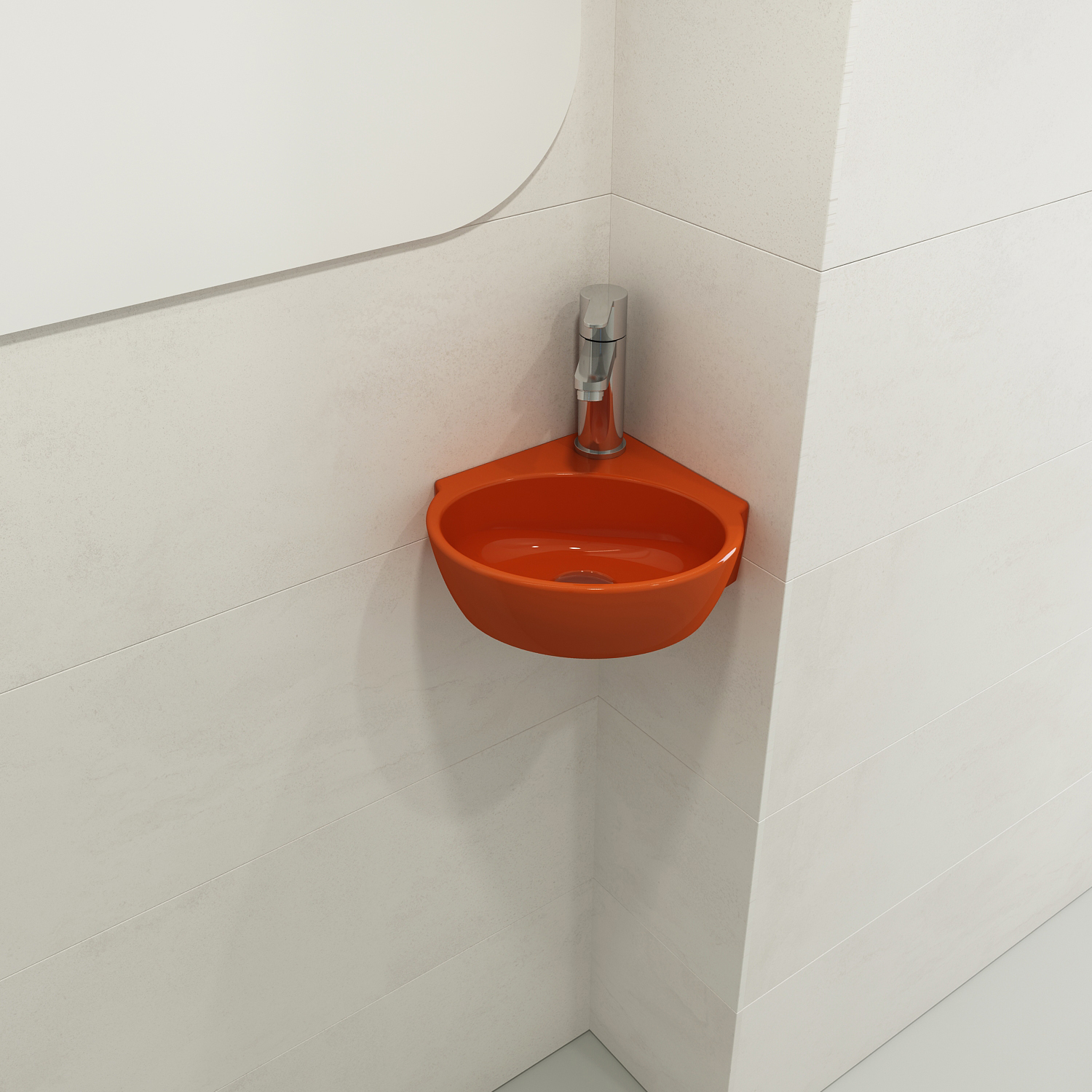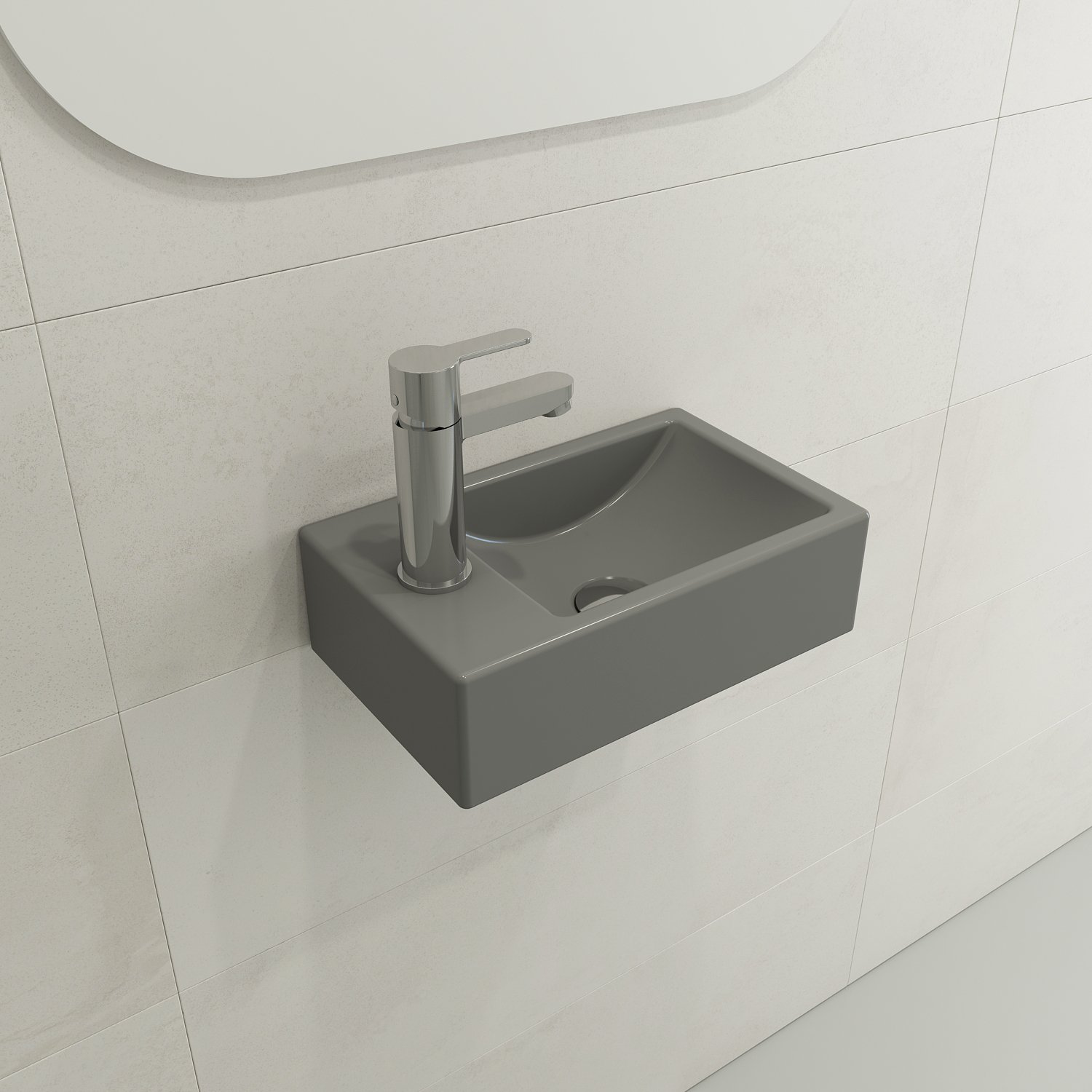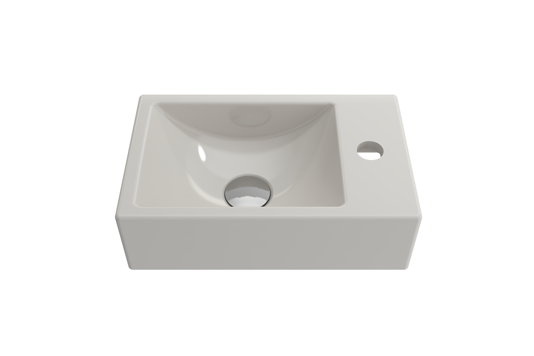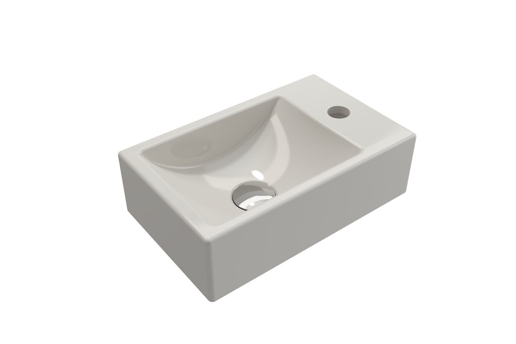 Petite wall-hung sink with single-hole faucet on right-side-facing. May be set on counter as a vessel.