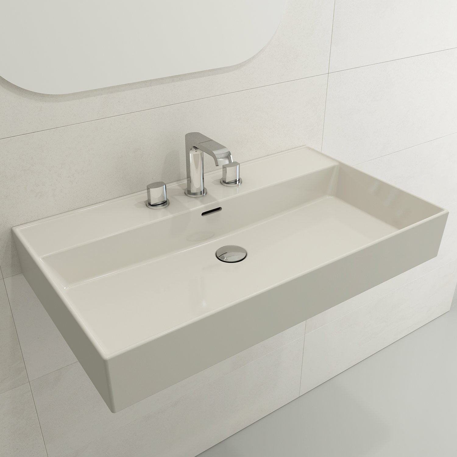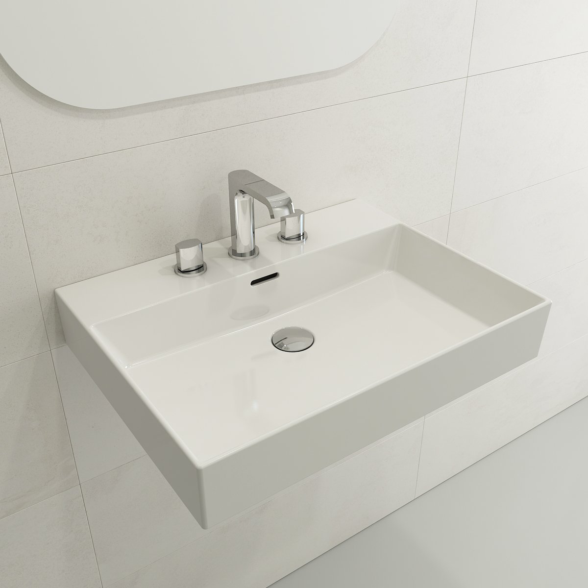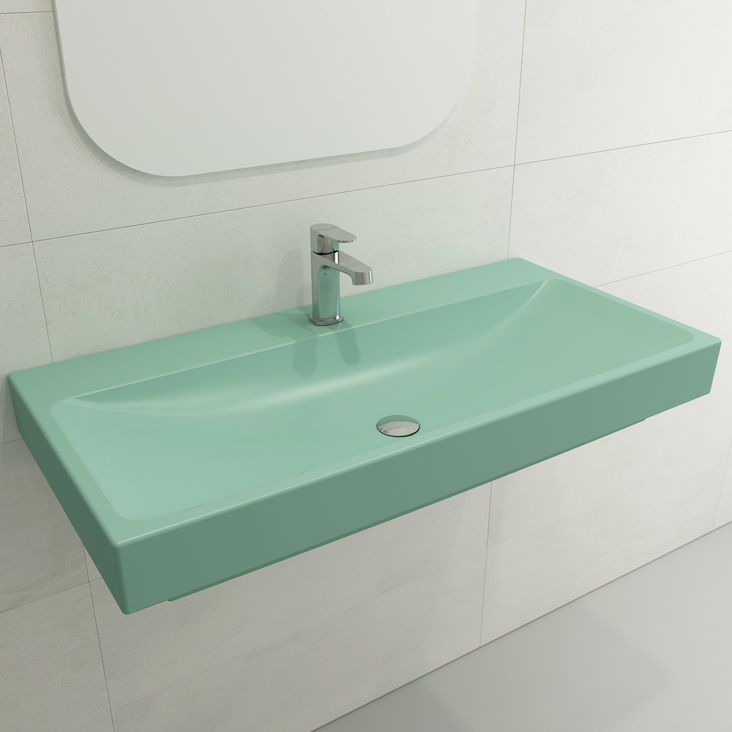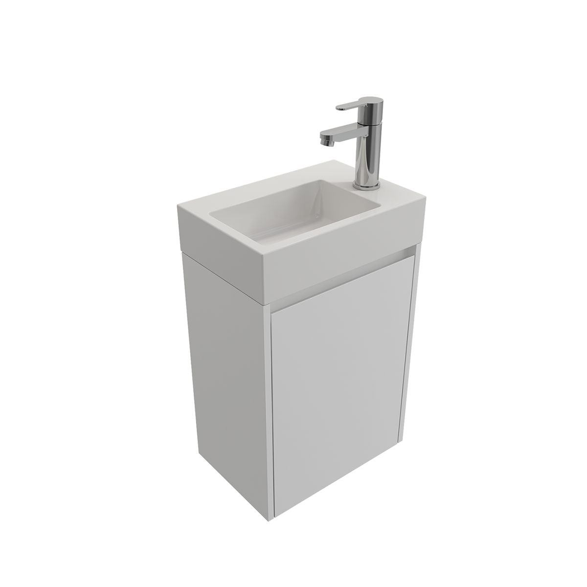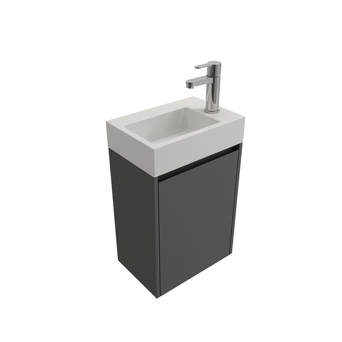 Petite wall-hung sink with single-hole faucet on right-side-facing. May be set on counter as a vessel.