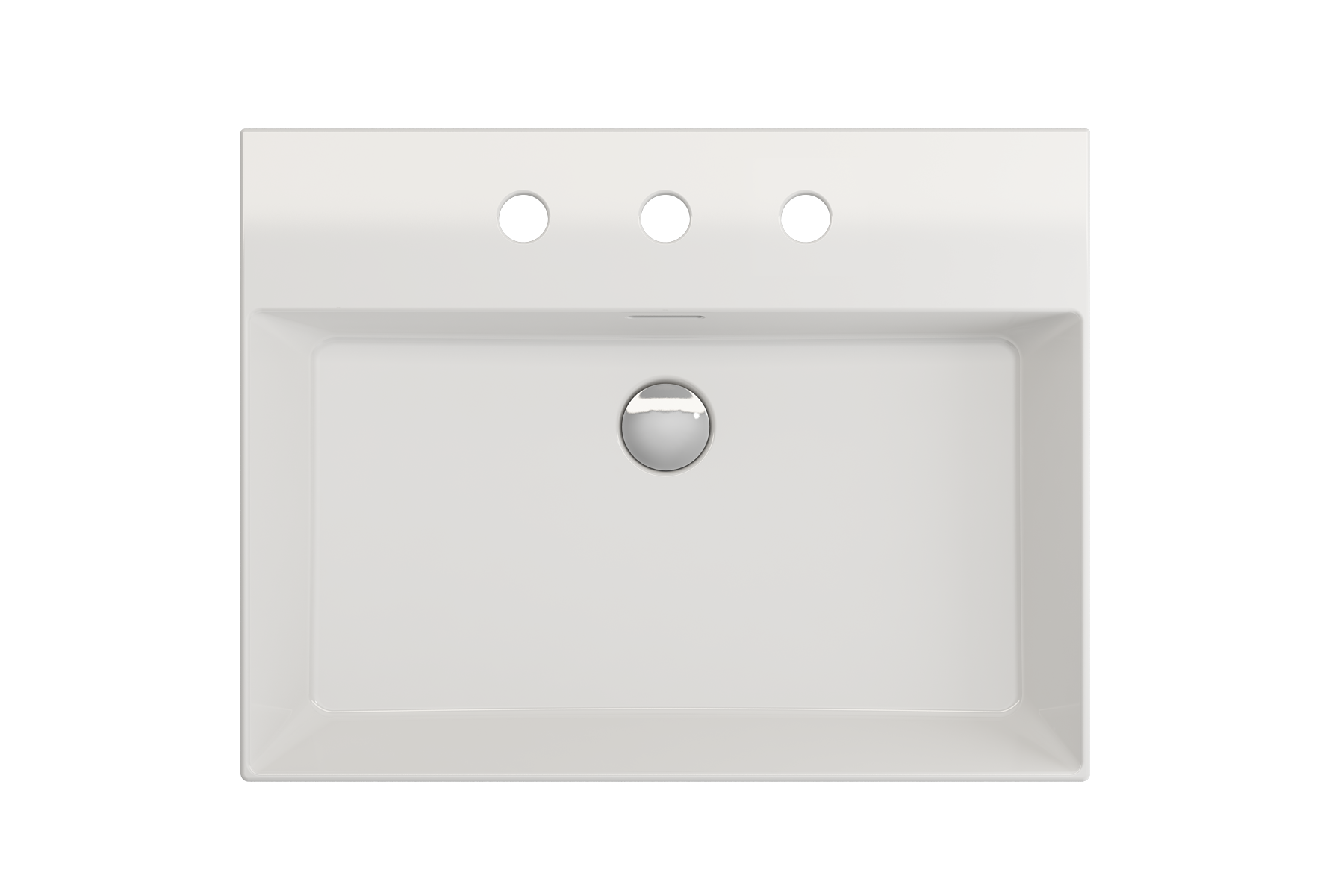 Bathroom sink with 3-hole (in.) faucet setting. May be wall-hung, used with metal console legs, or counterset.