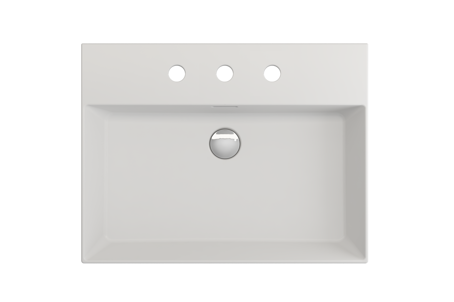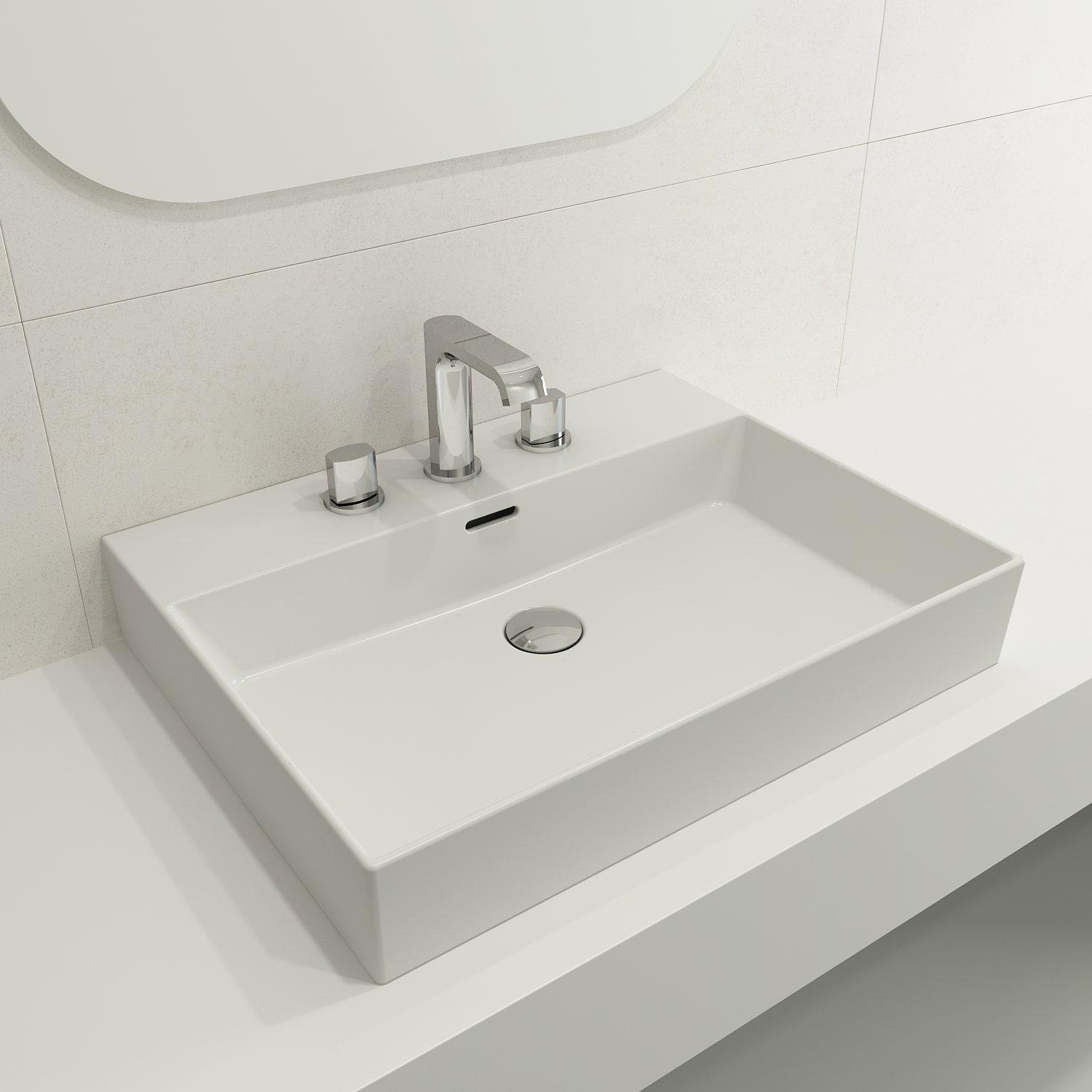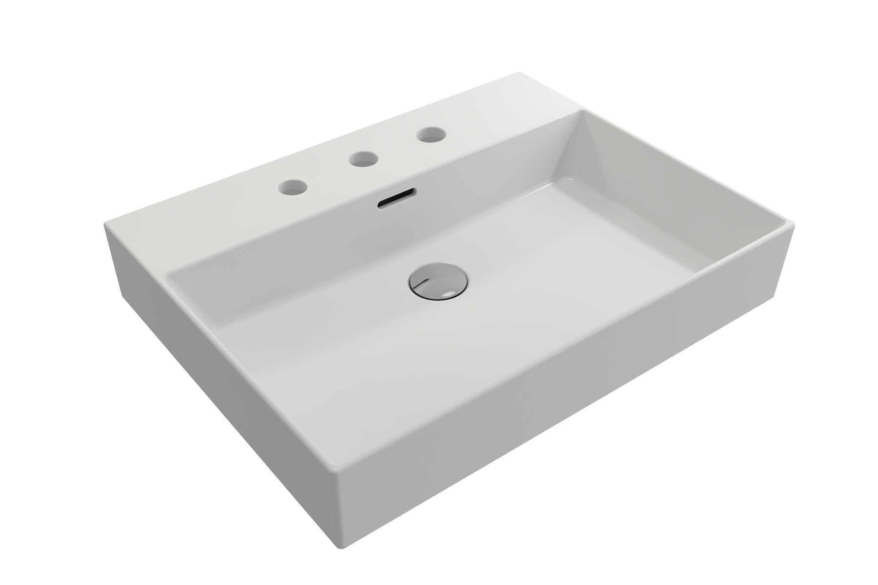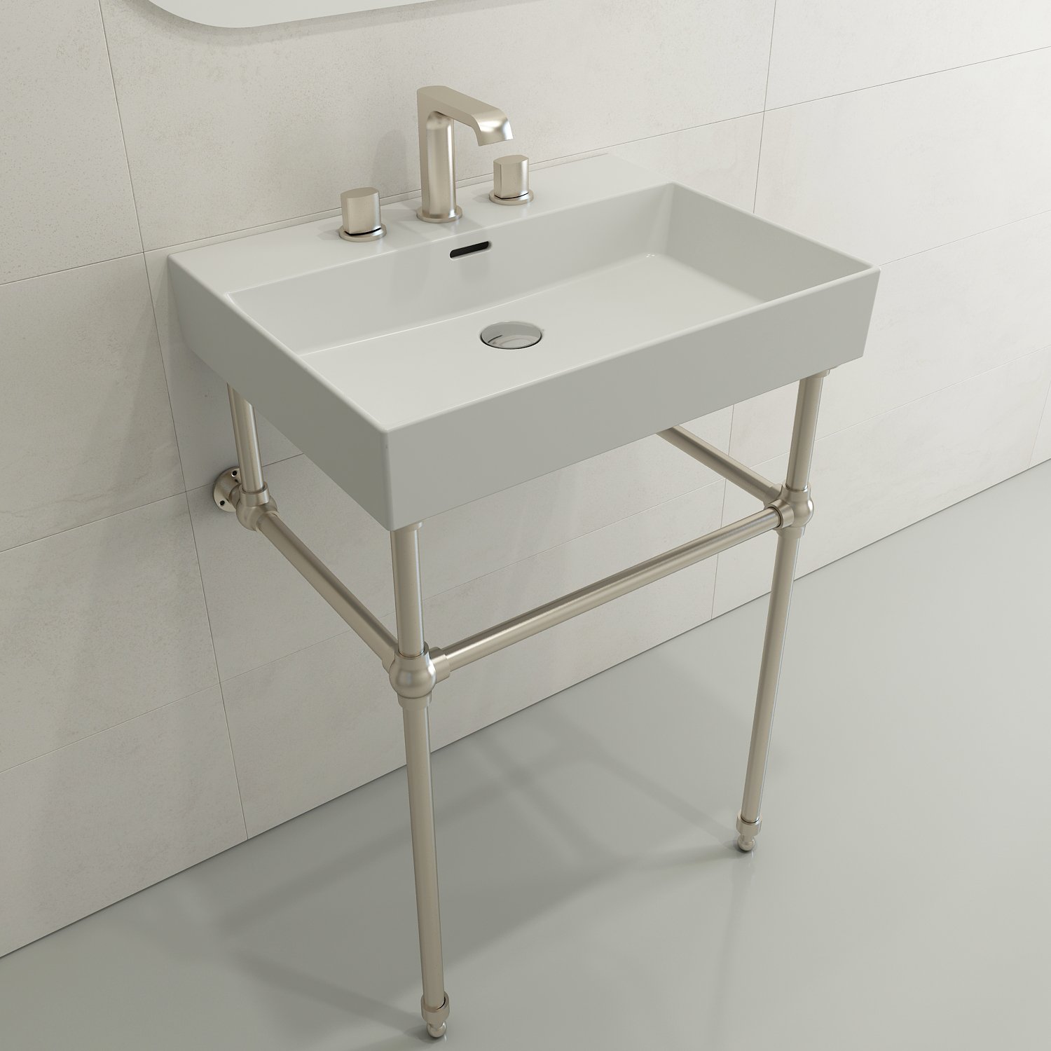 Bathroom sink with 3-hole (in.) faucet setting. May be wall-hung, used with metal console legs, or counterset.