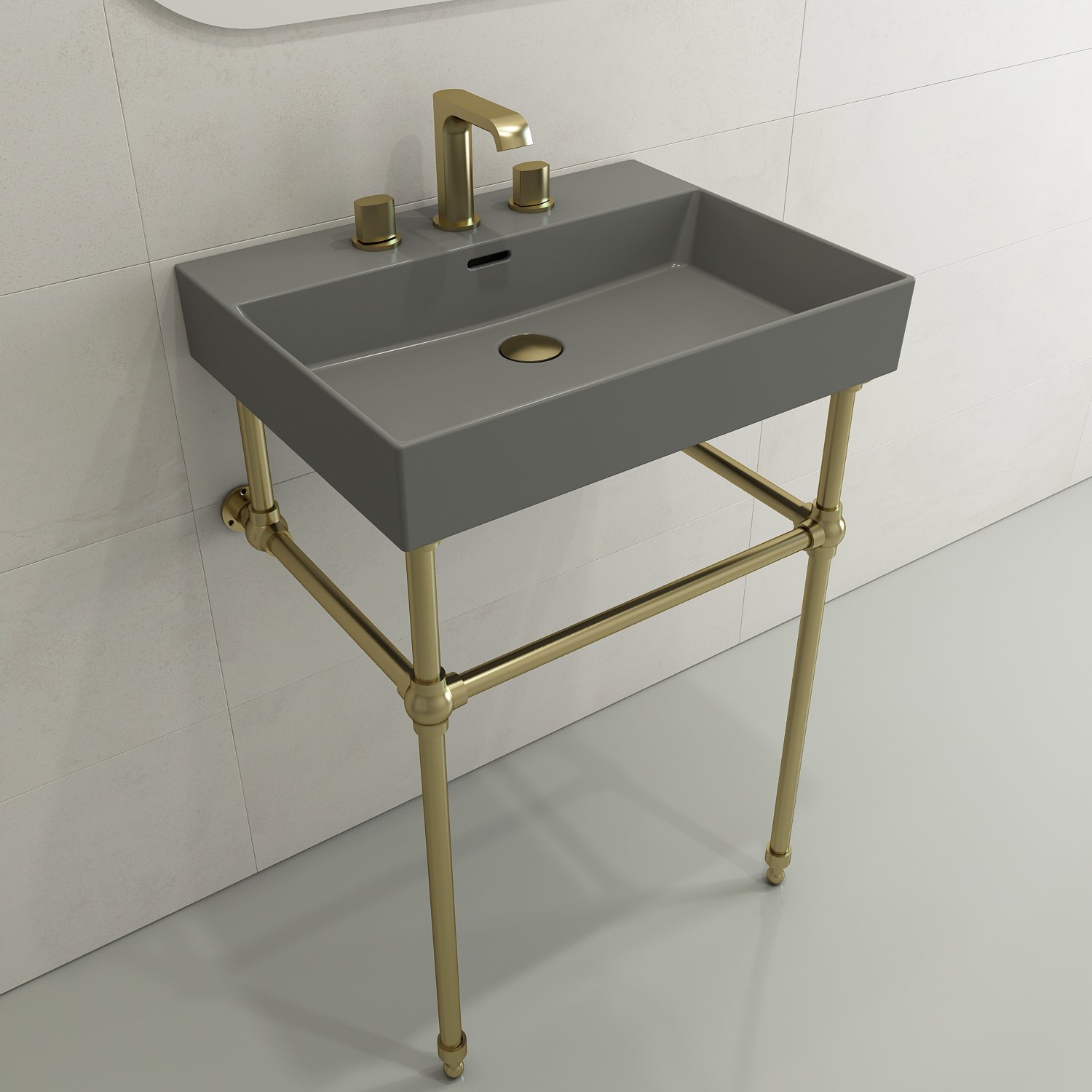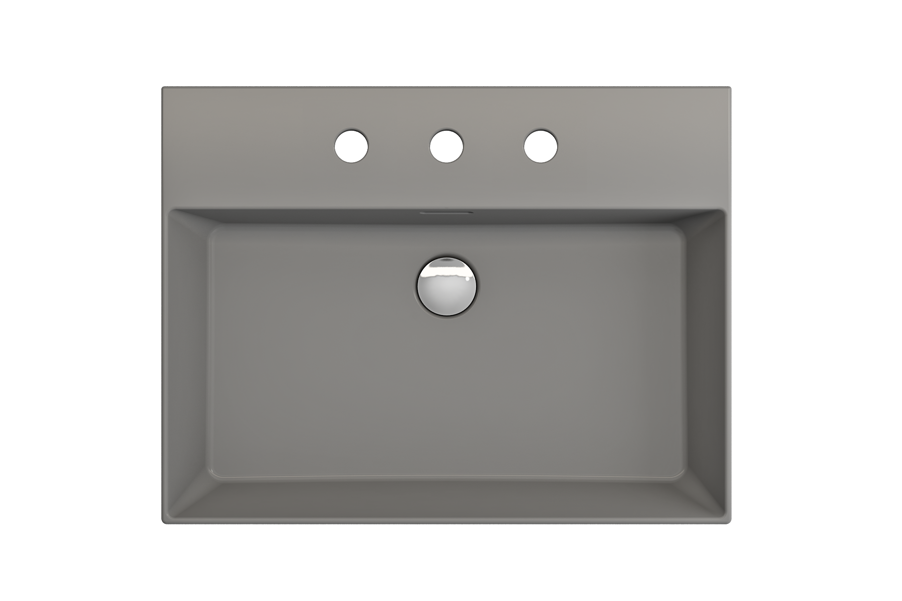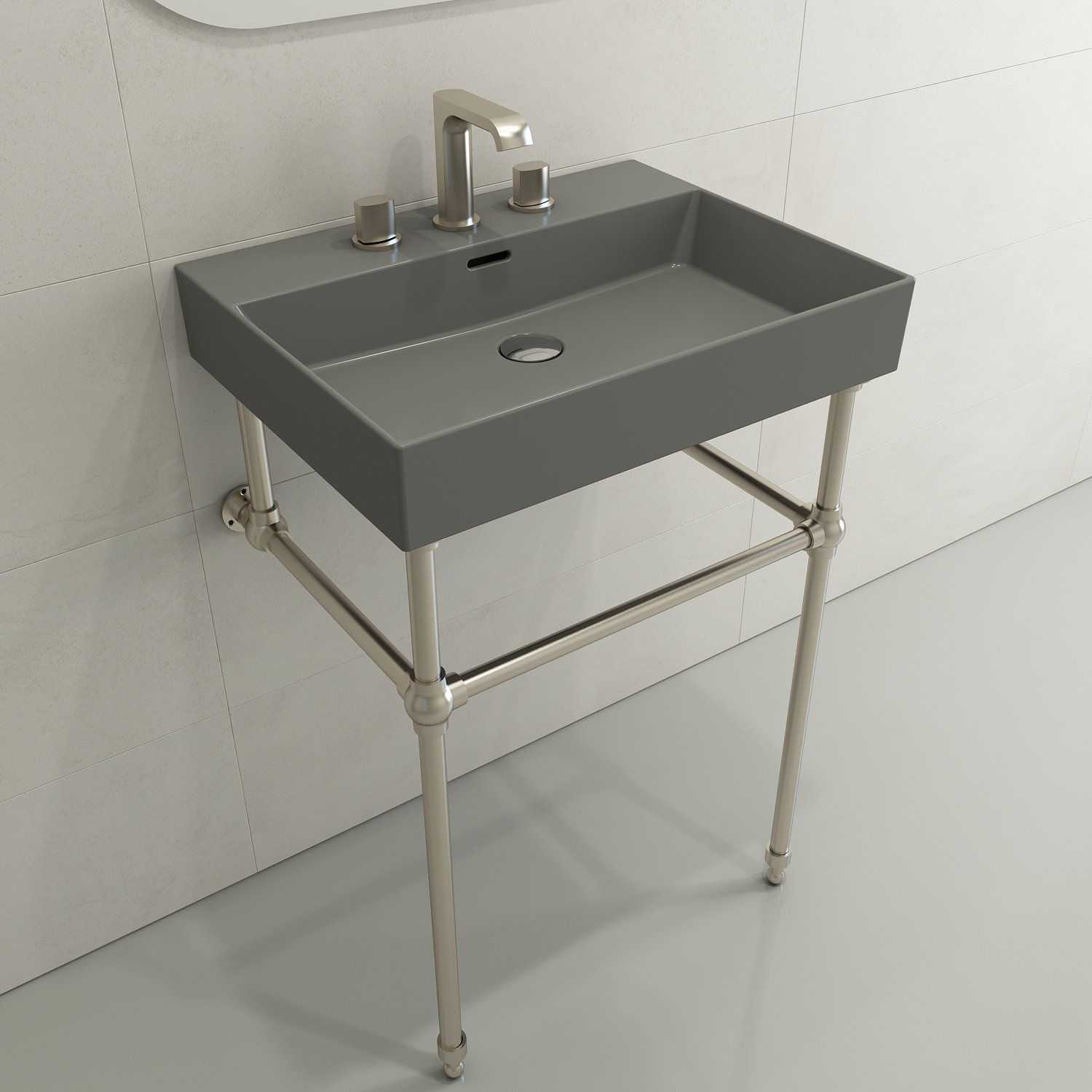 Bathroom sink with 3-hole (in.) faucet setting. May be wall-hung, used with metal console legs, or counterset.