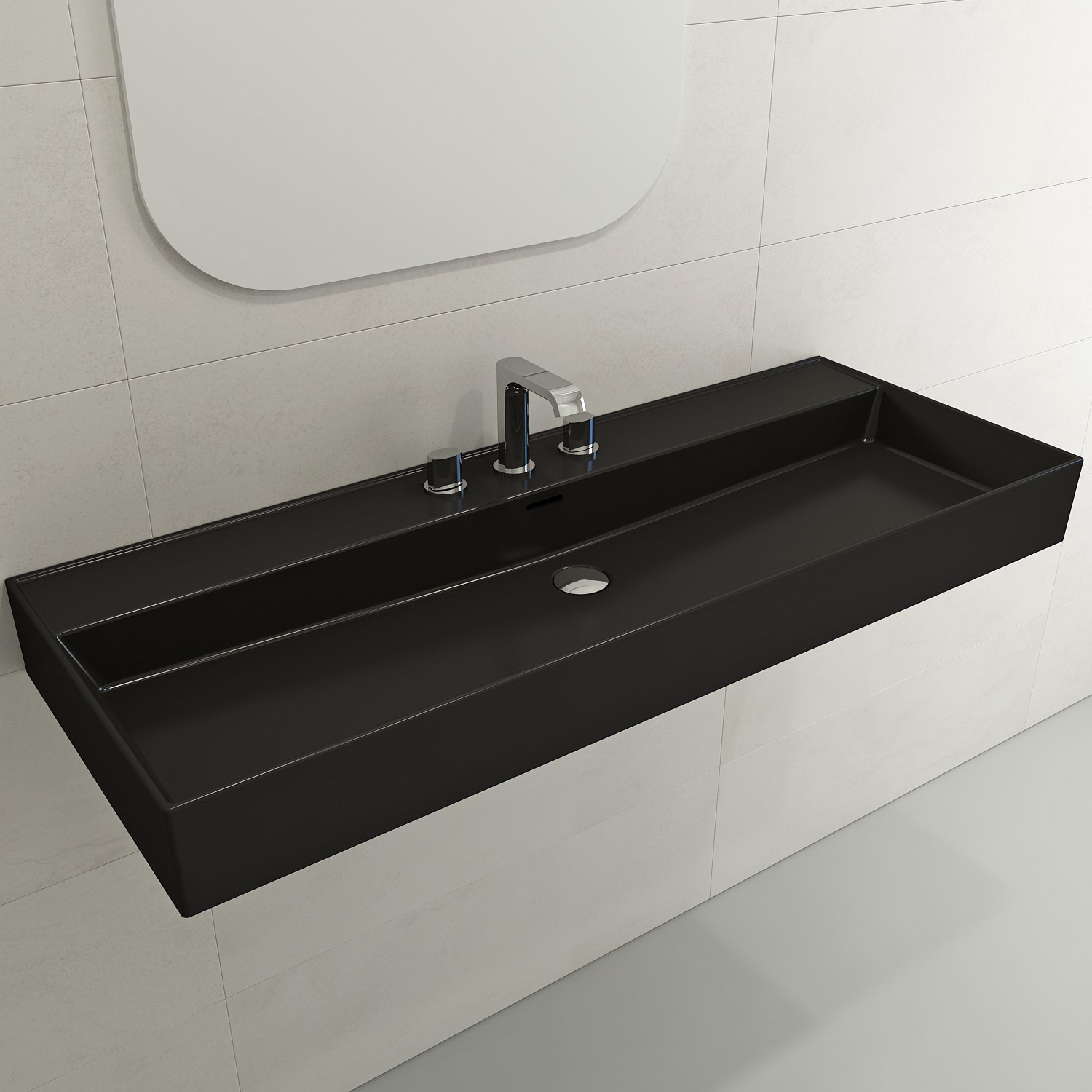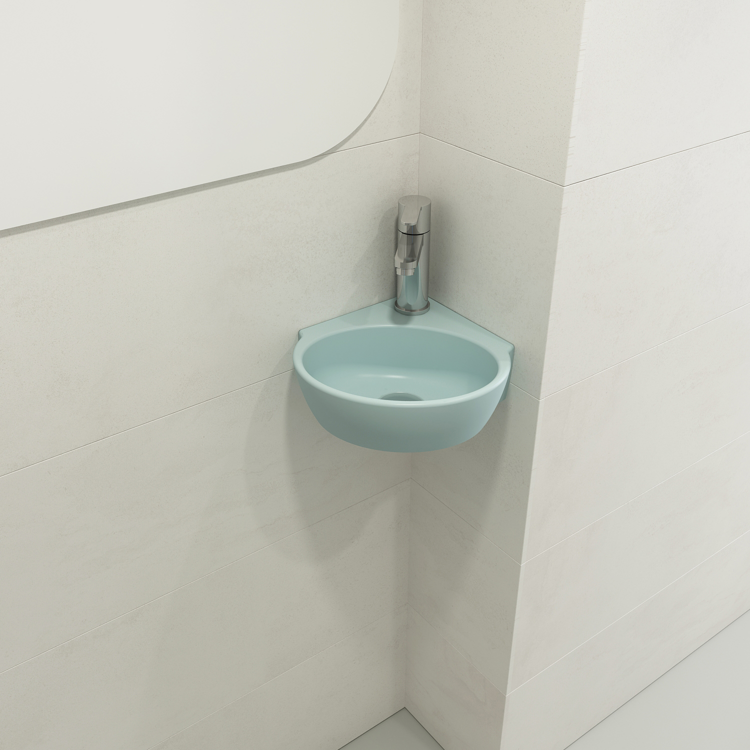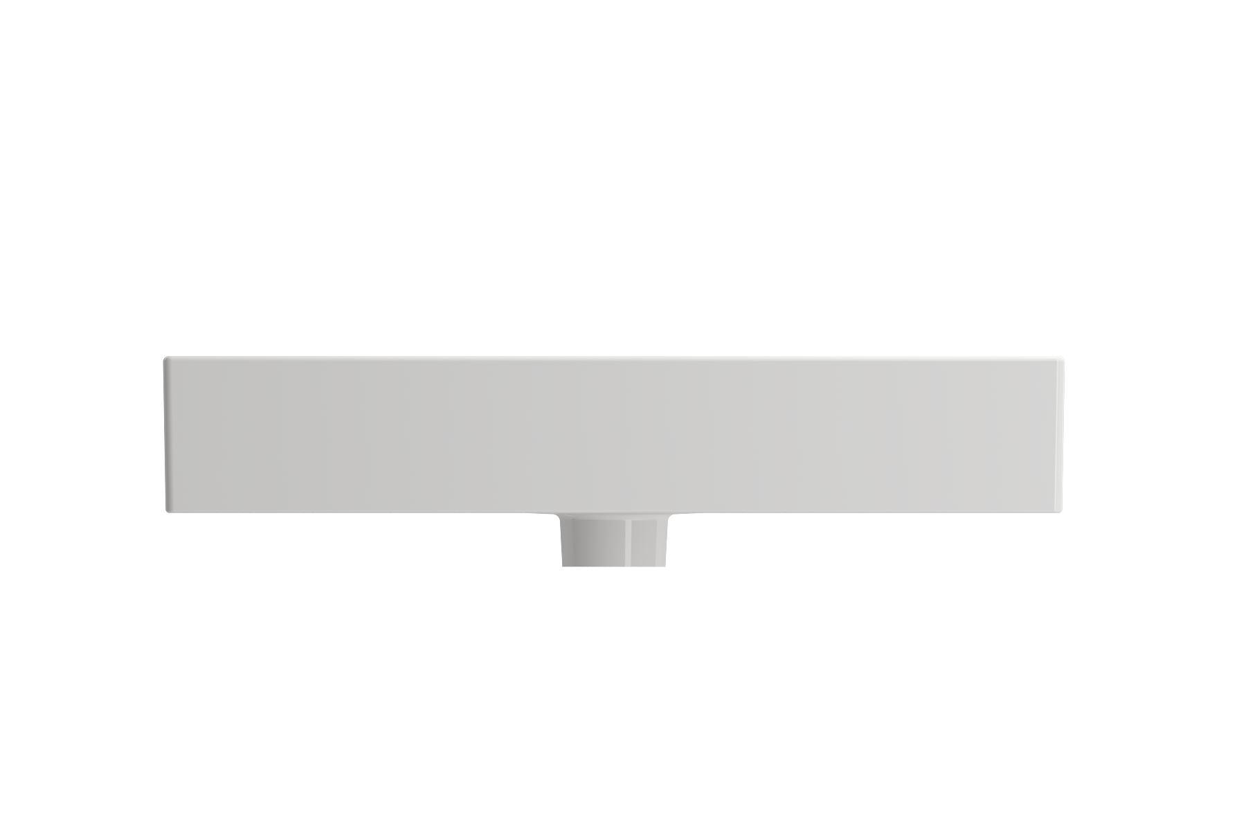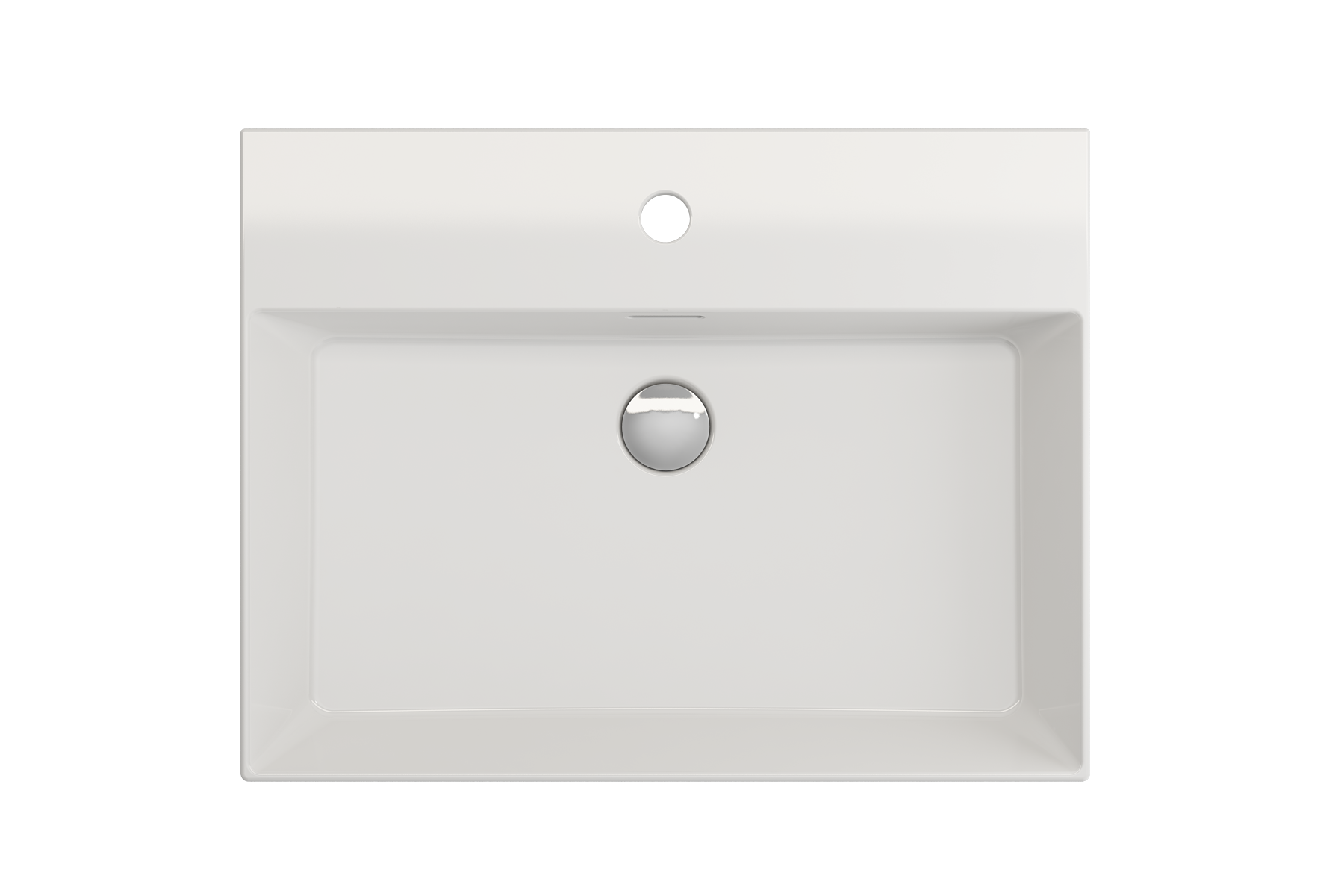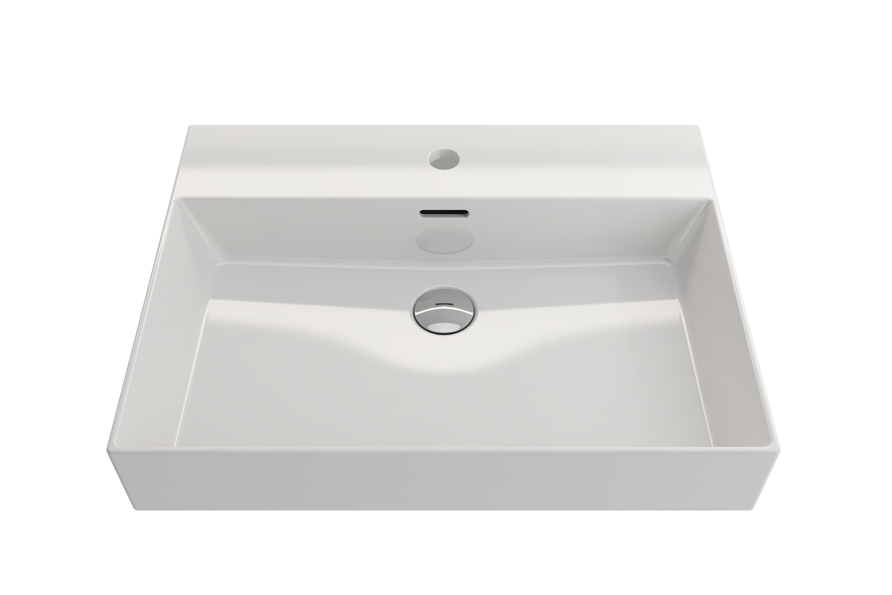 Bathroom sink with single-hole faucet setting. May be wall-hung, used with metal console legs, or counterset.