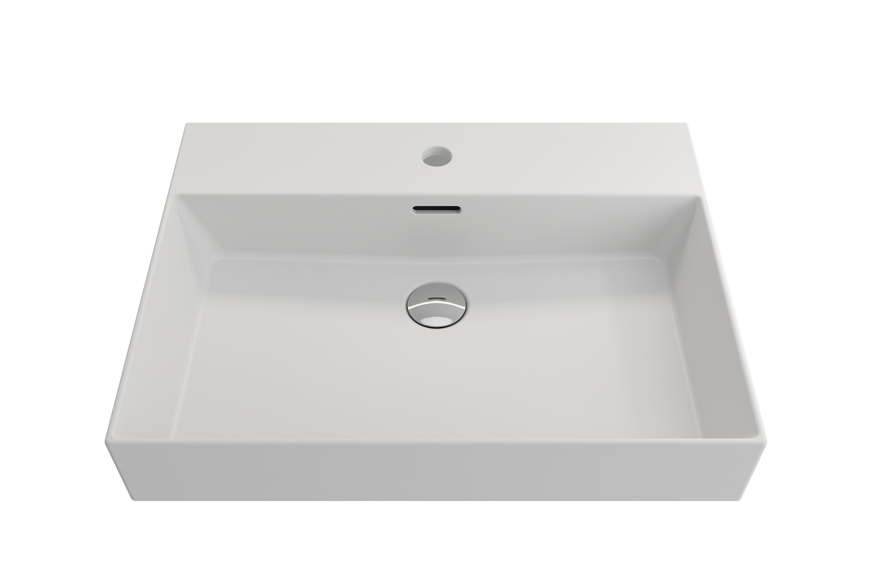 Bathroom sink with single-hole faucet setting. May be wall-hung, used with metal console legs, or counterset.