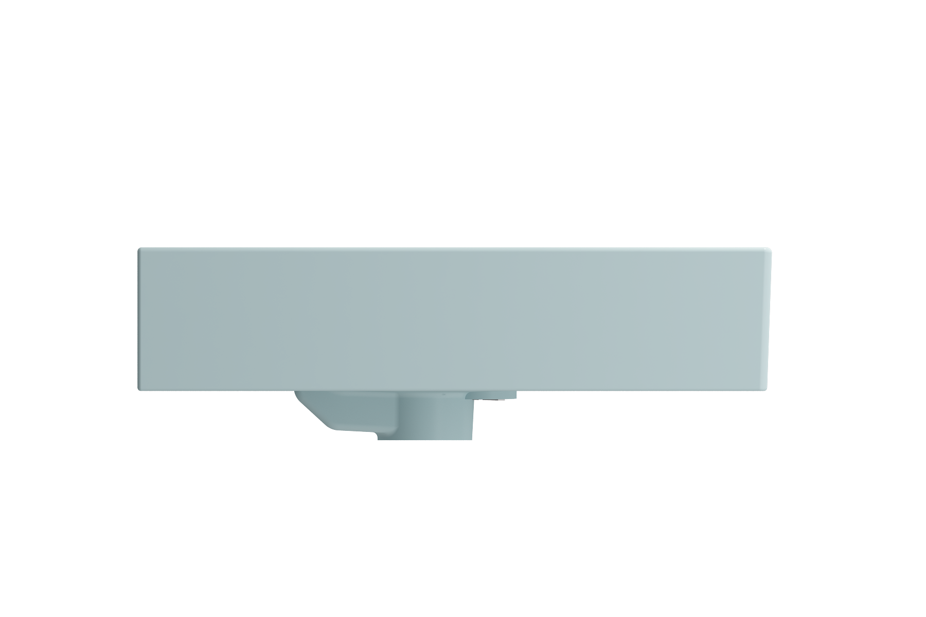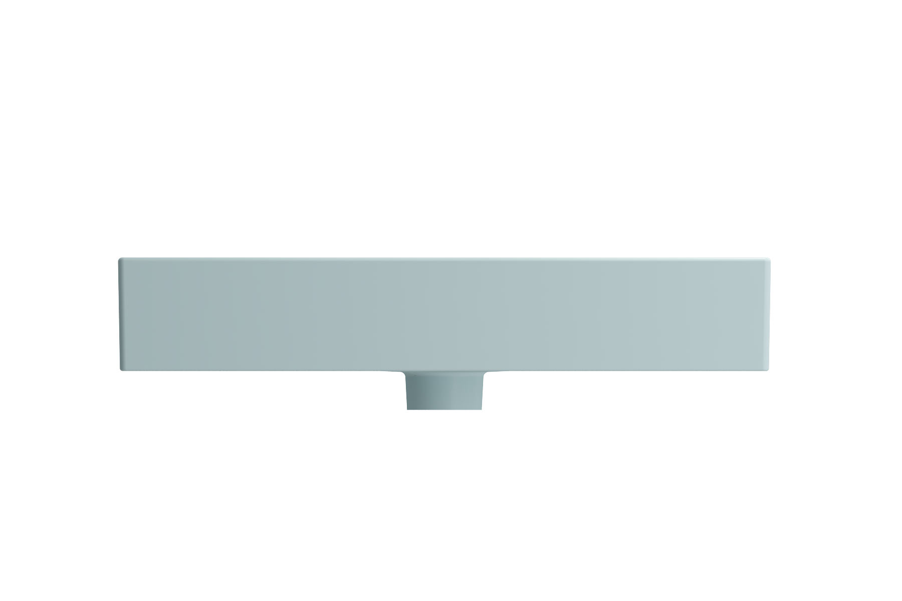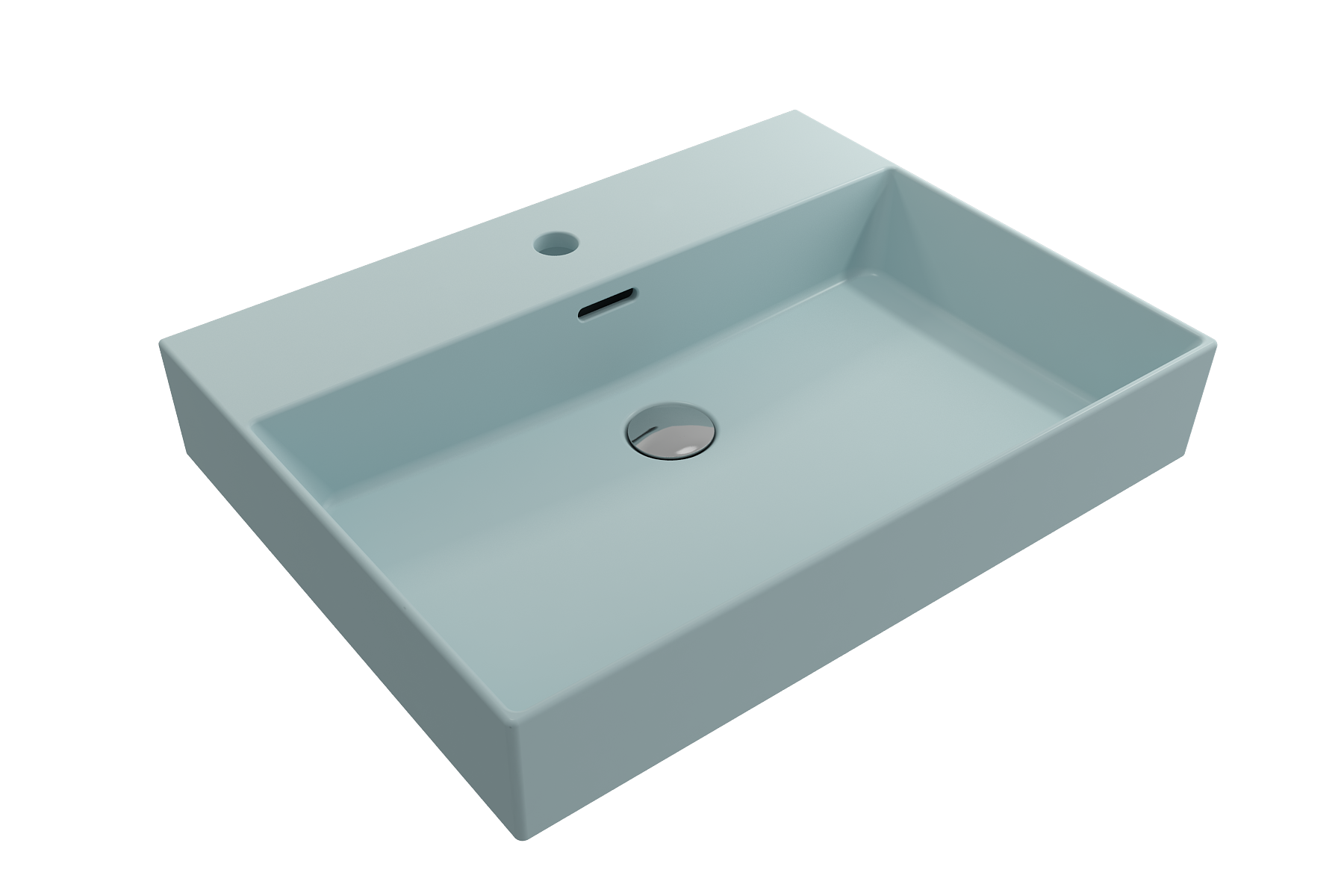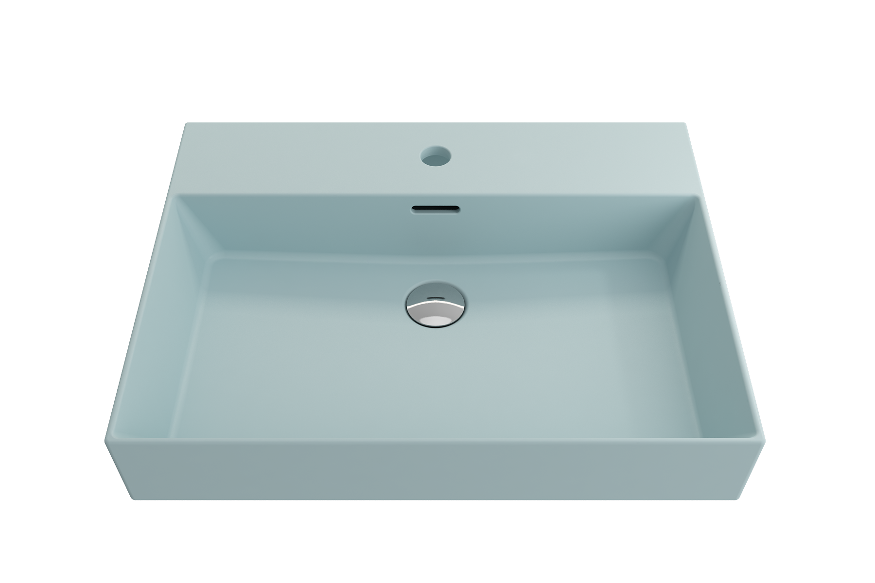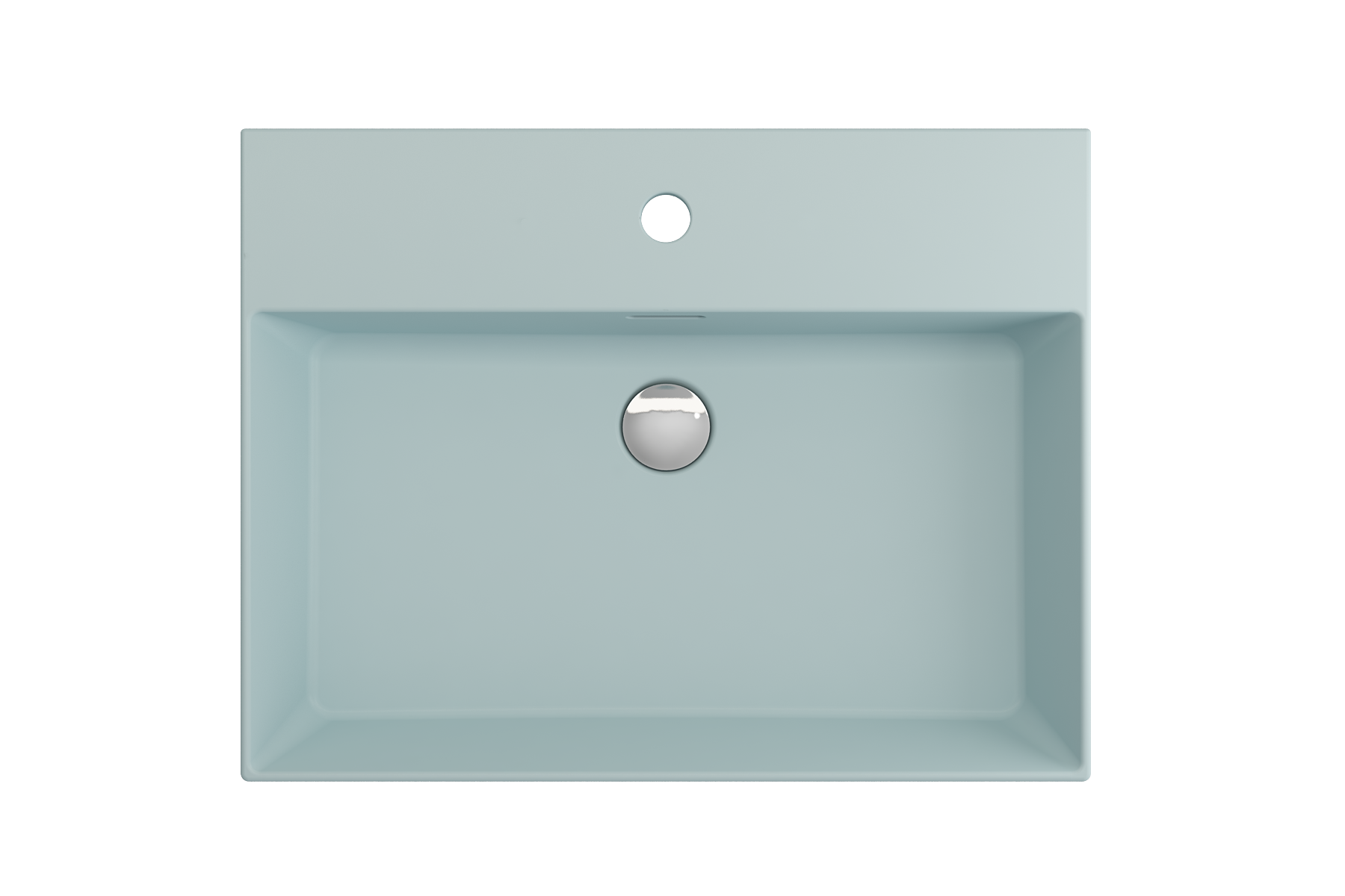Bathroom sink with single-hole faucet setting. May be wall-hung, used with metal console legs, or counterset.
