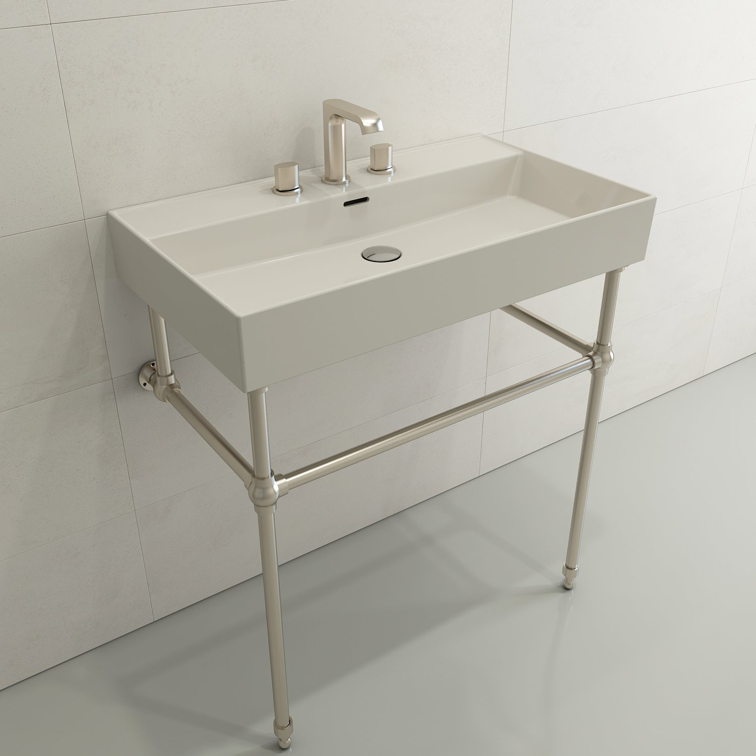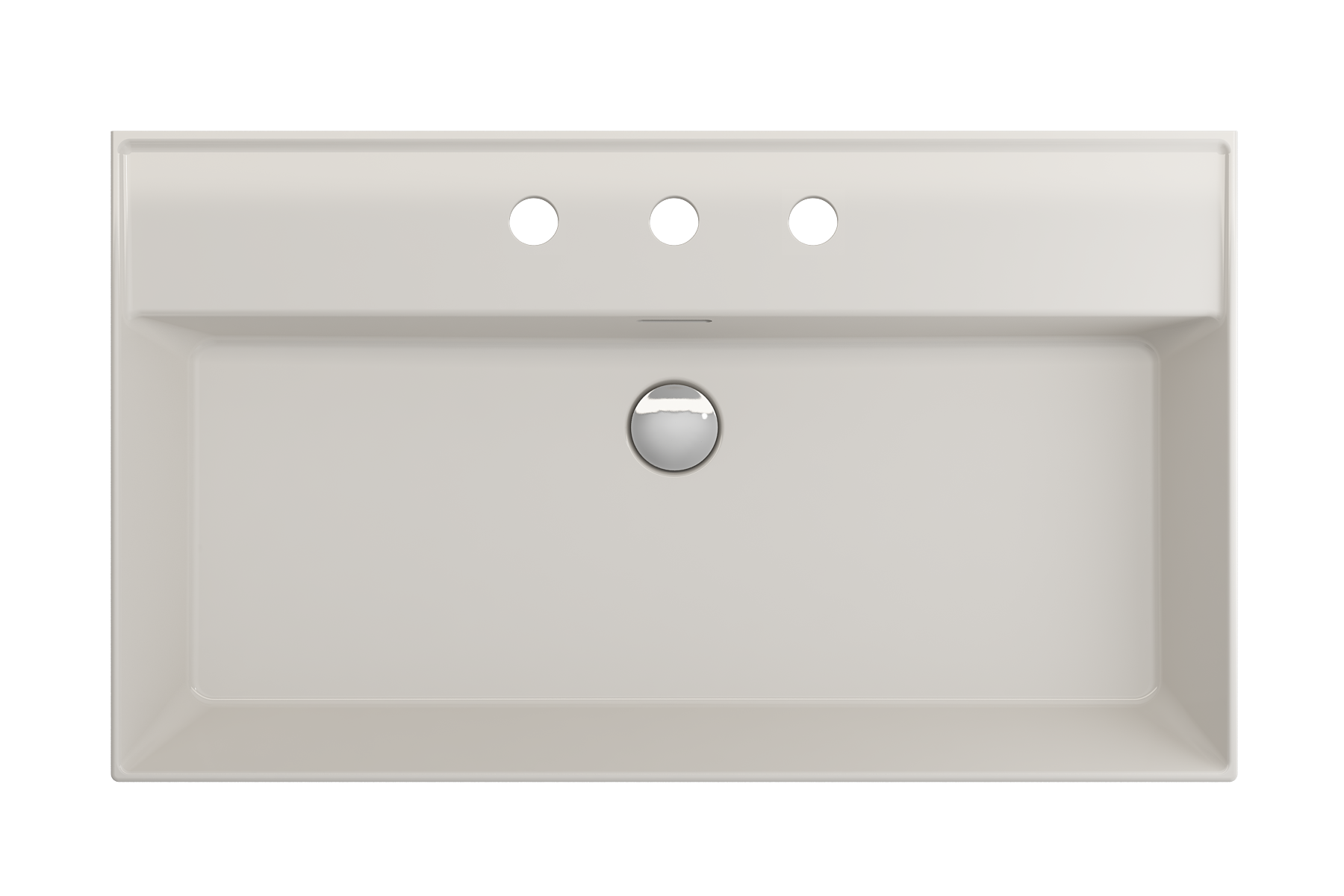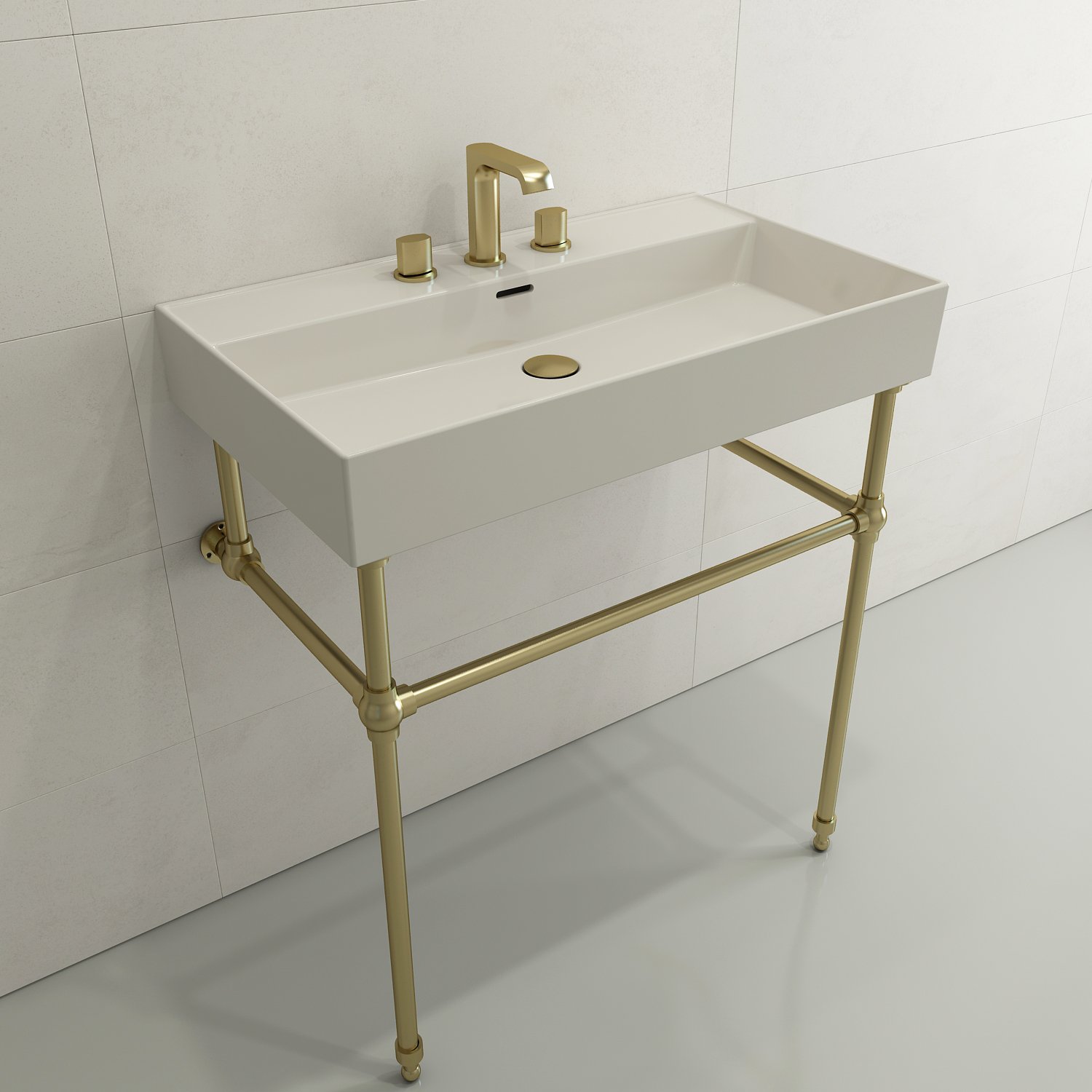 Bathroom sink with 3-hole (in.) faucet setting. May be wall-hung, used with metal console legs, or counterset.