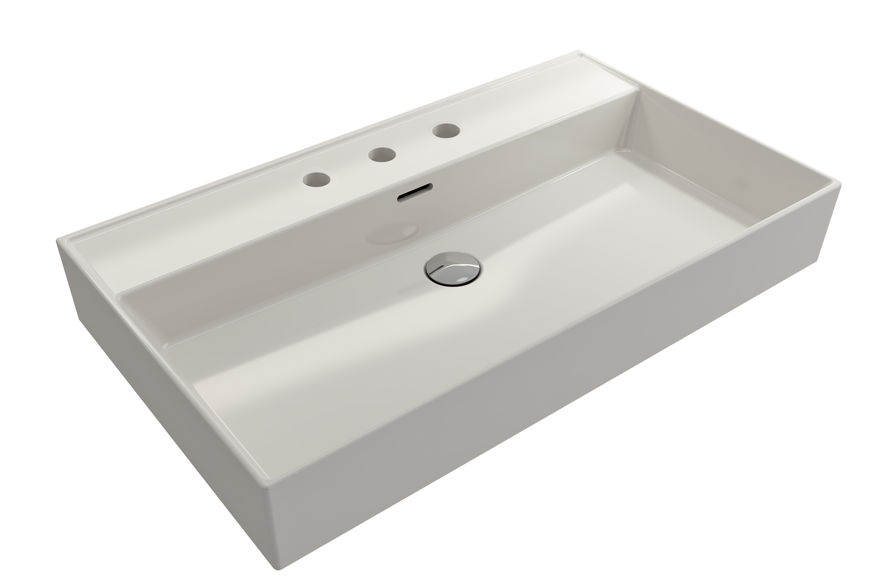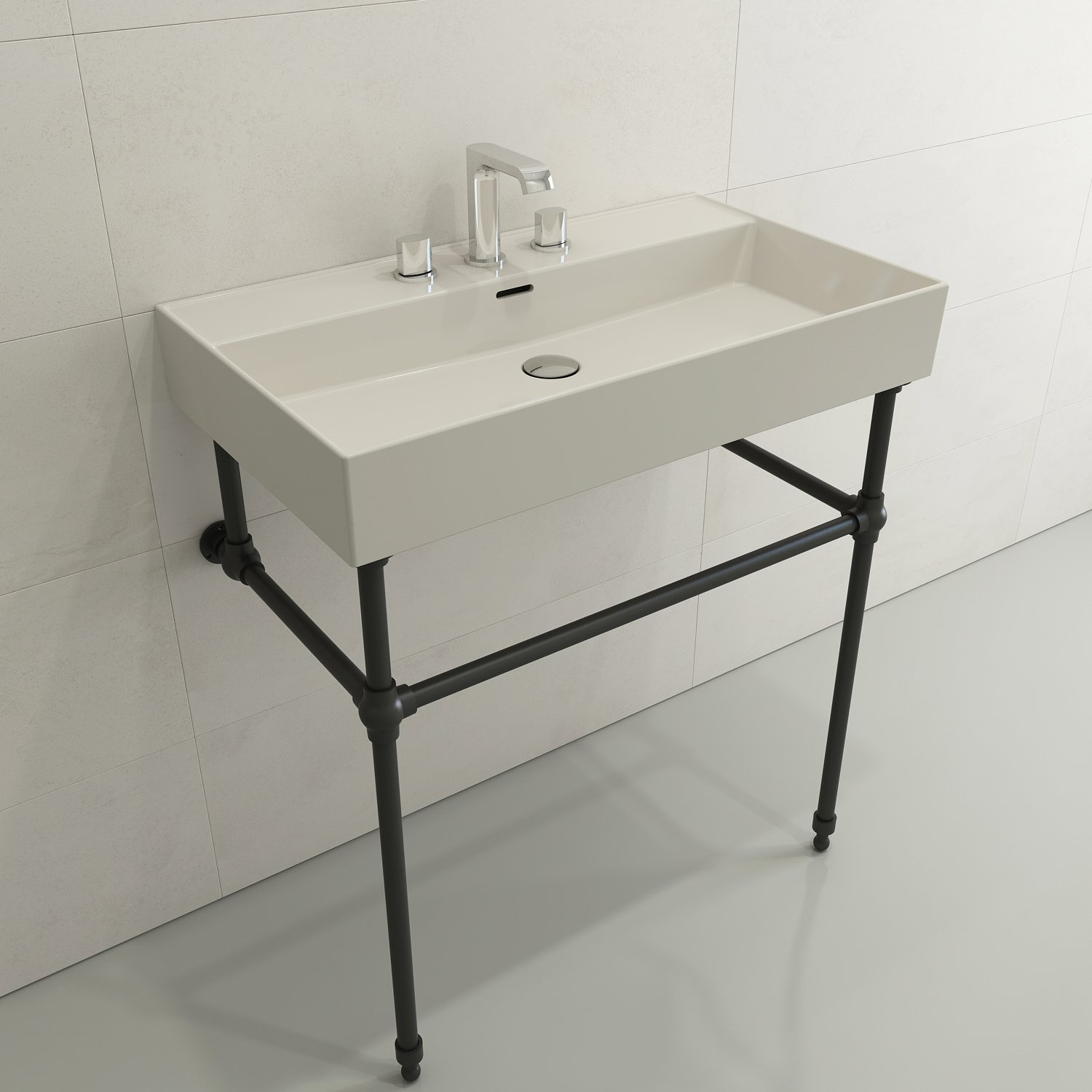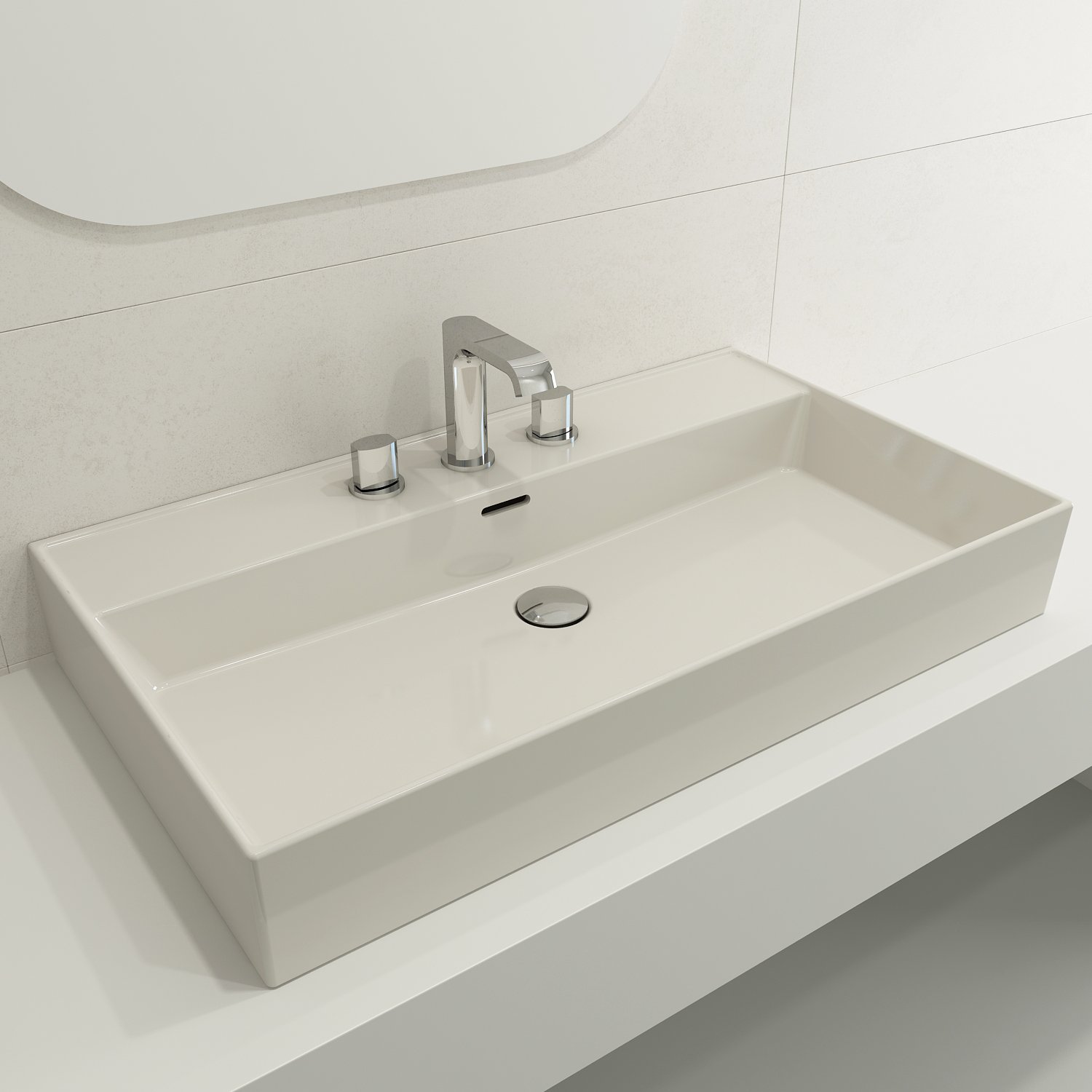 Bathroom sink with 3-hole (in.) faucet setting. May be wall-hung, used with metal console legs, or counterset.