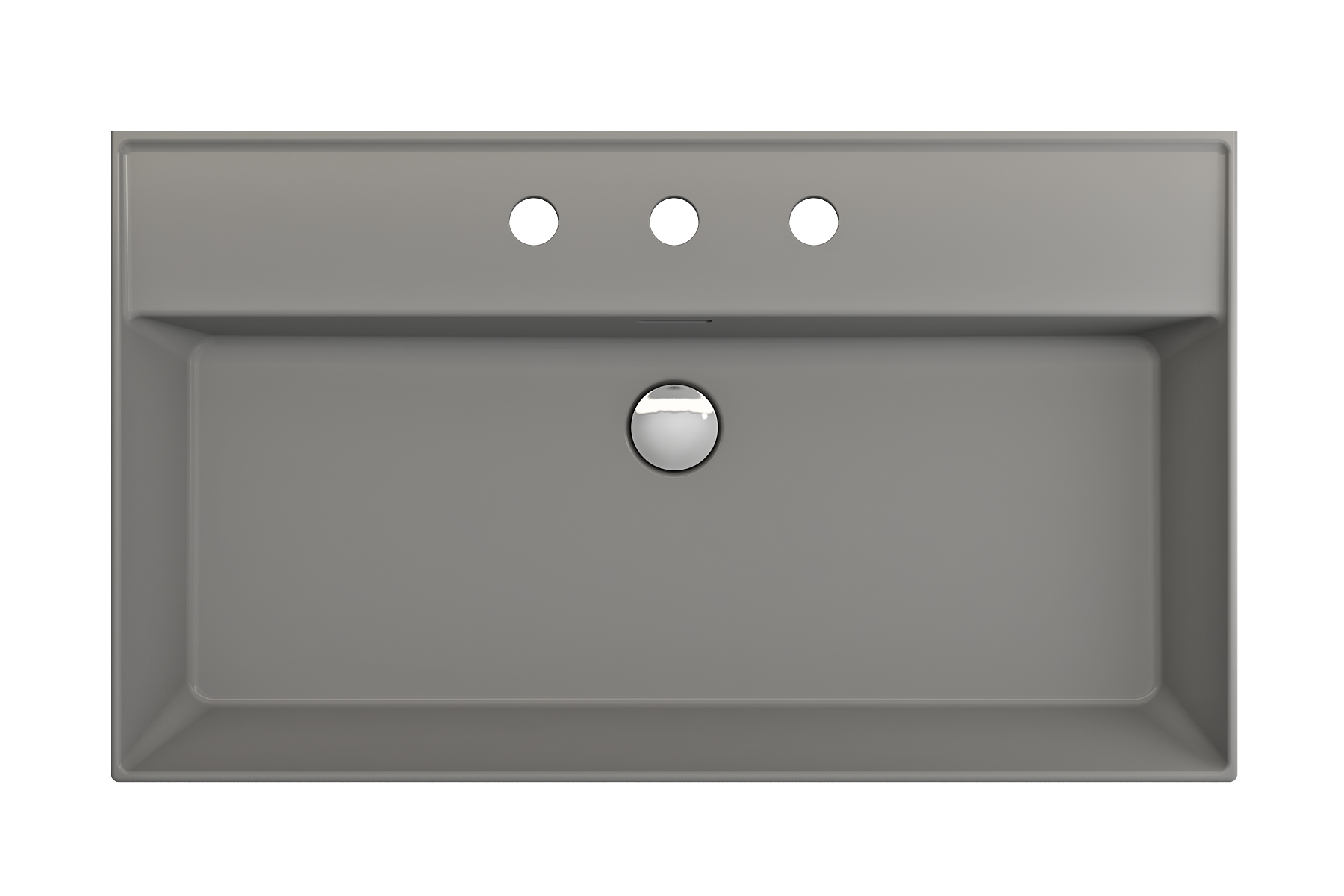 Bathroom sink with 3-hole (in.) faucet setting. May be wall-hung, used with metal console legs, or counterset.
