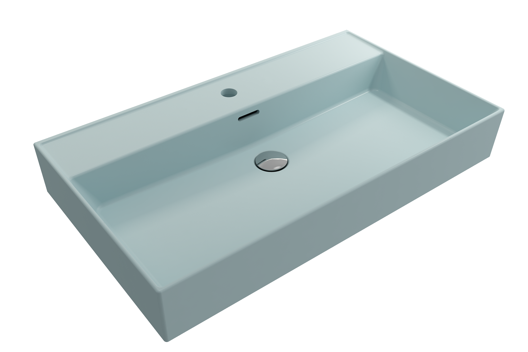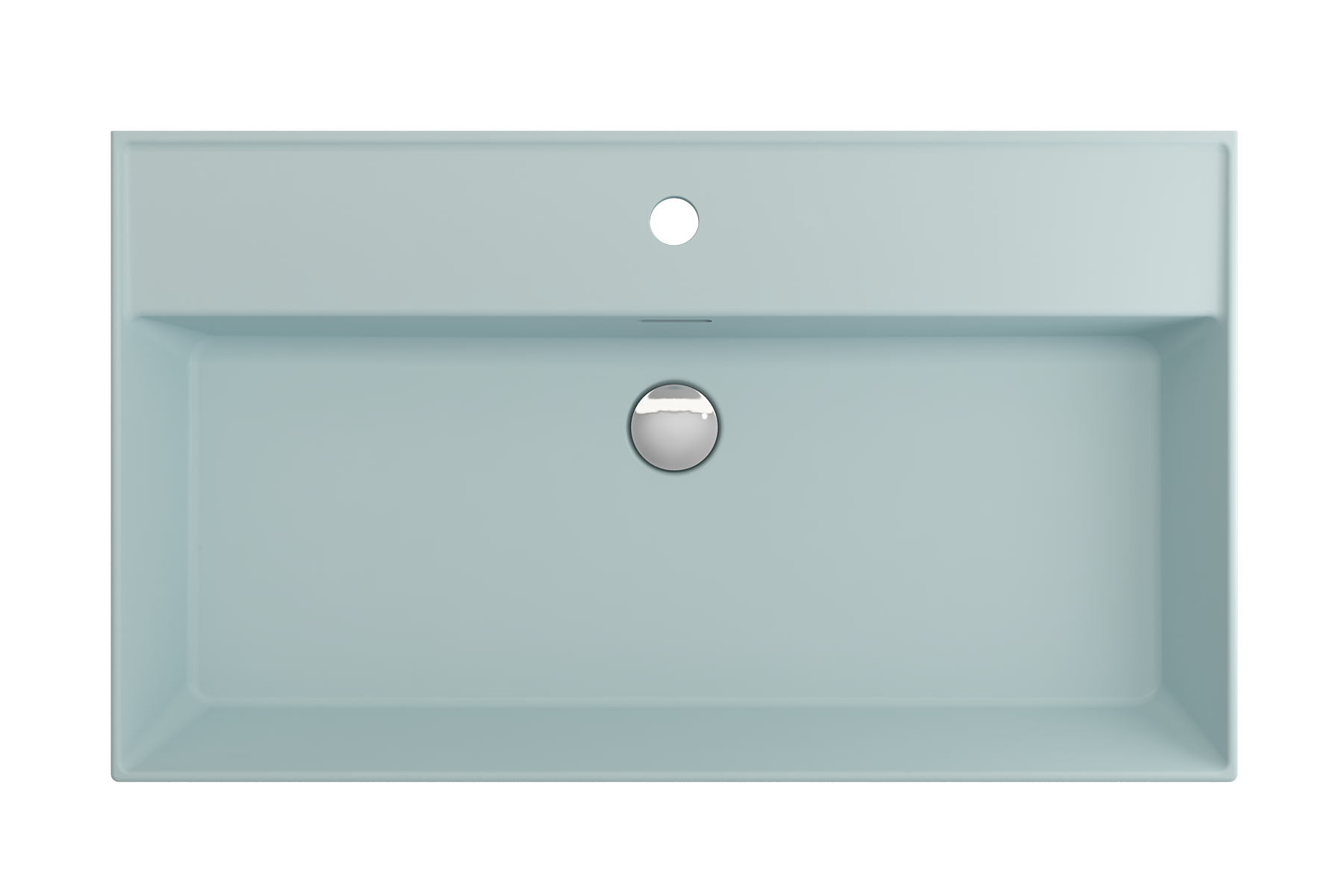 Bathroom sink with single-hole faucet setting. May be wall-hung, used with metal console legs, or counterset.