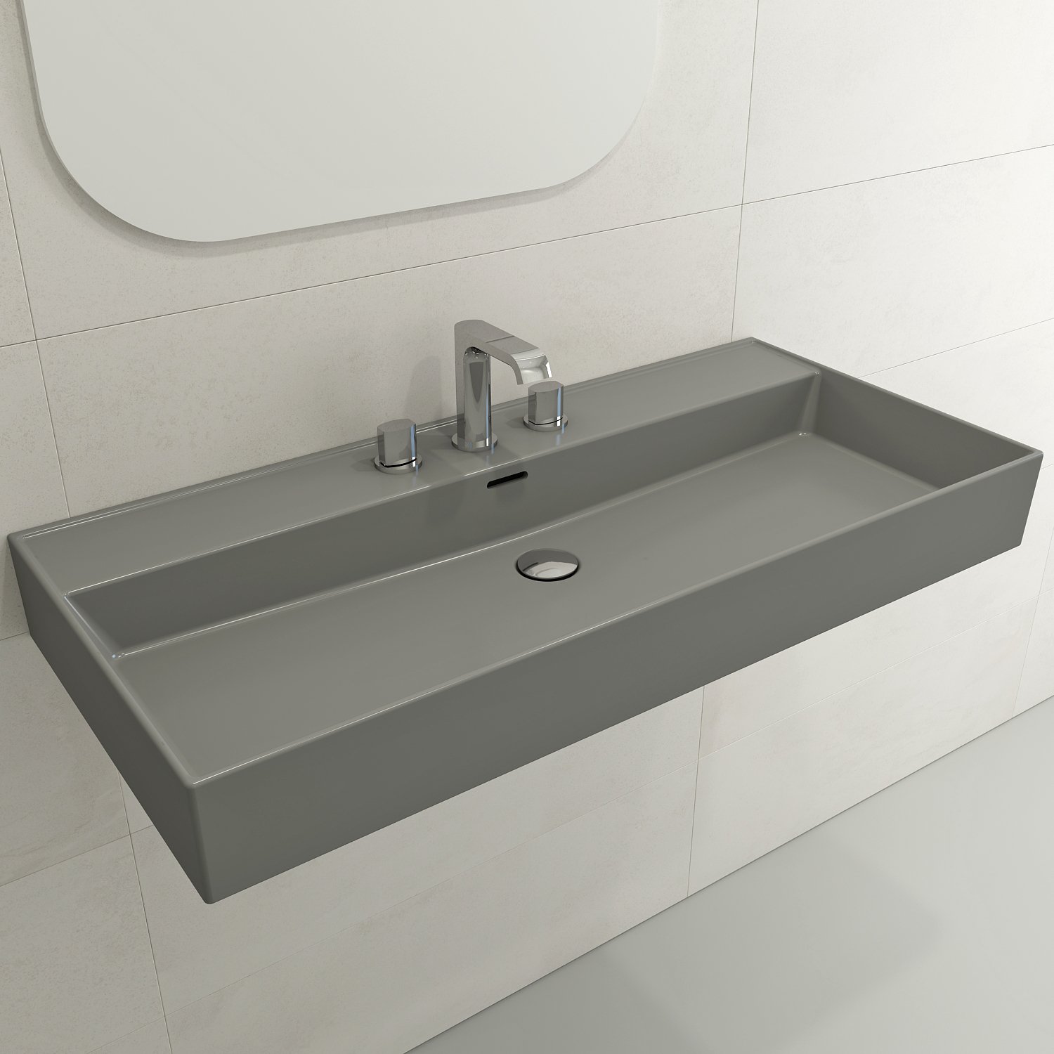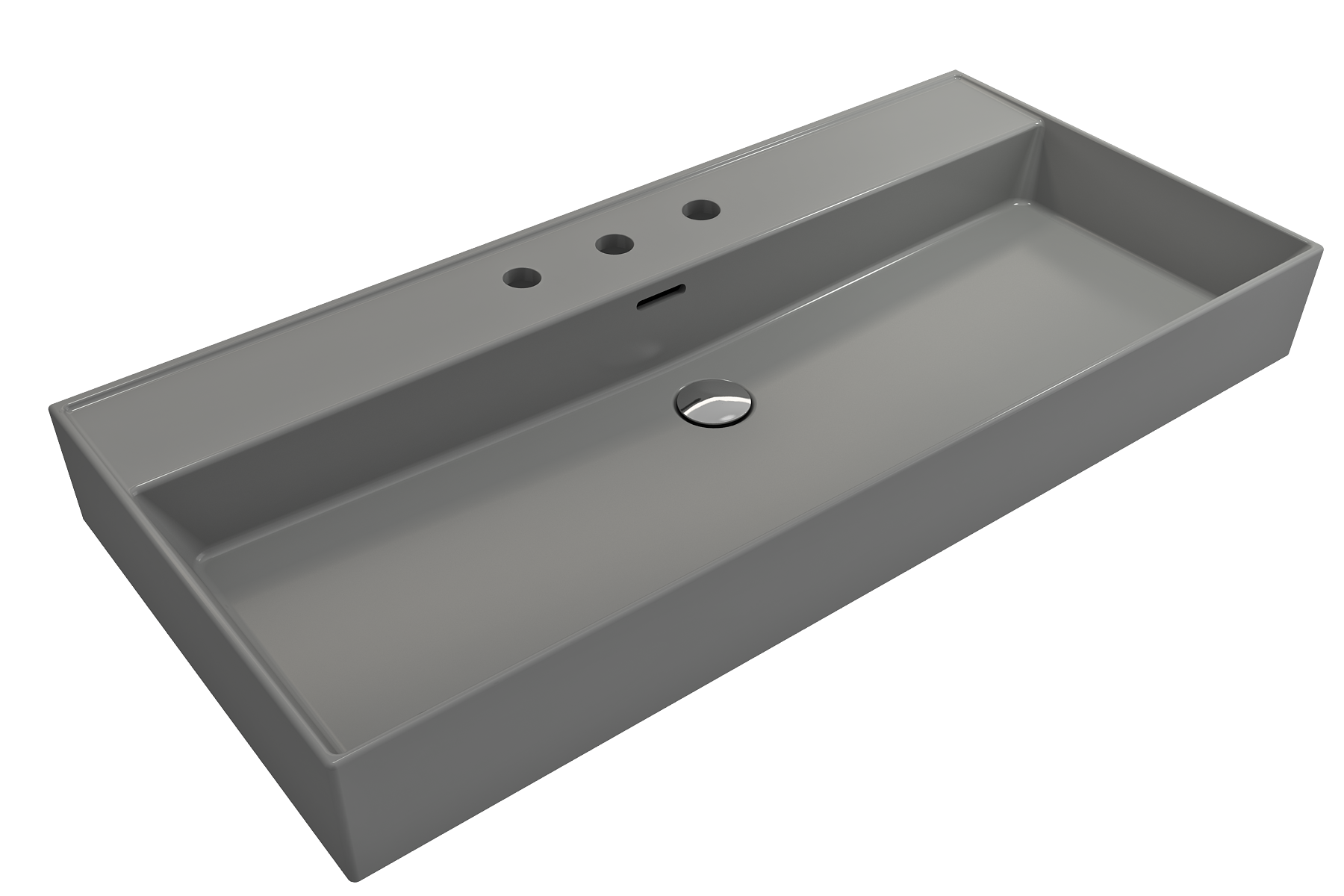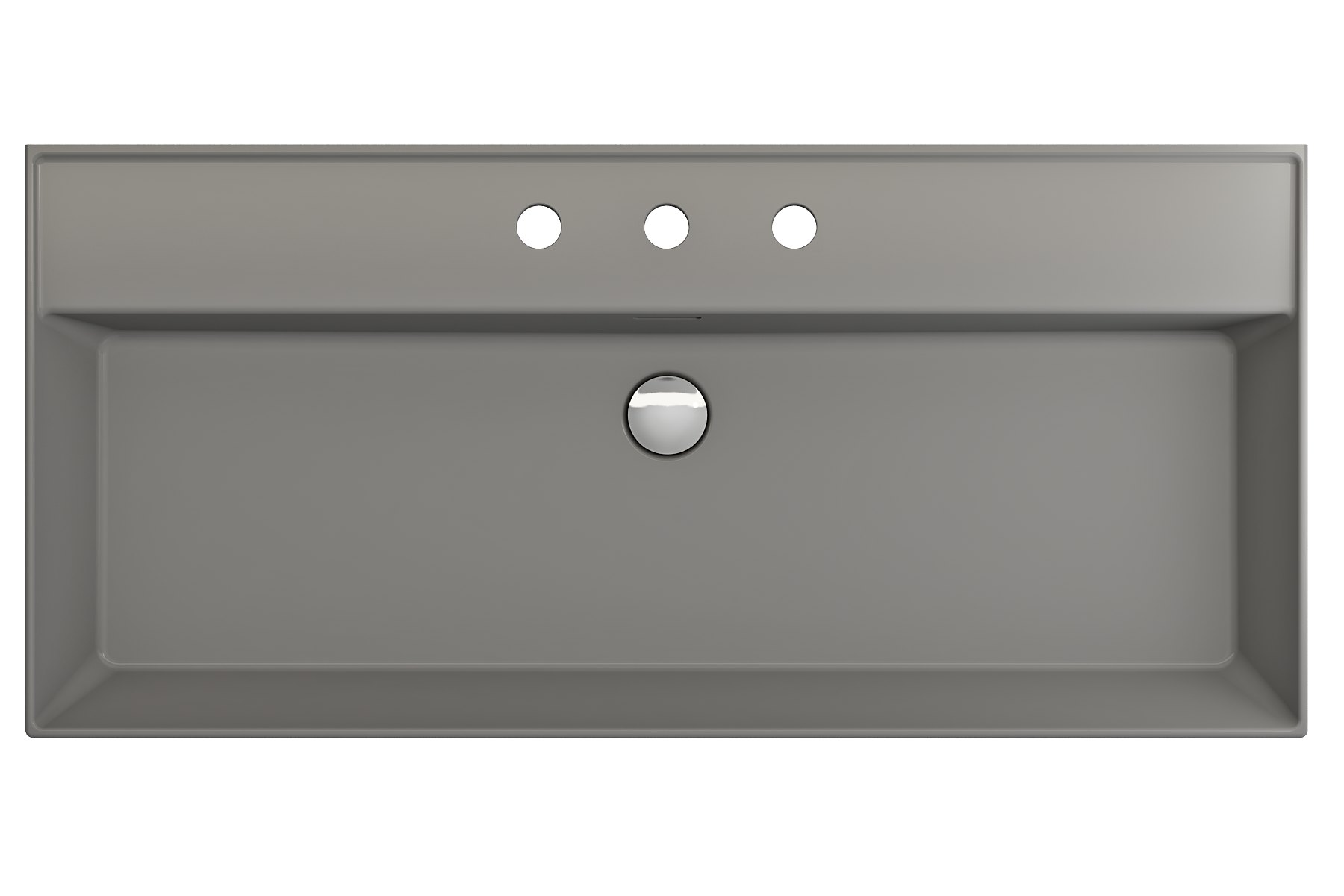 Bathroom sink with 3-hole (in.) faucet setting. May be wall-hung, used with metal console legs, or counterset.