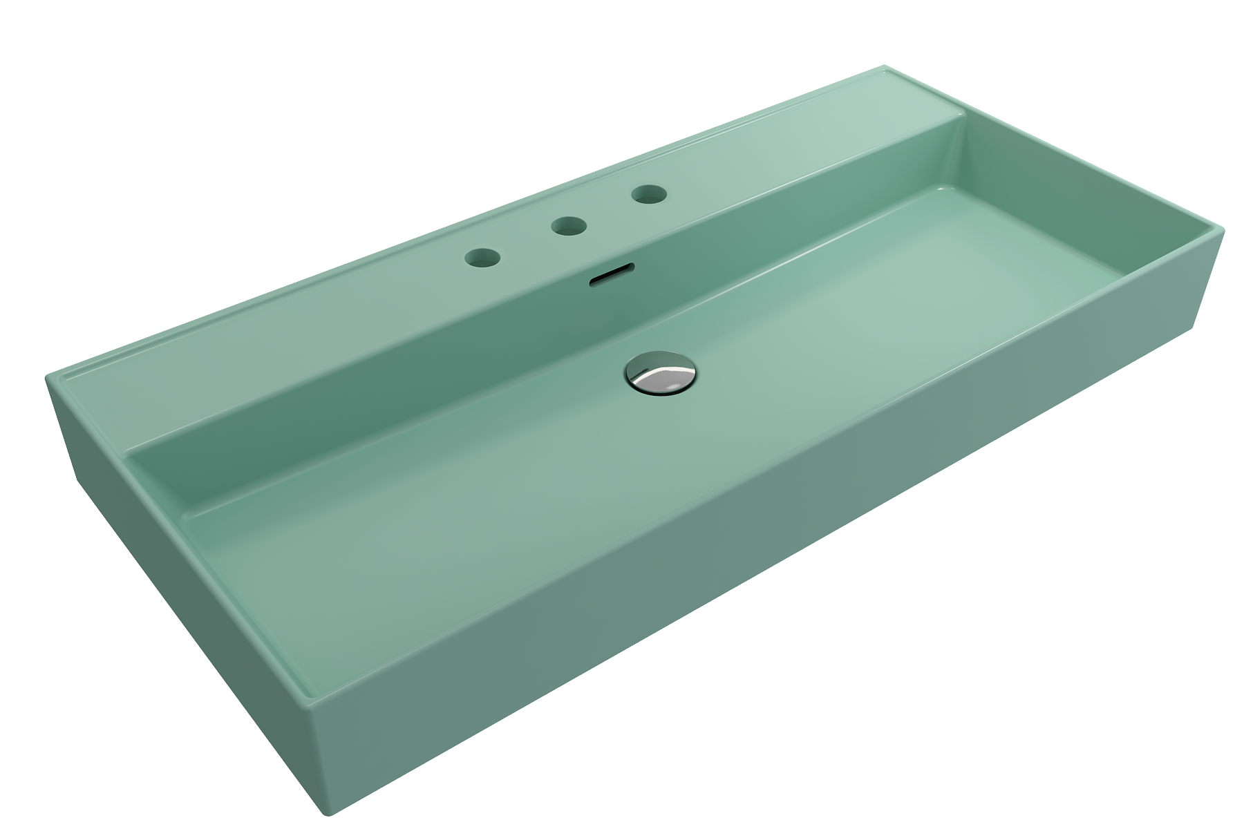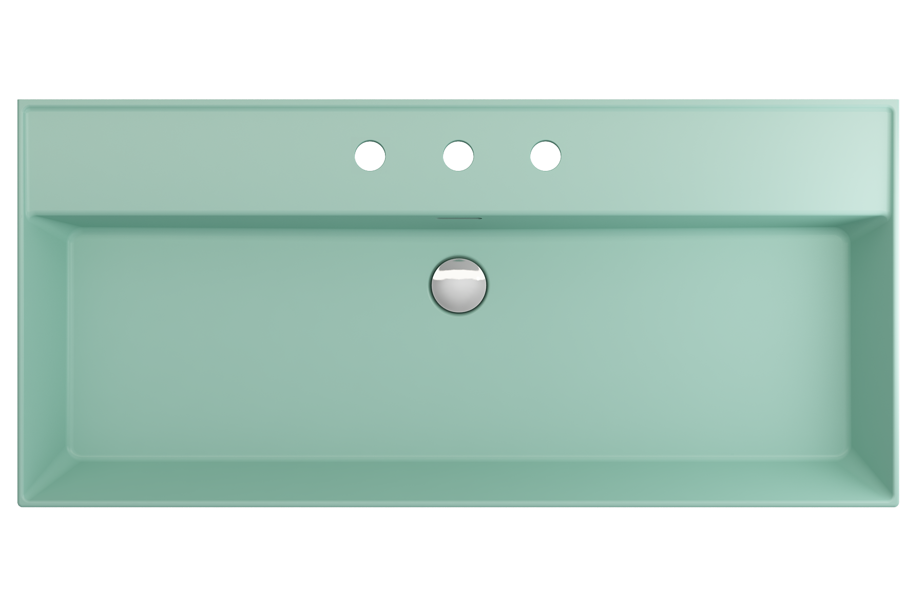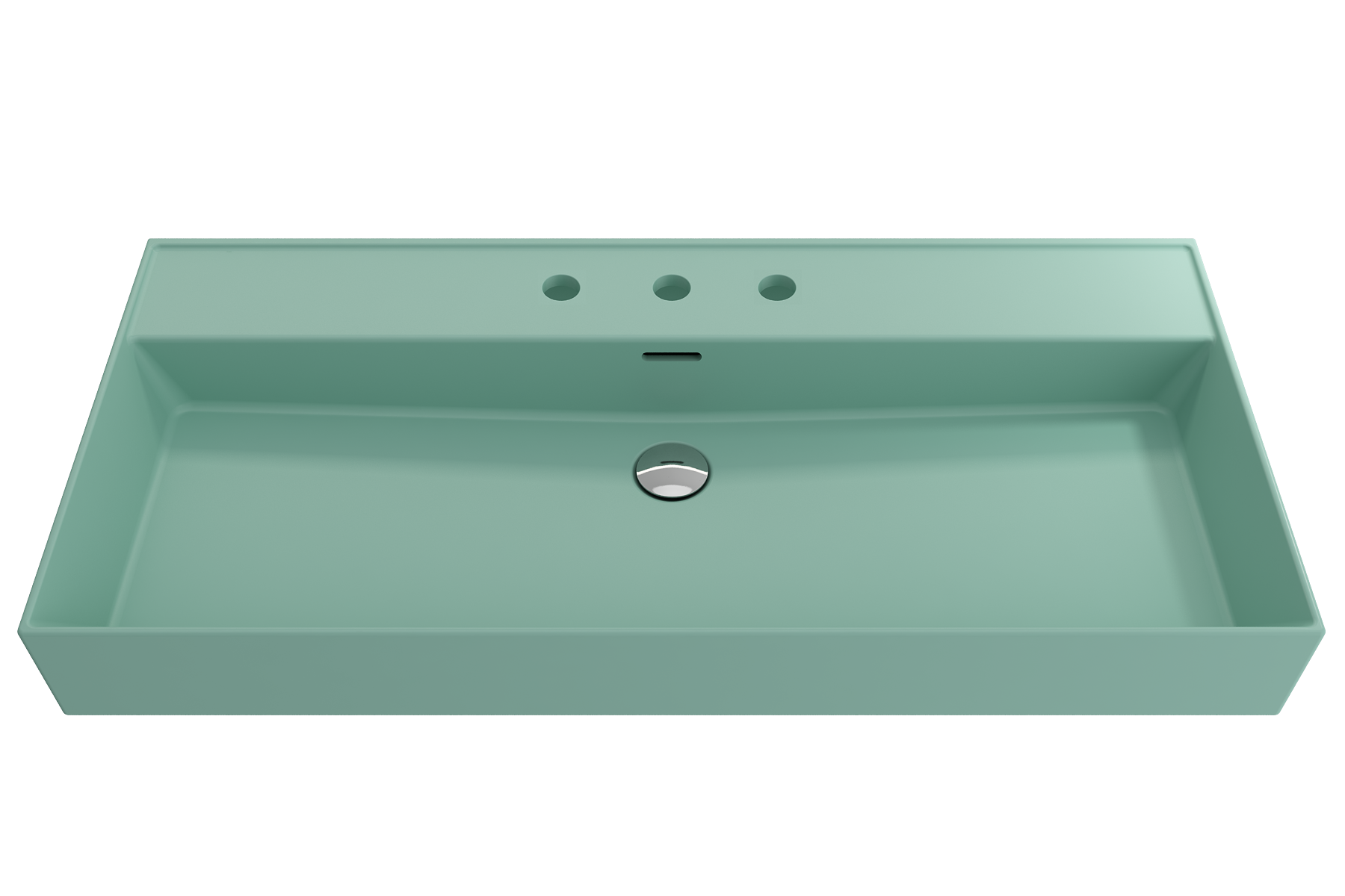 Bathroom sink with 3-hole (in.) faucet setting. May be wall-hung, used with metal console legs, or counterset.