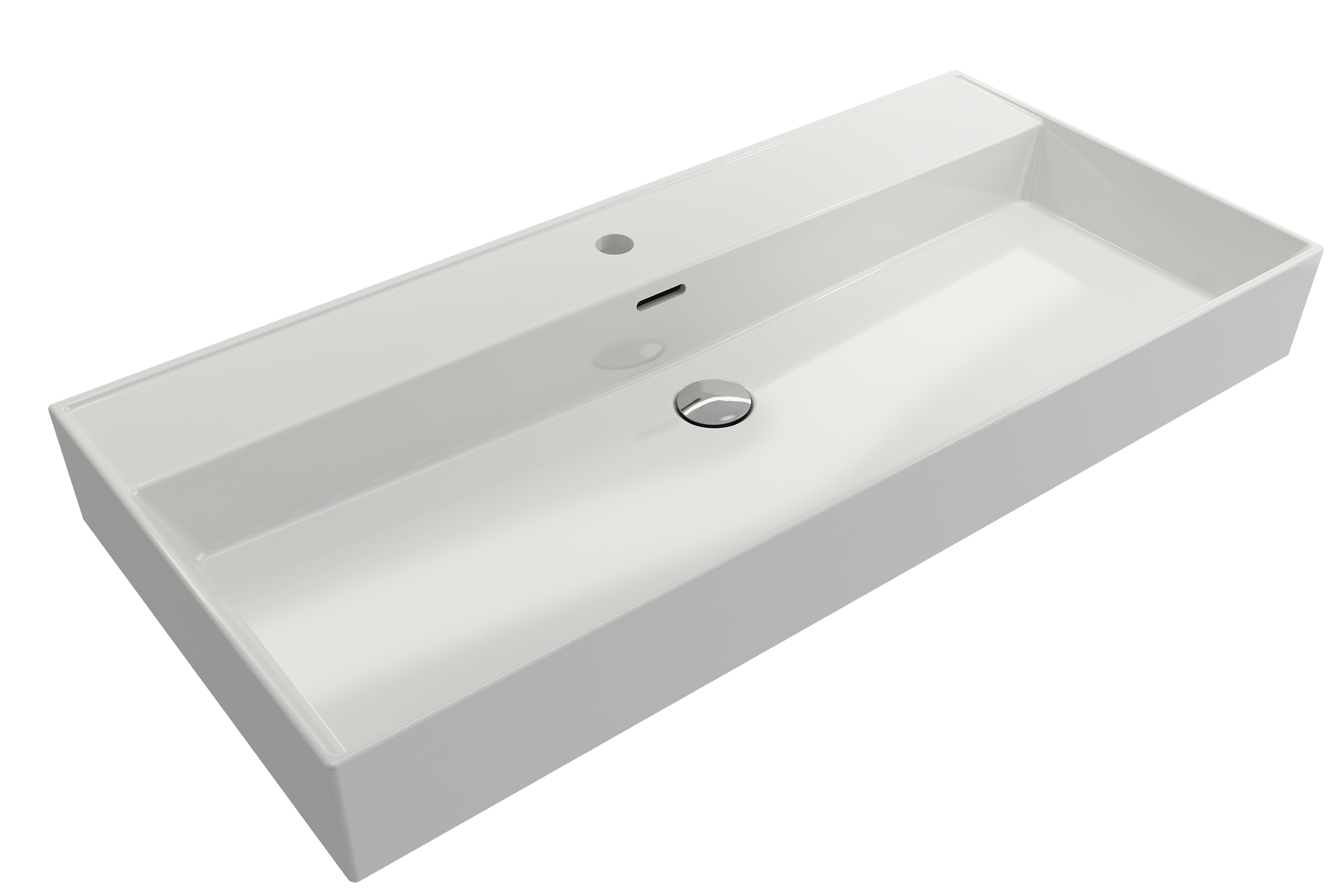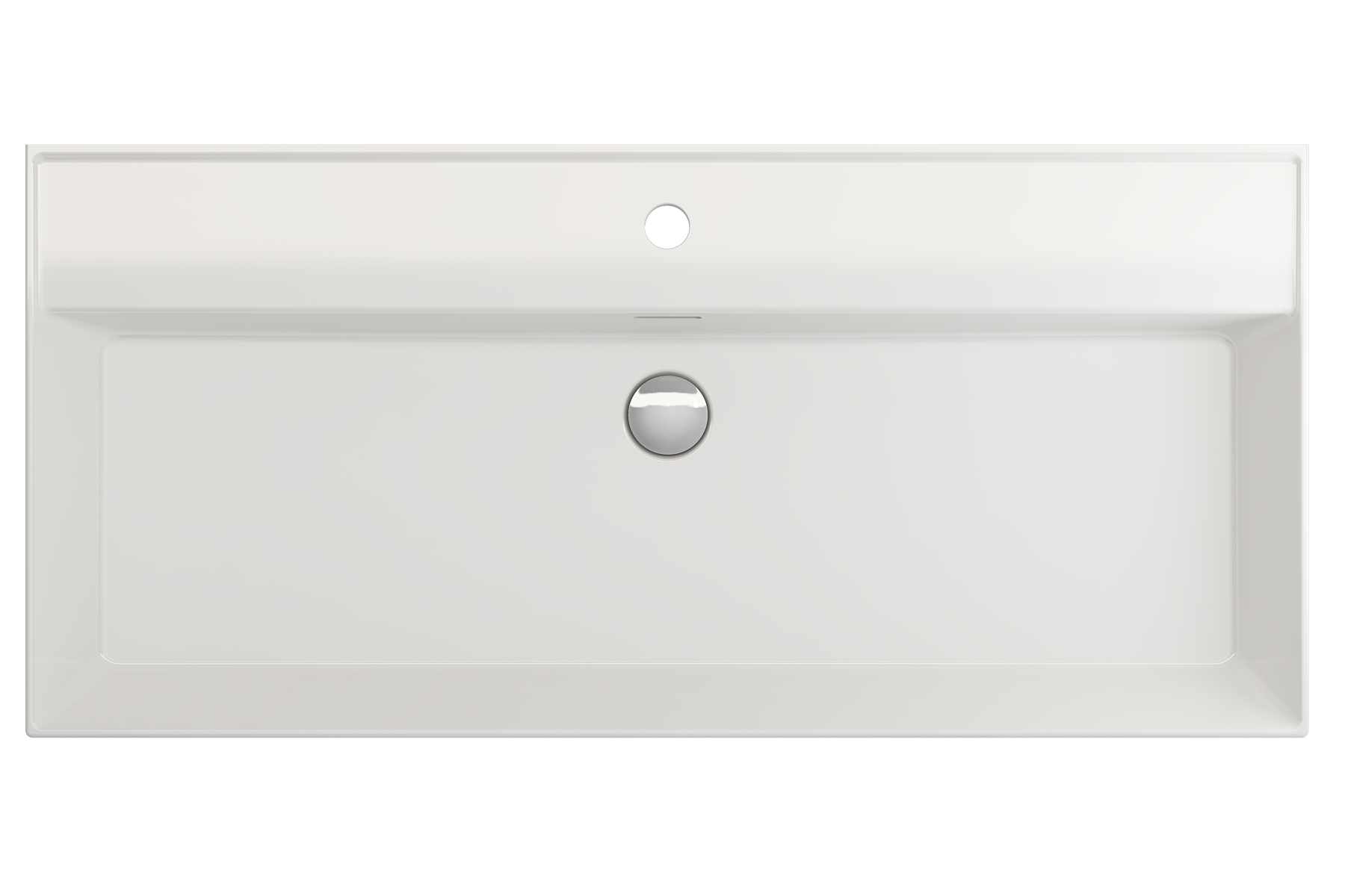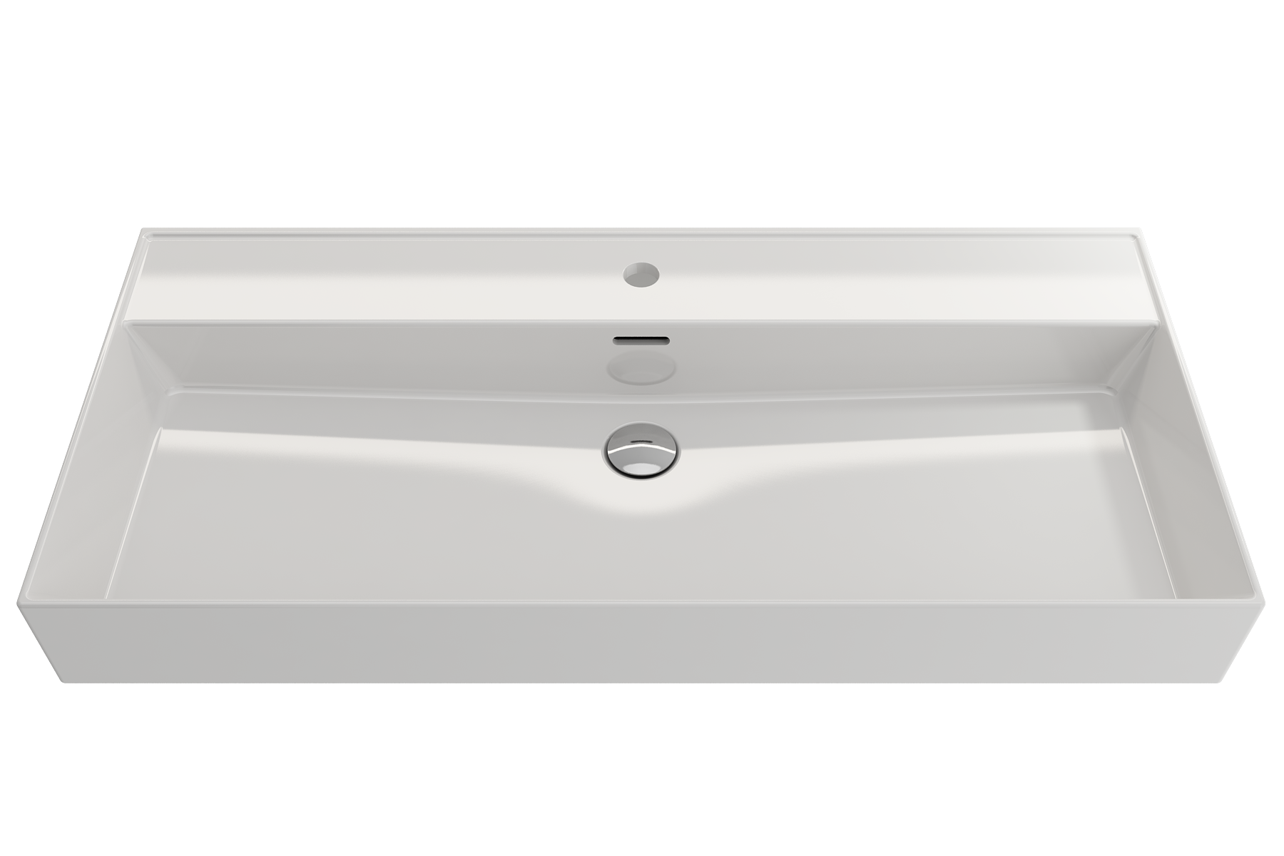 Bathroom sink with single-hole faucet setting. May be wall-hung, used with metal console legs, or counterset.