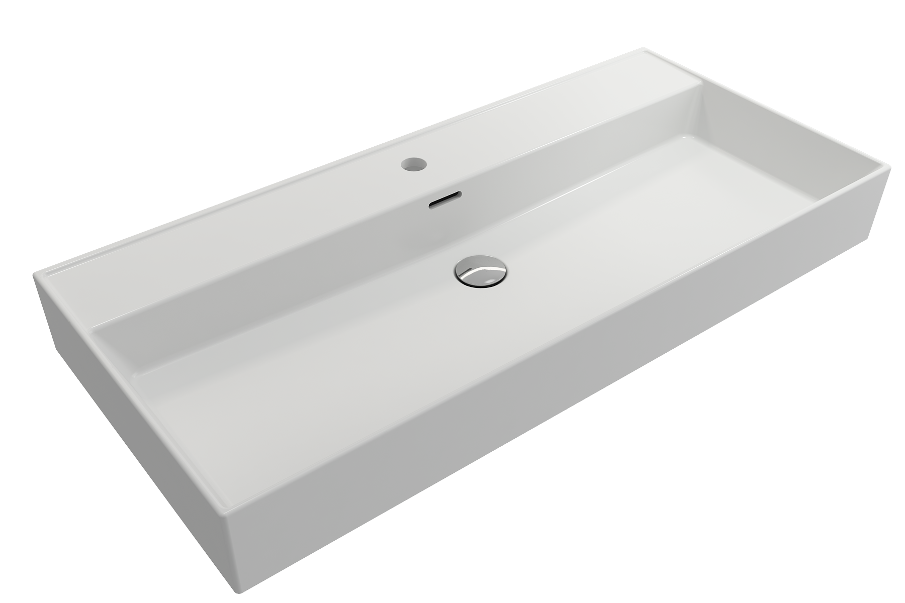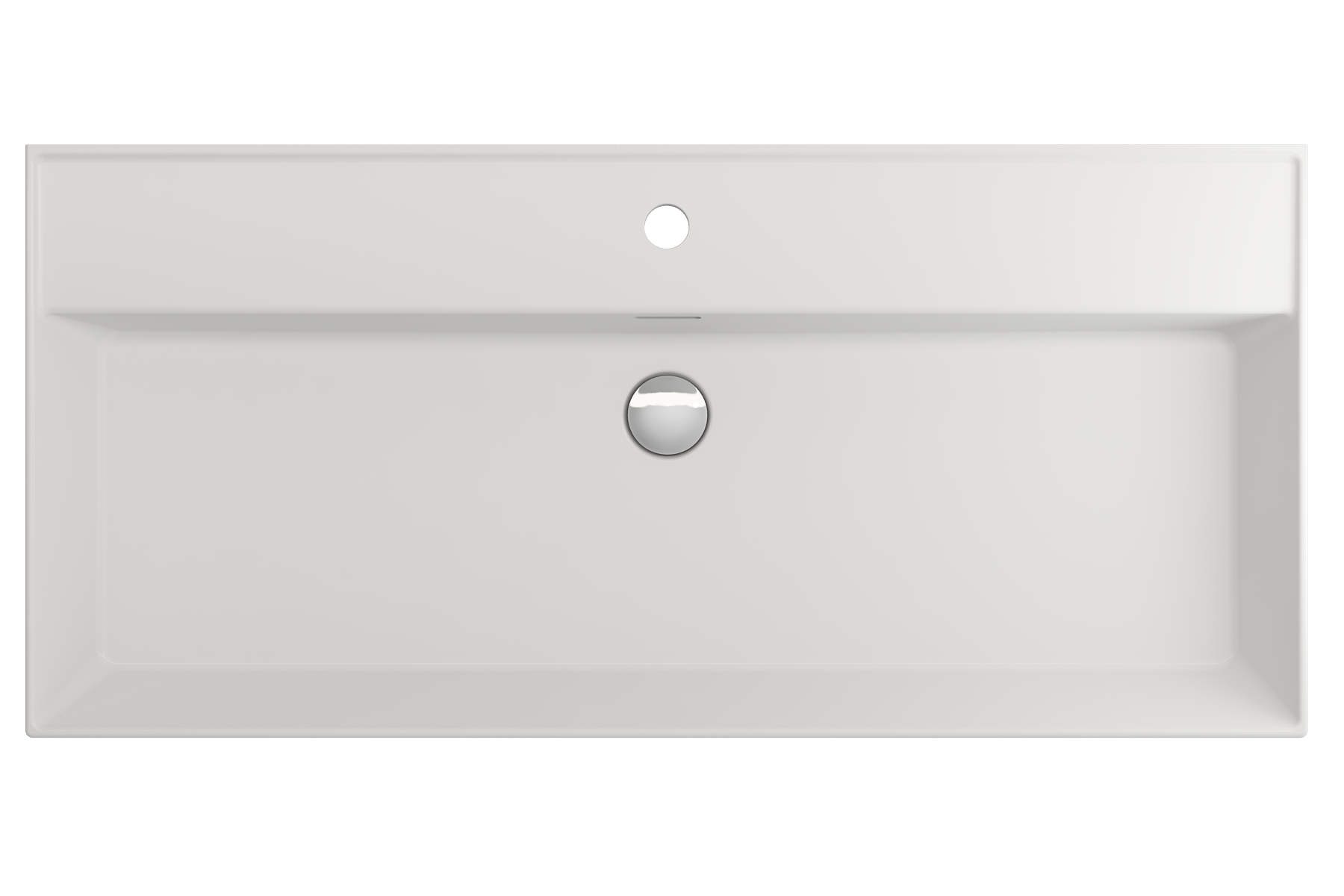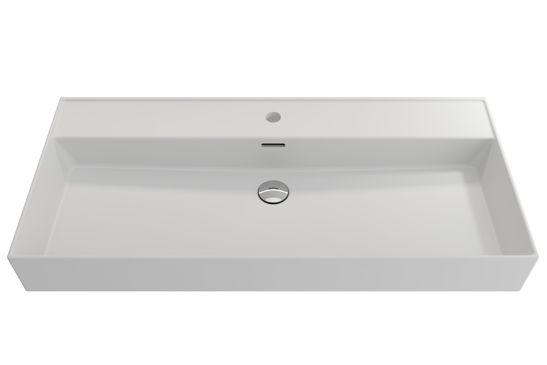 Bathroom sink with single-hole faucet setting. May be wall-hung, used with metal console legs, or counterset.