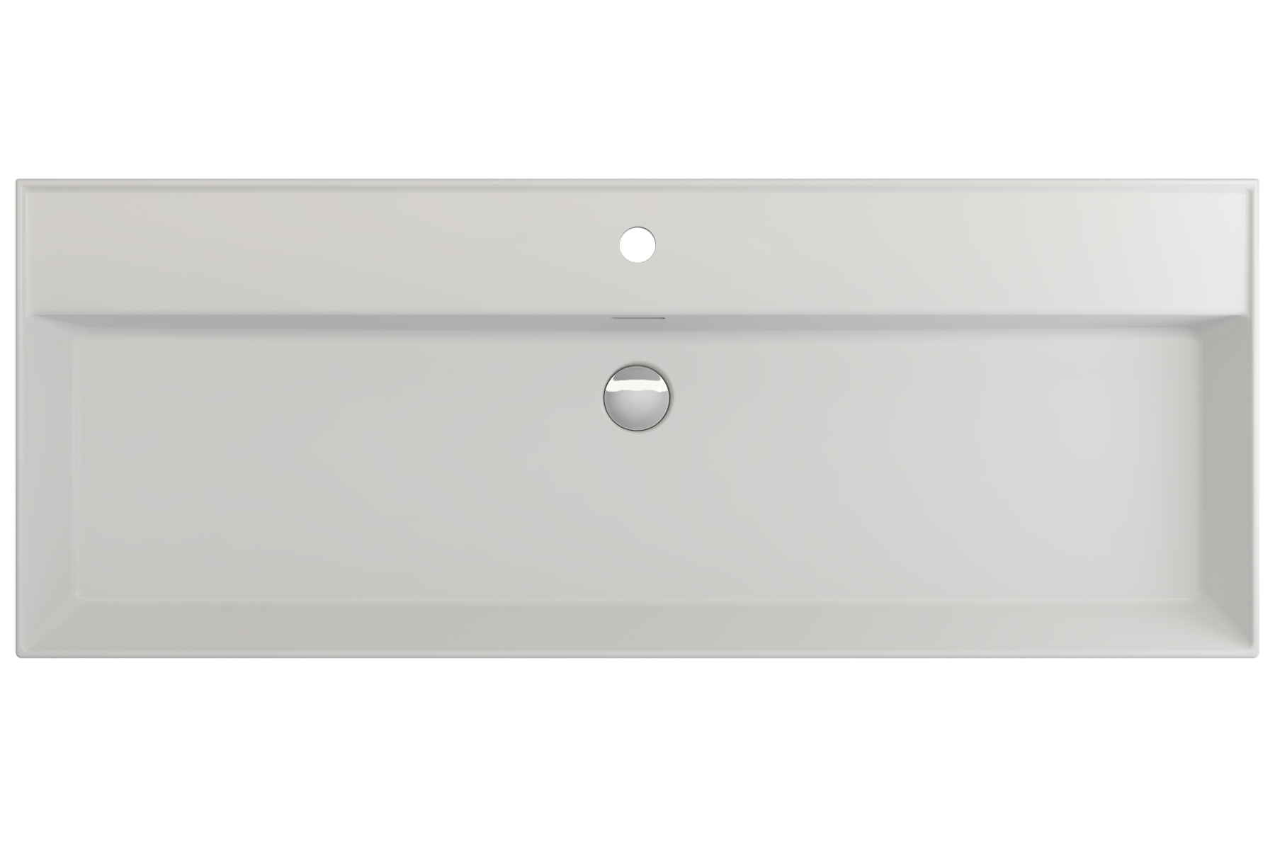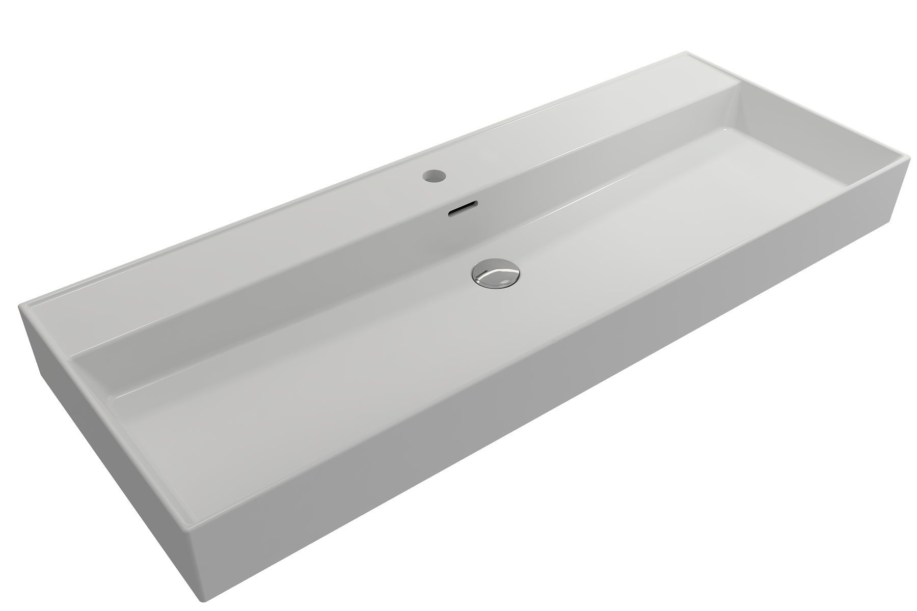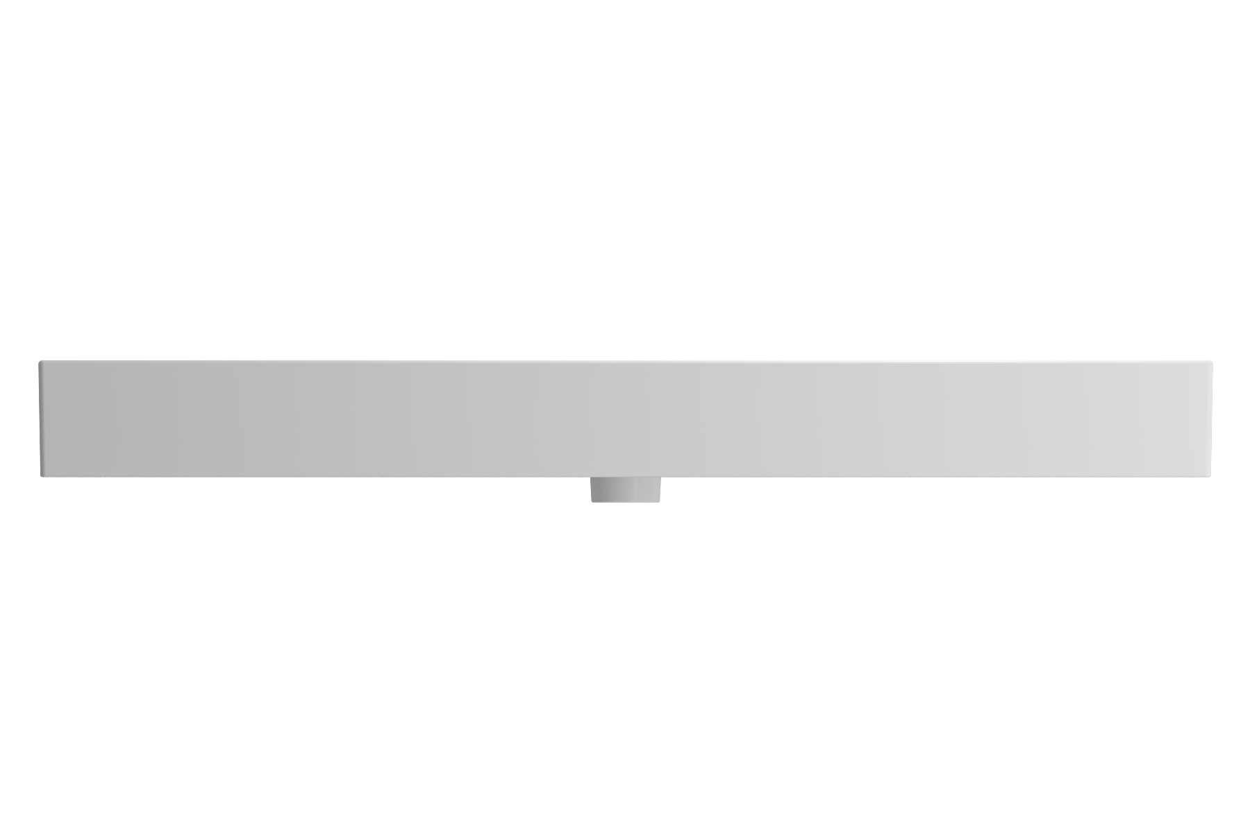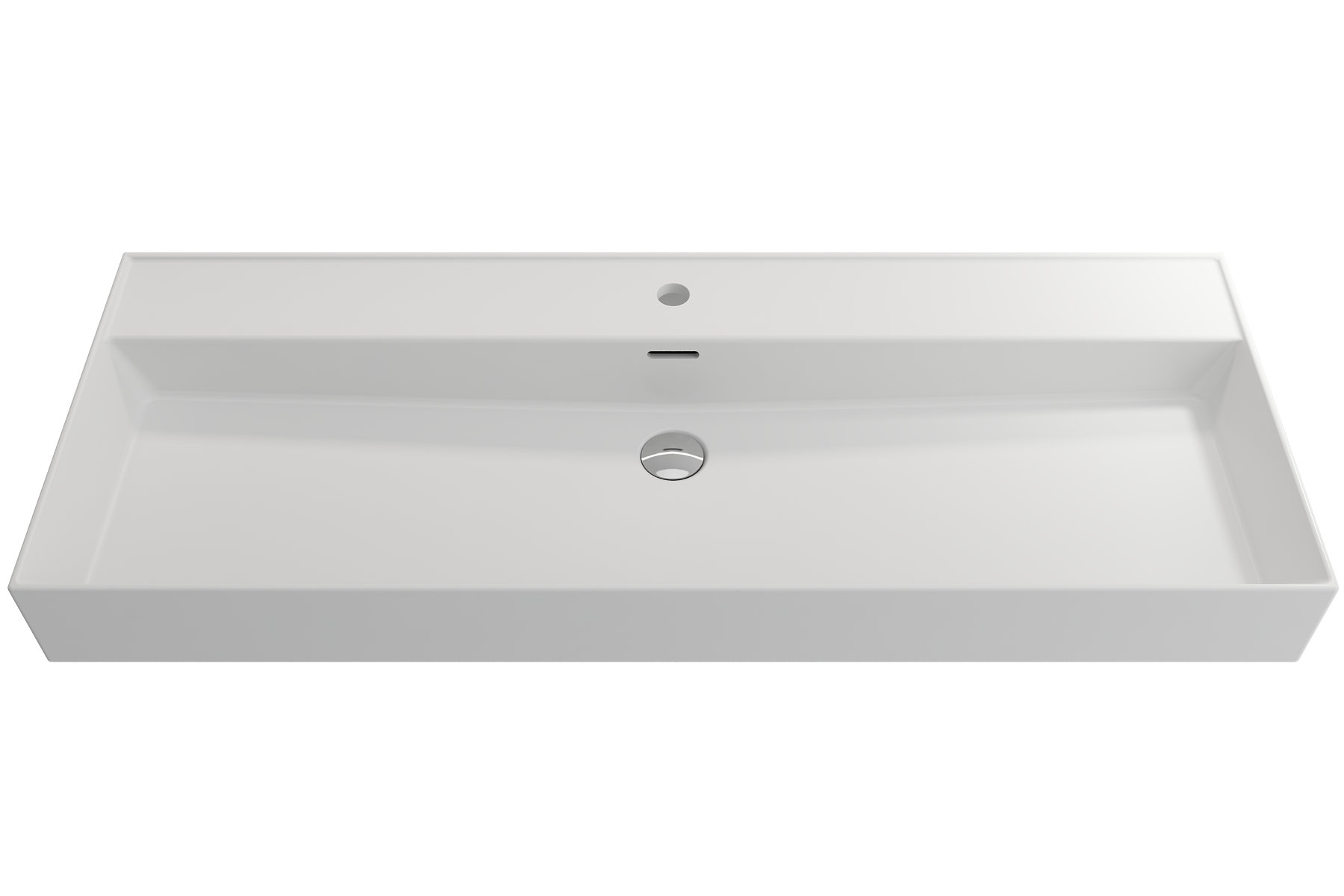 Bathroom sink with single-hole faucet setting. May be wall-hung, used with metal console legs, or counterset.