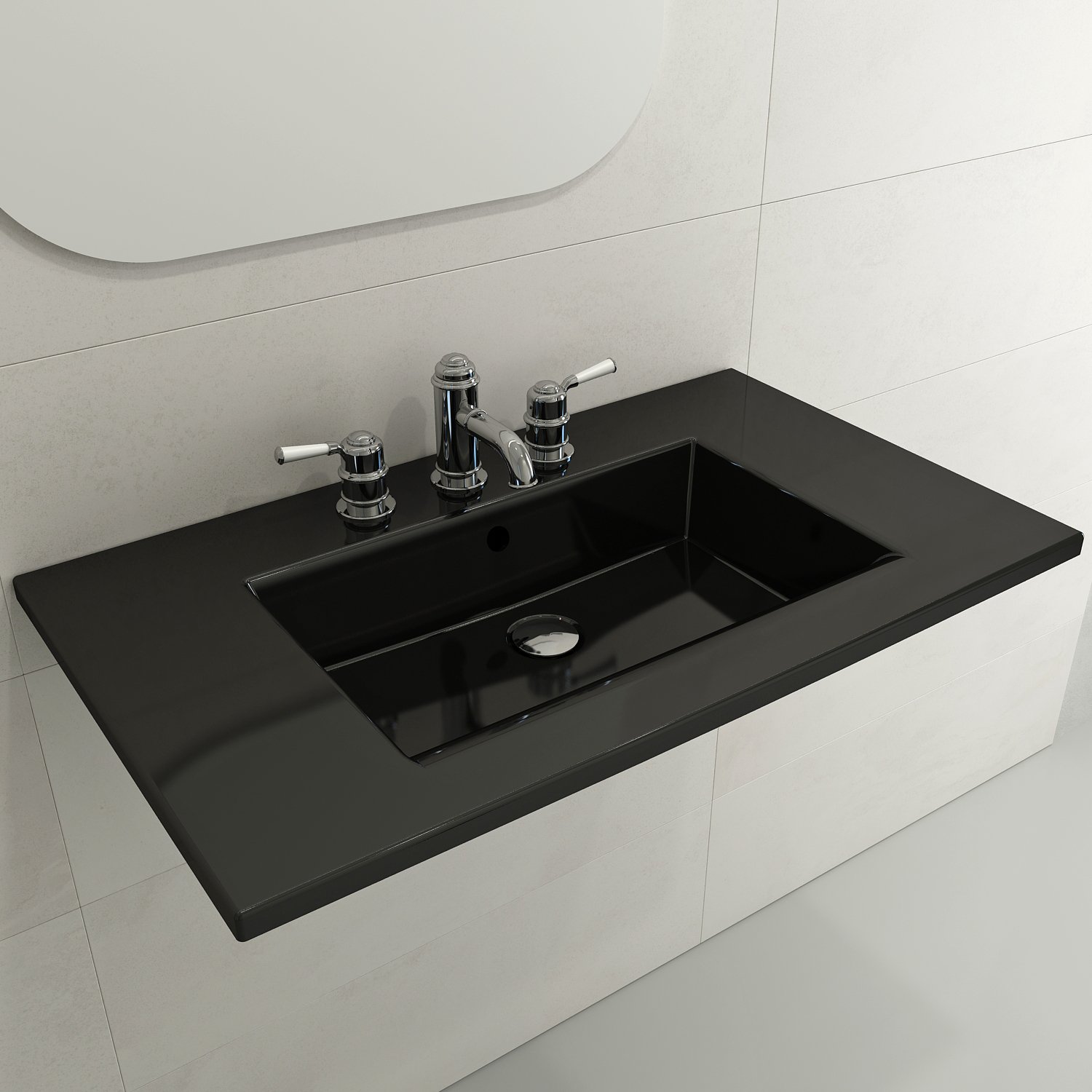 • Bathroom sink with single-hole faucet setting. May be wall-hung, used with metal console legs, or counterset.