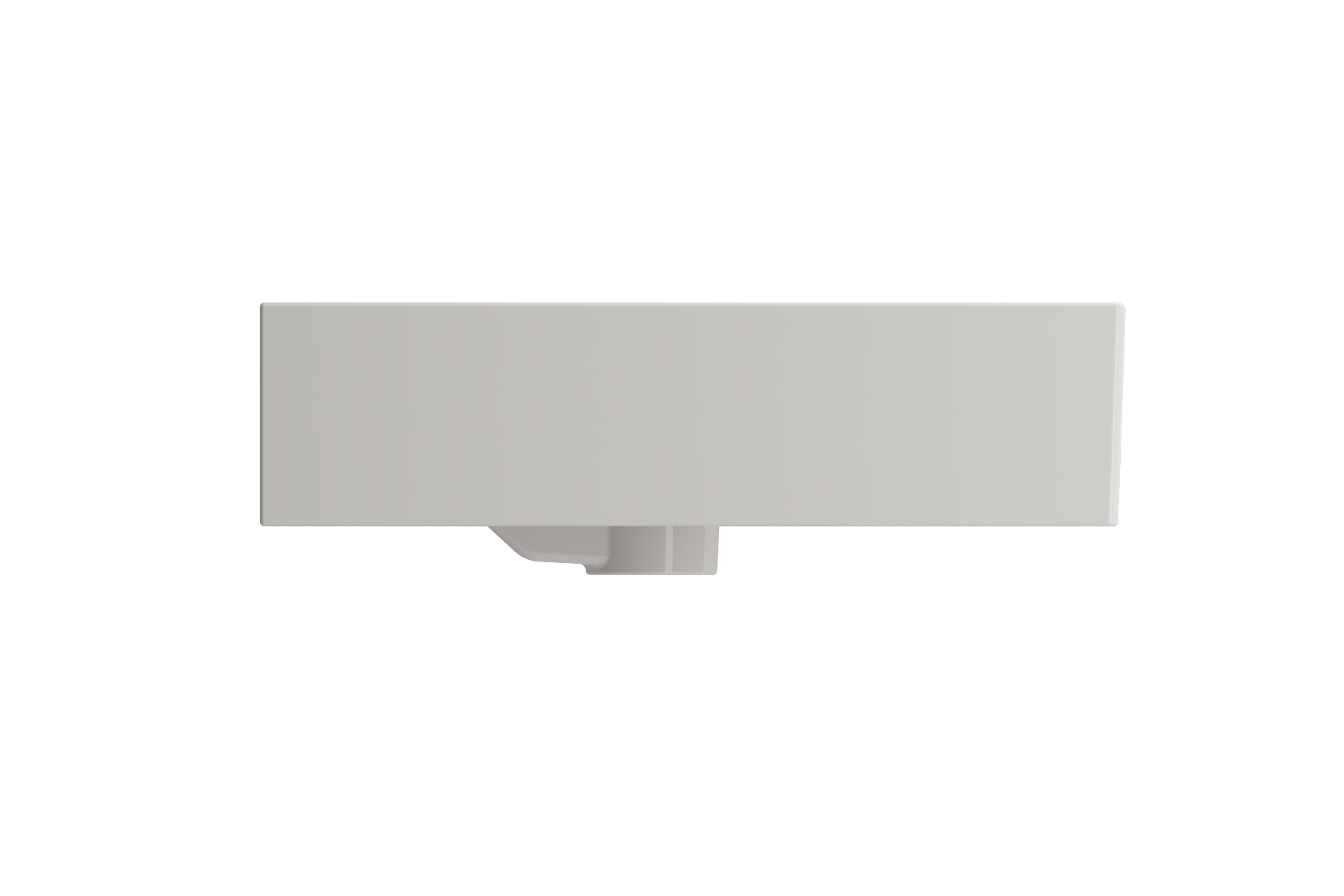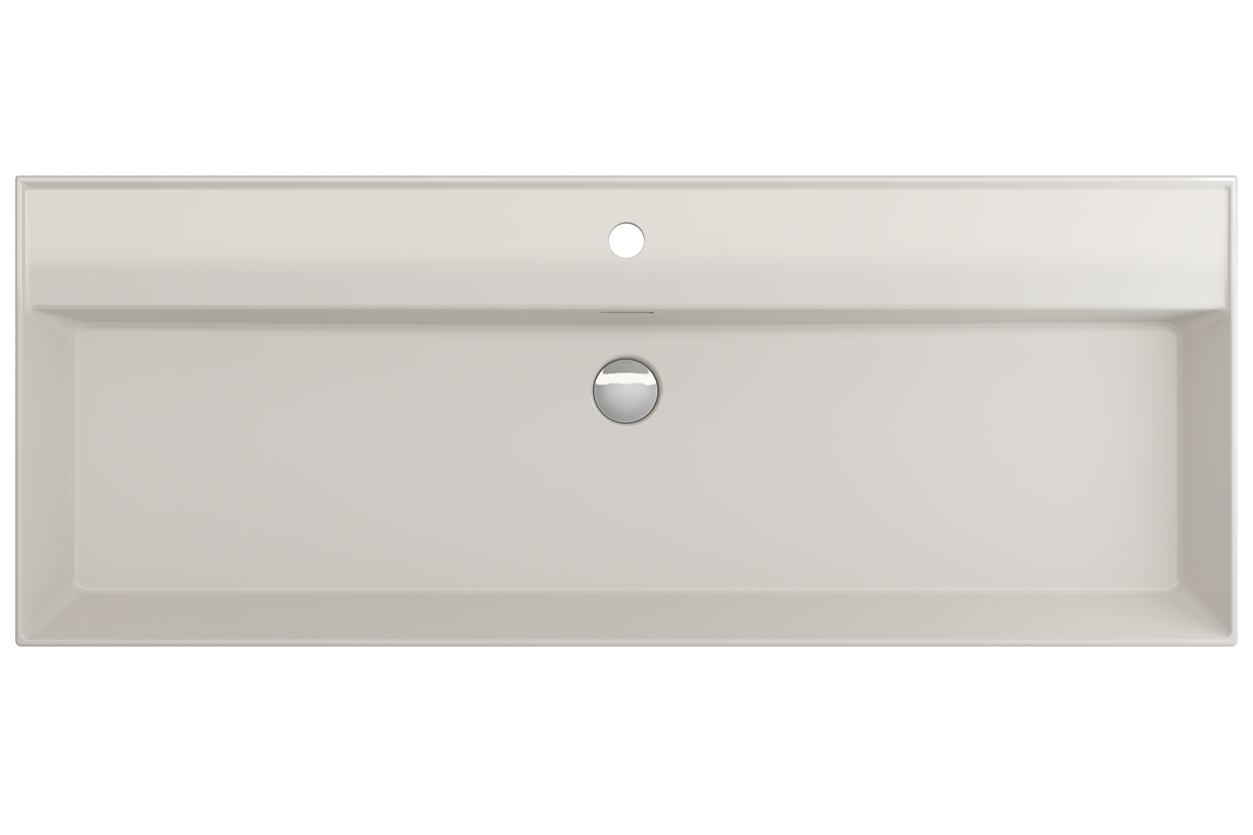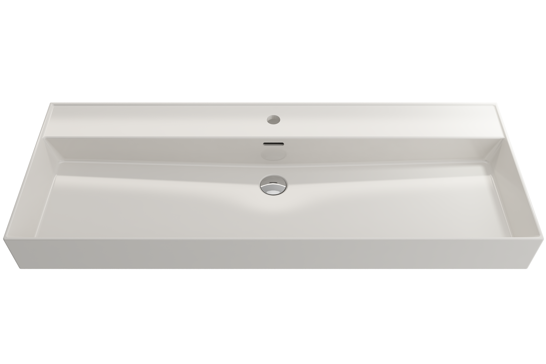 Bathroom sink with single-hole faucet setting. May be wall-hung, used with metal console legs, or counterset.