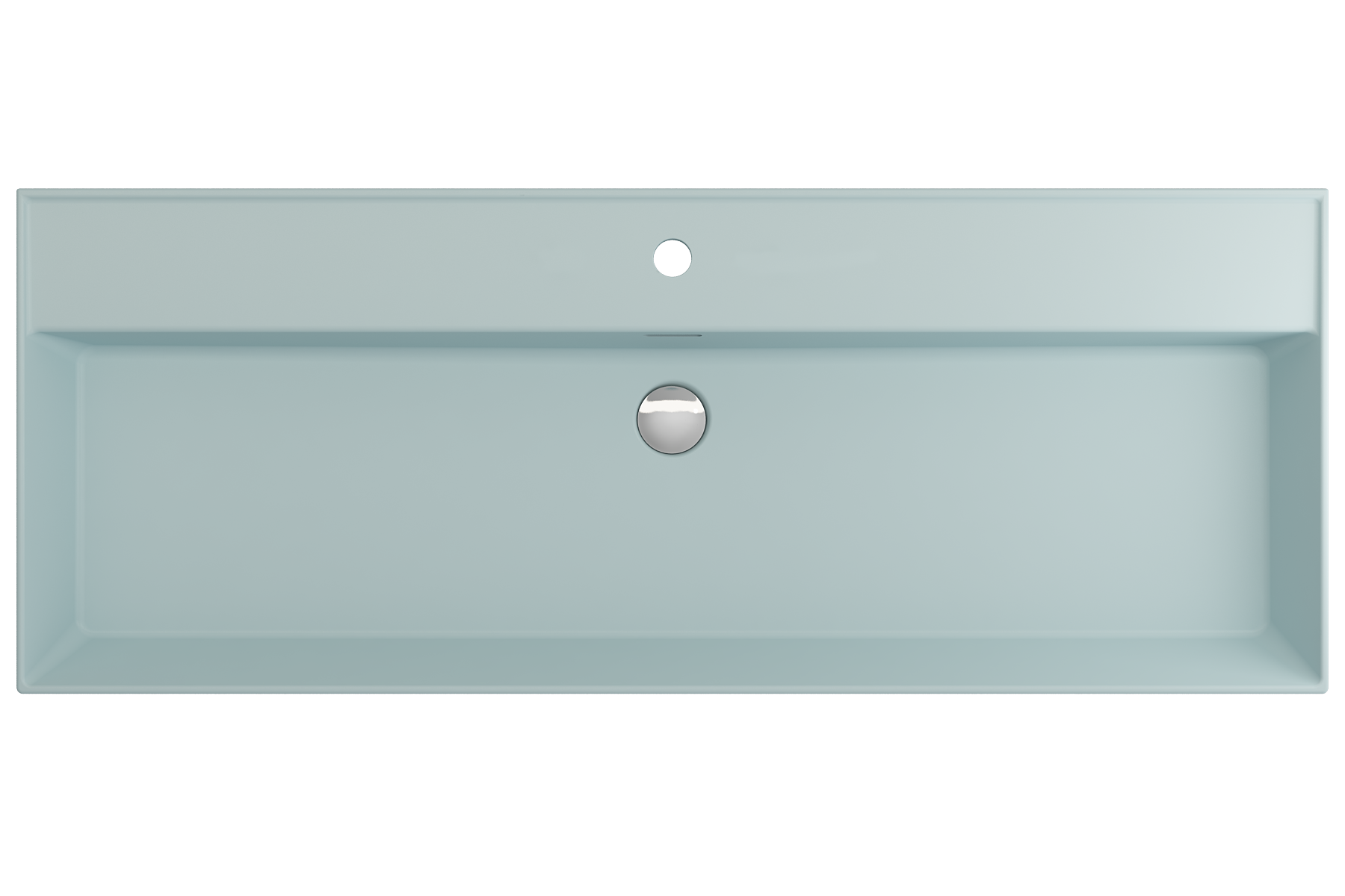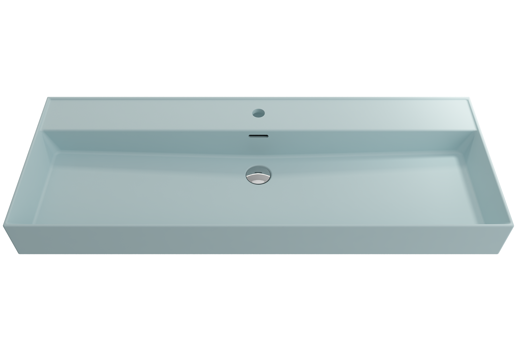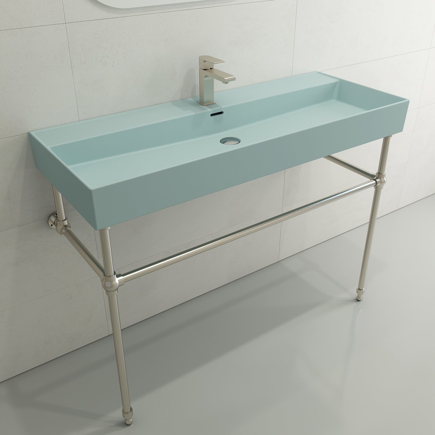 Bathroom sink with single-hole faucet setting. May be wall-hung, used with metal console legs, or counterset.