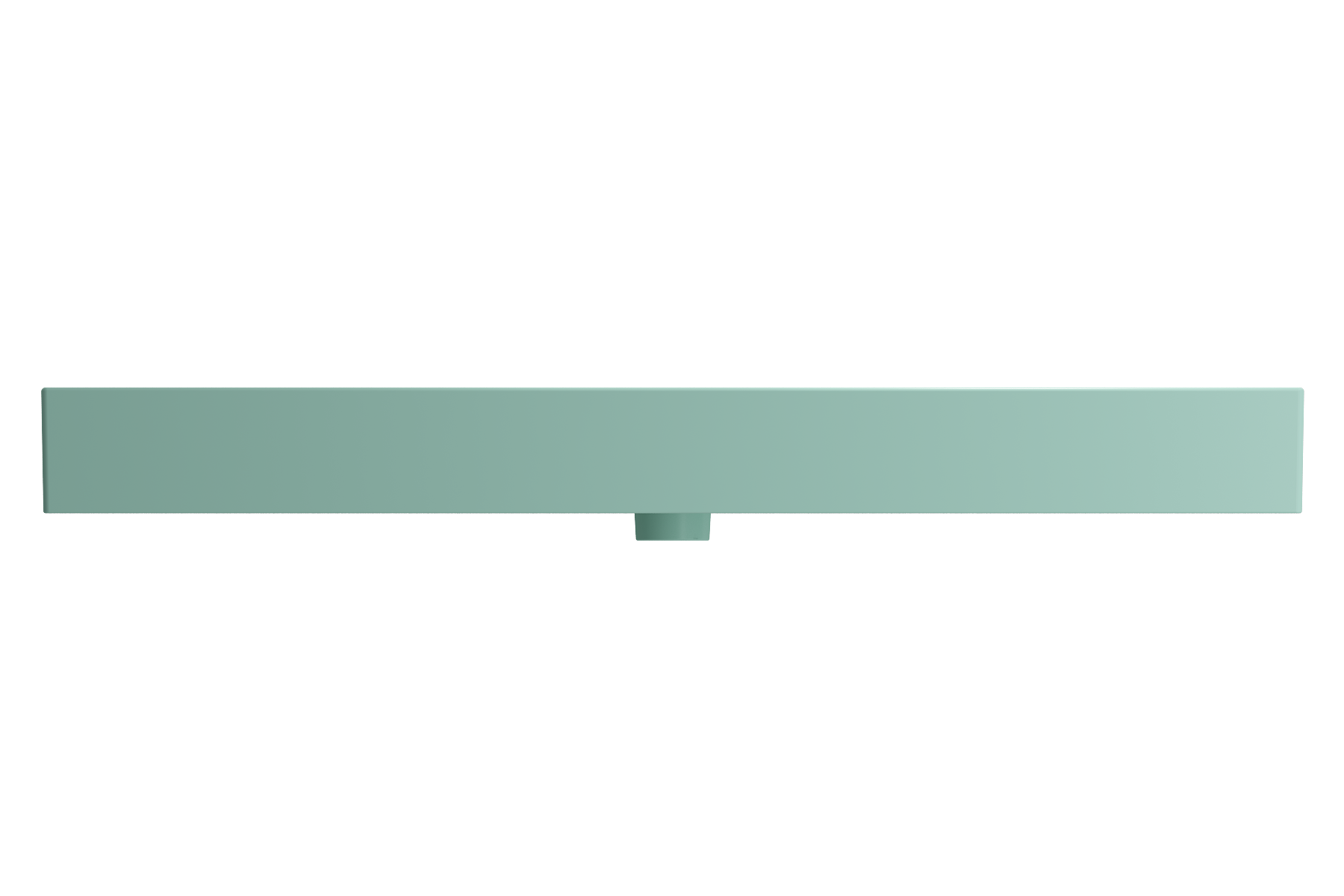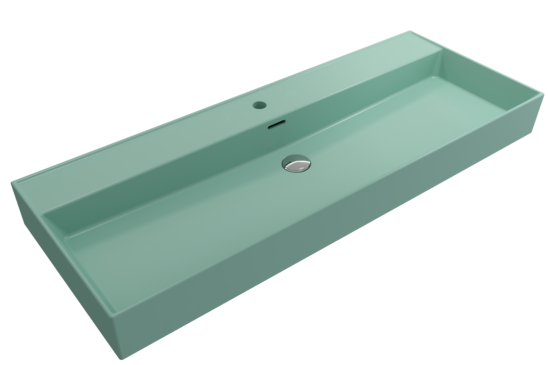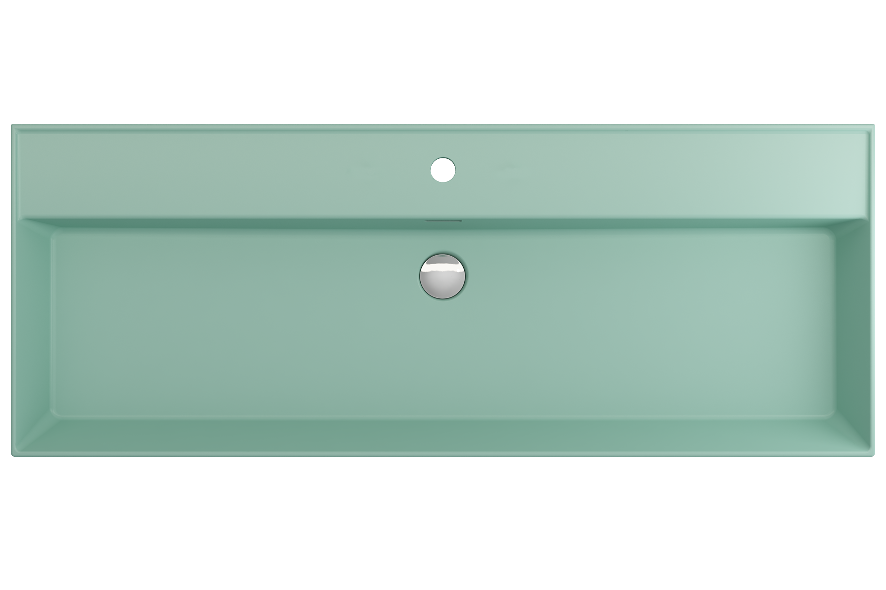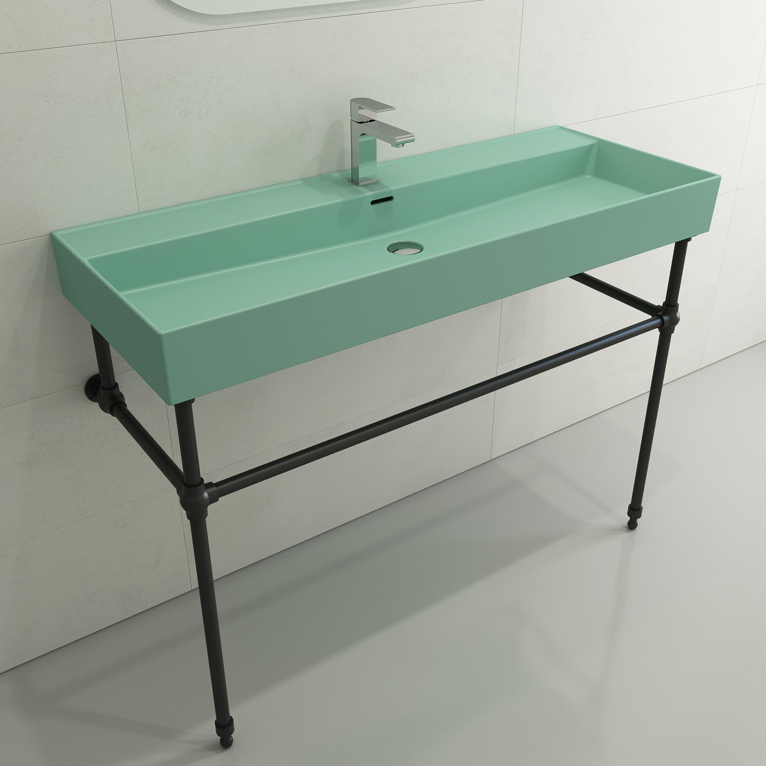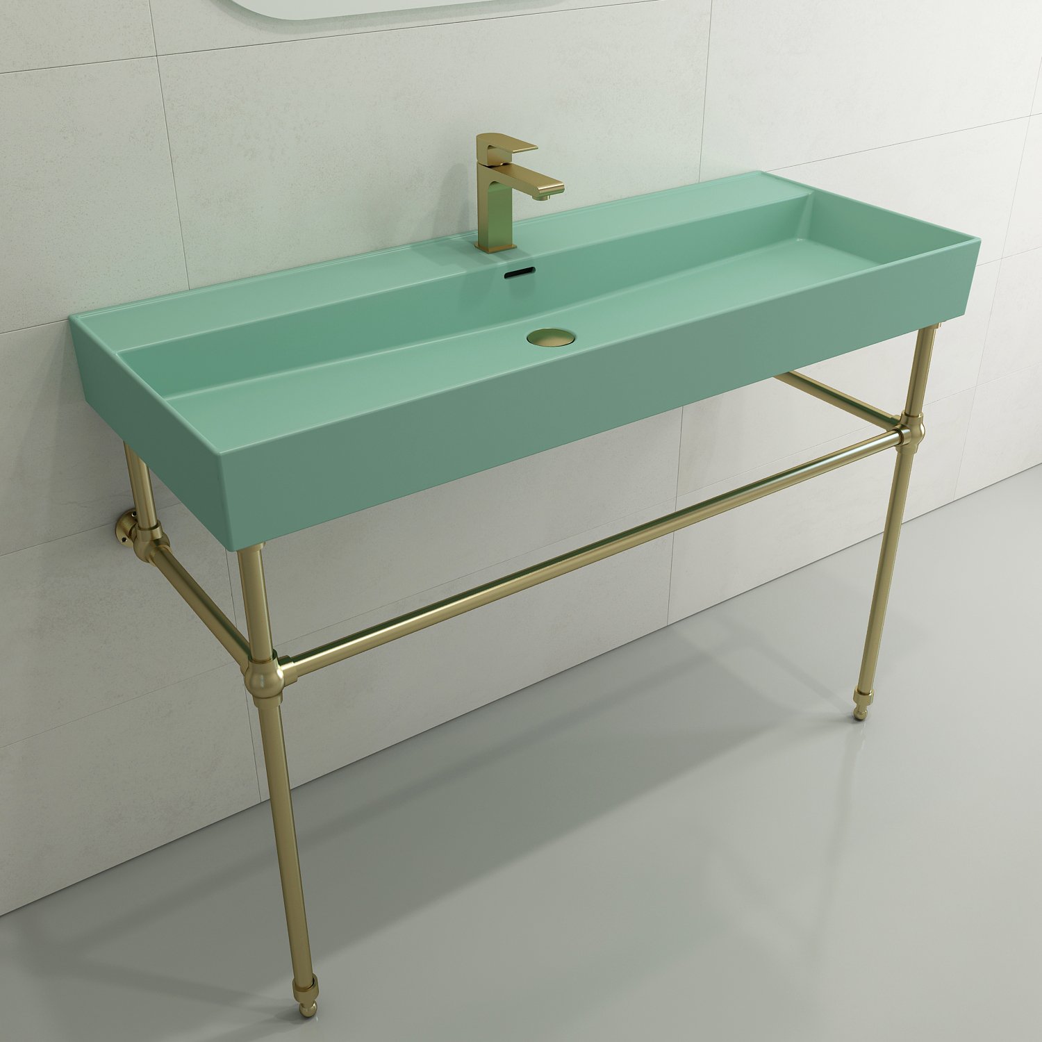 Bathroom sink with single-hole faucet setting. May be wall-hung, used with metal console legs, or counterset.