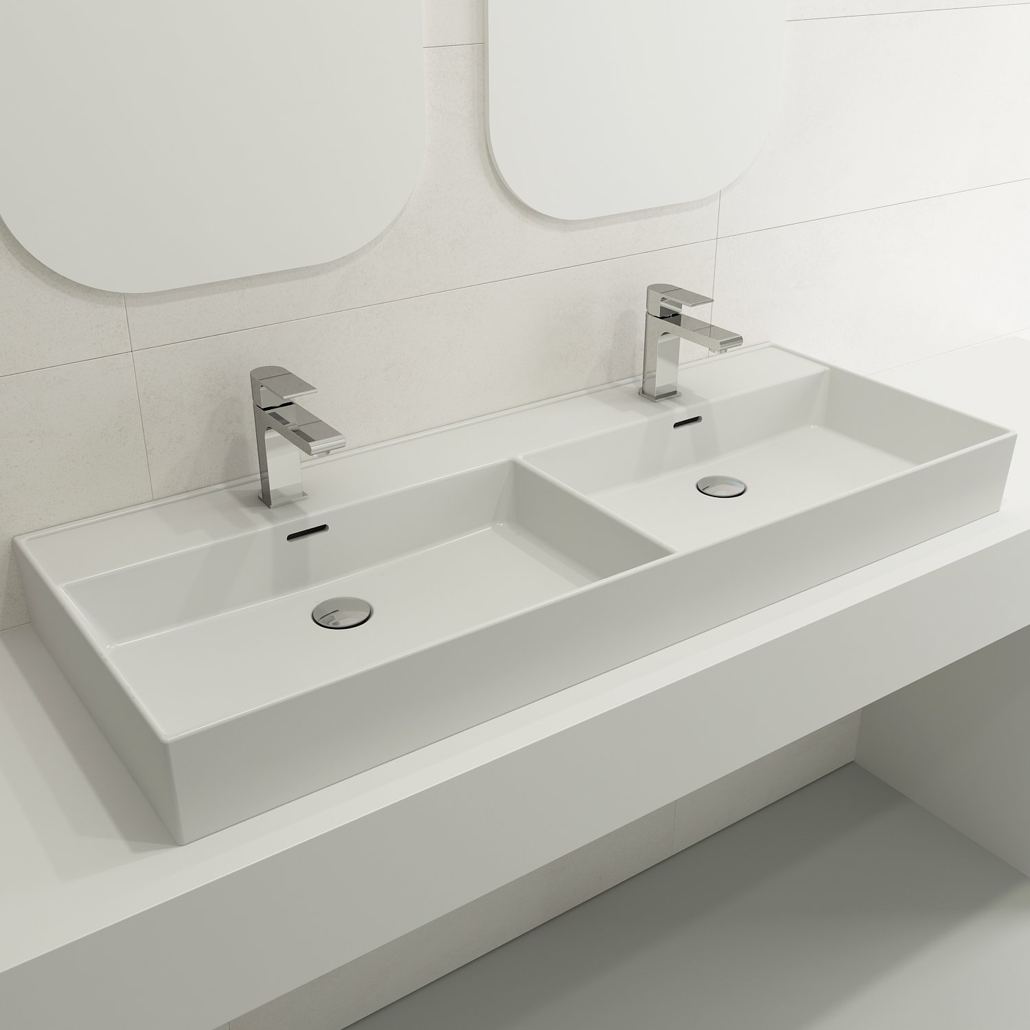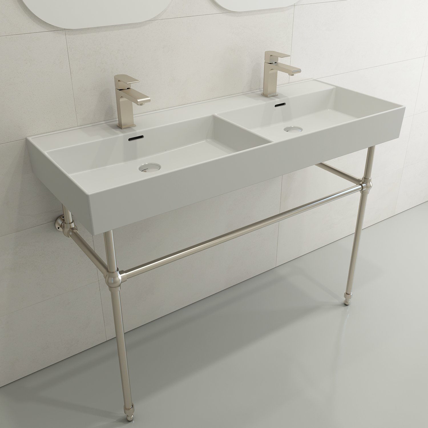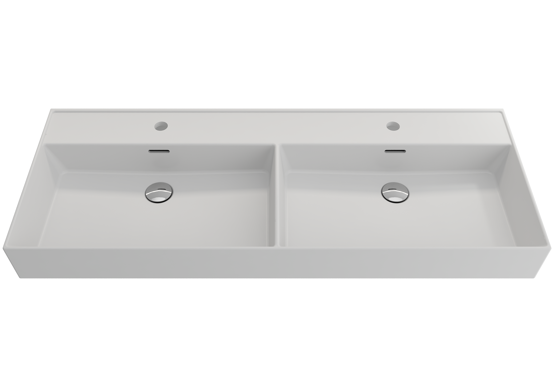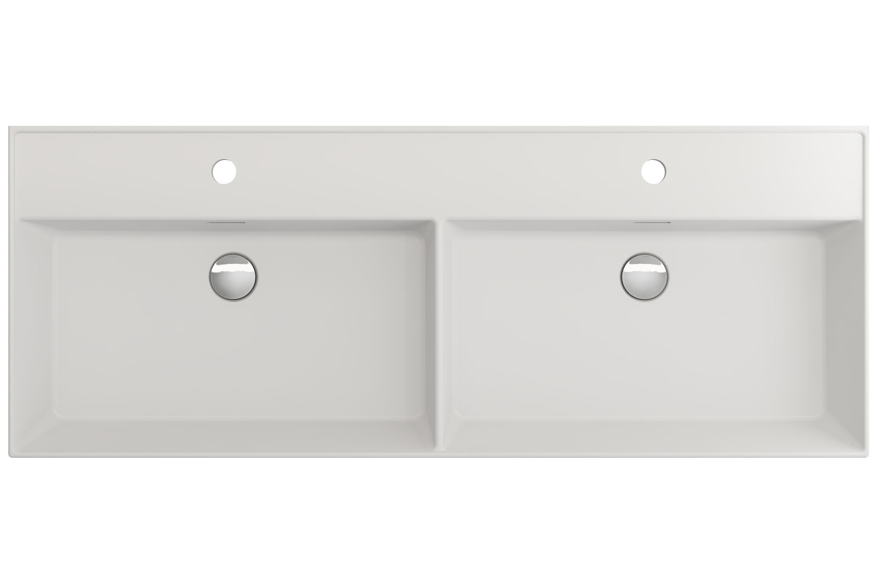 Bathroom sink with double basin and 2 single-hole faucet settings. May be wall-hung, used with metal console legs, or counterset.