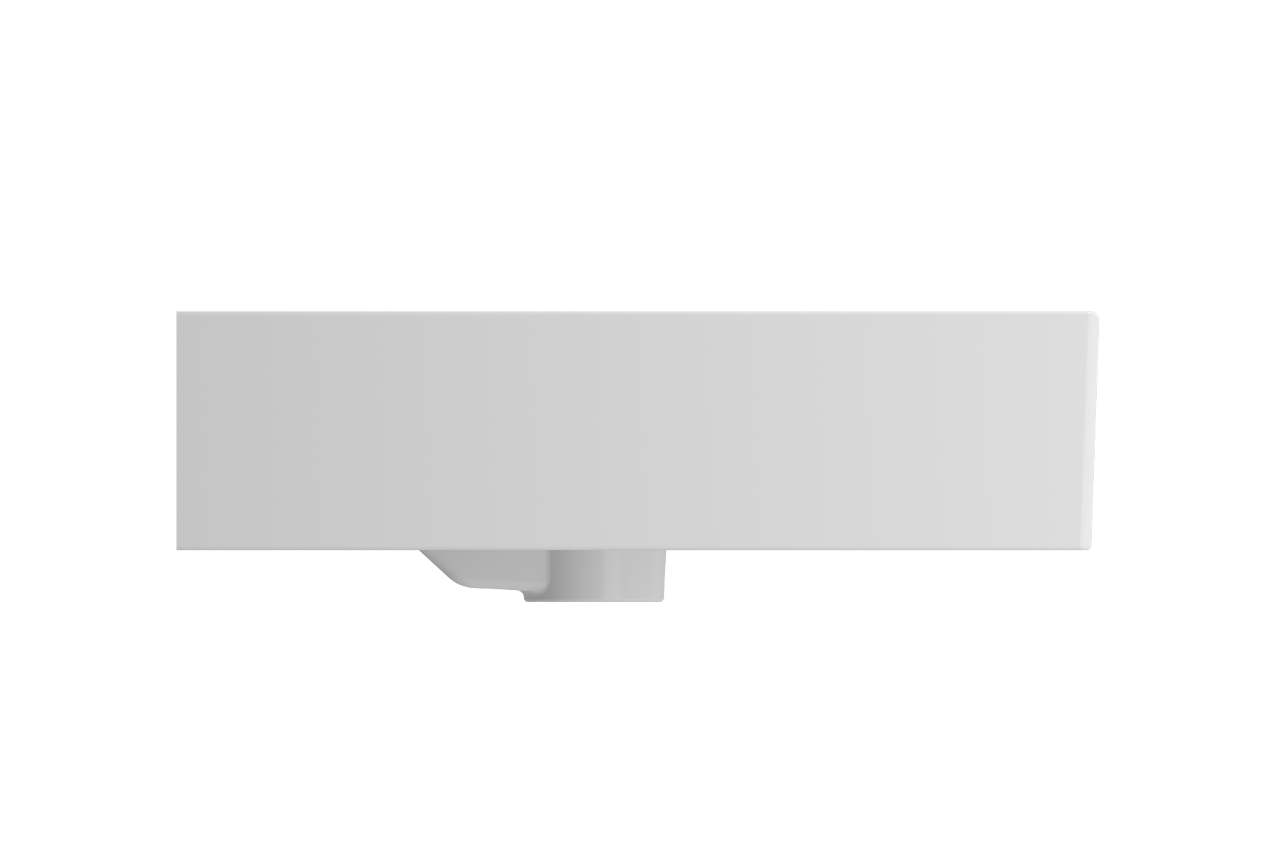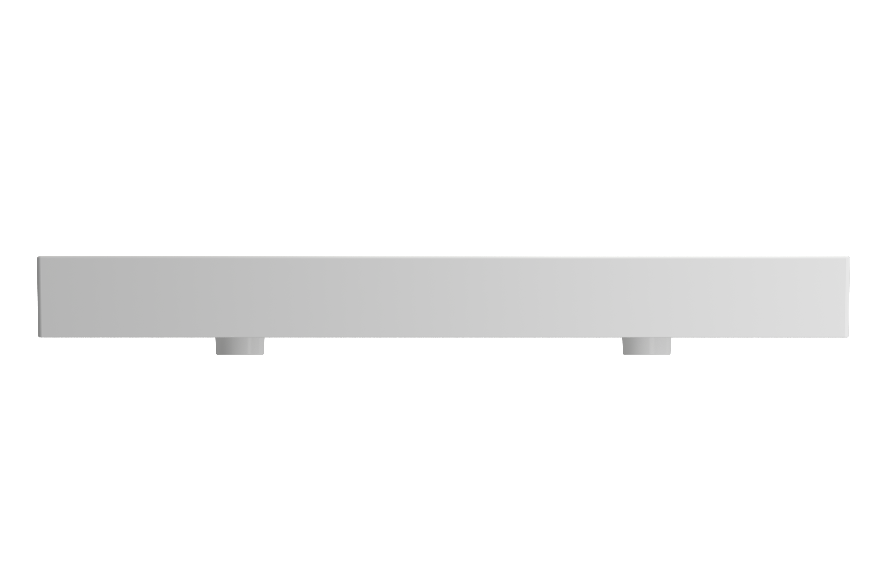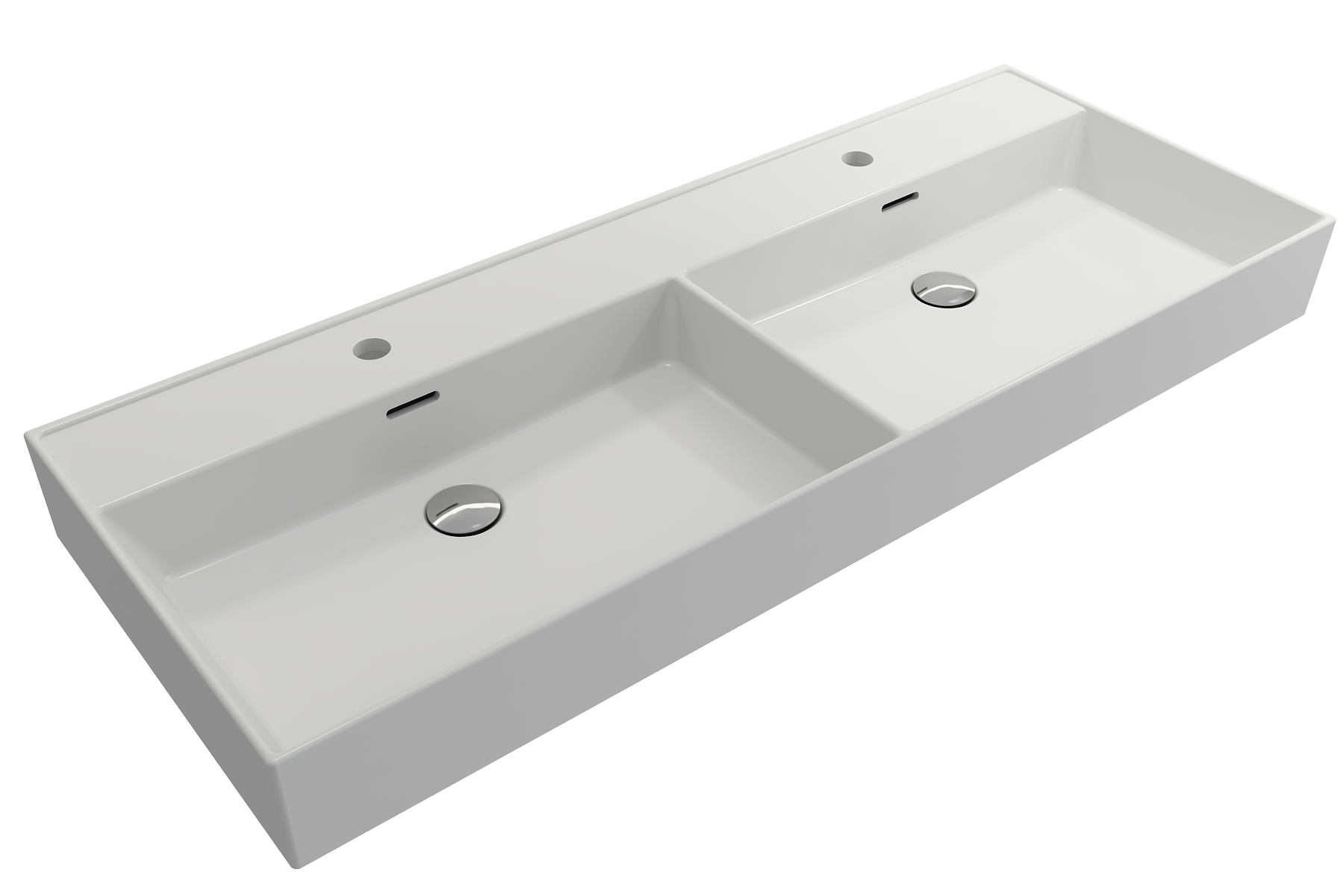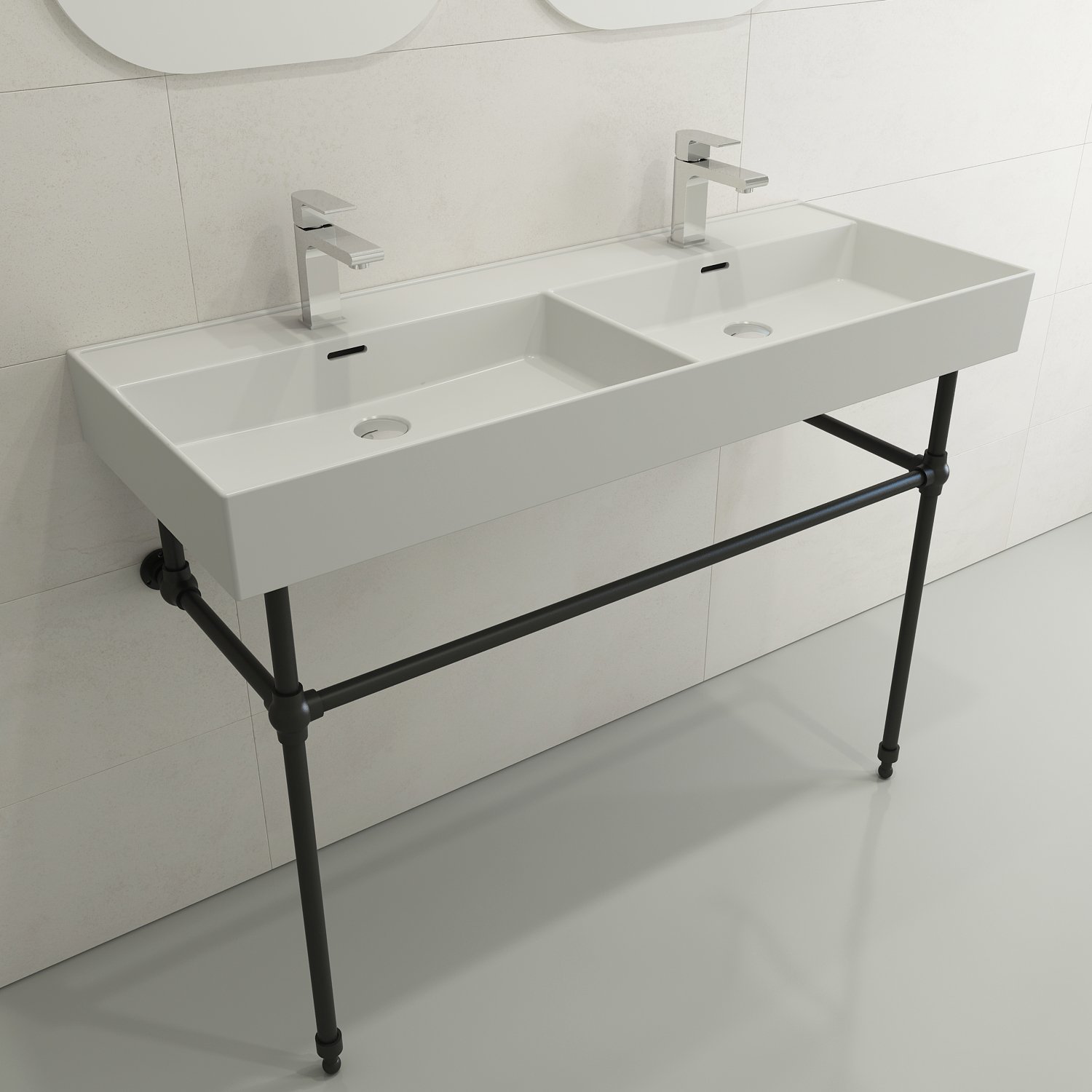 Bathroom sink with double basin and 2 single-hole faucet settings. May be wall-hung, used with metal console legs, or counterset.