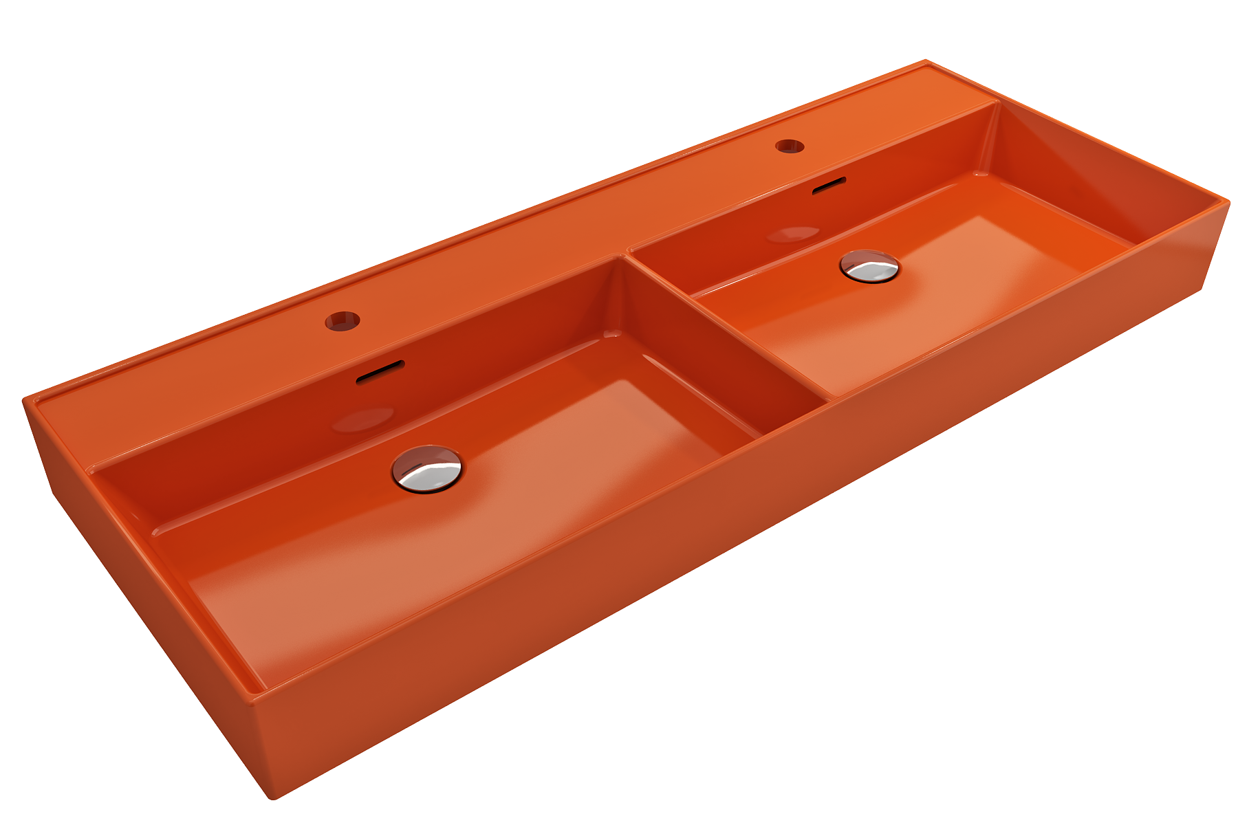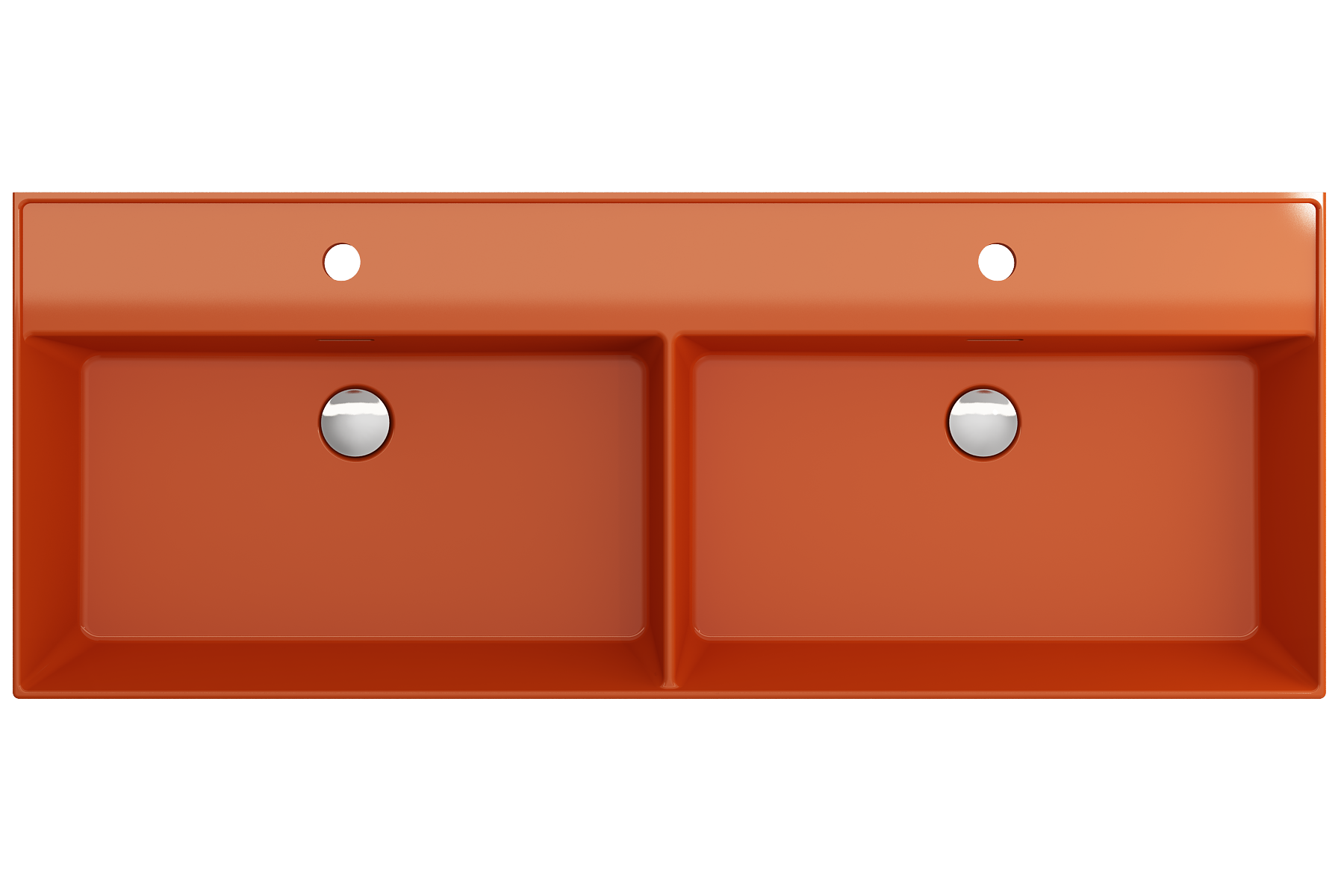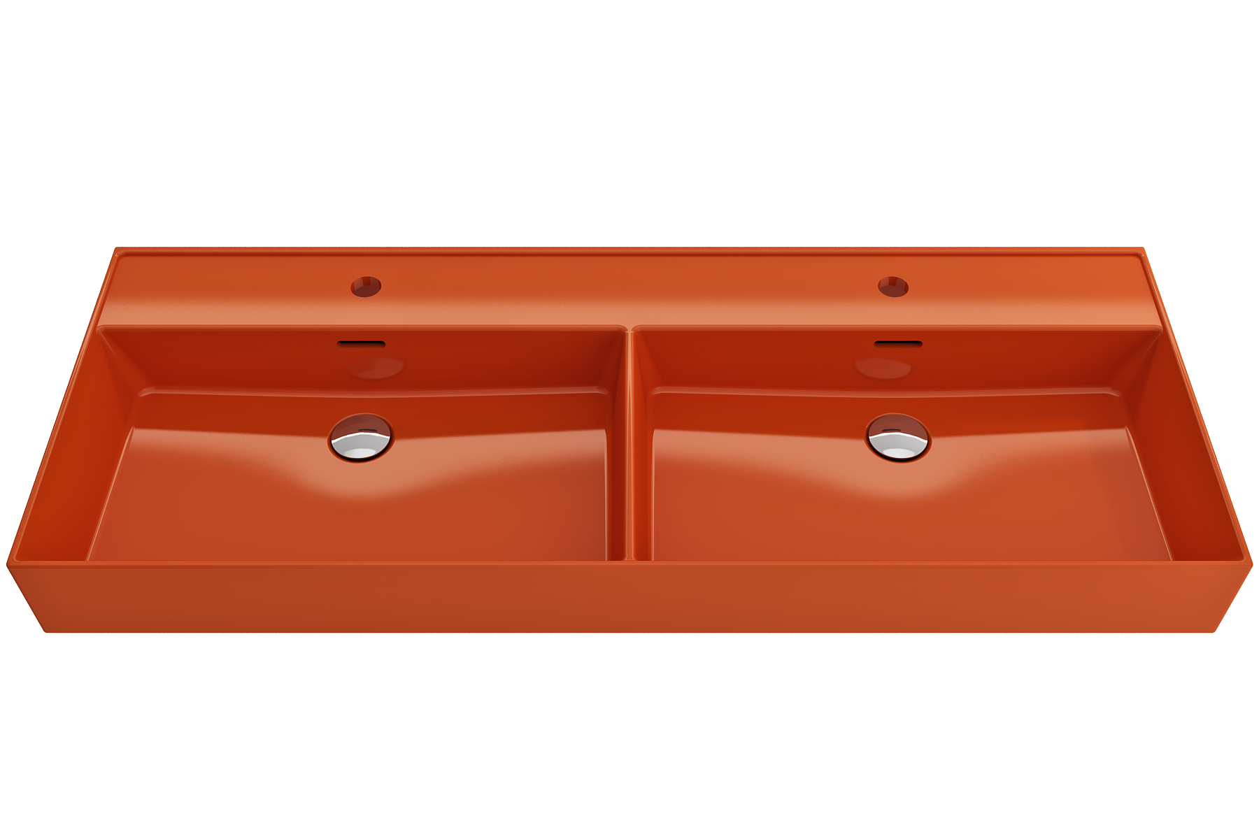 Bathroom sink with double basin and 2 single-hole faucet settings. May be wall-hung, used with metal console legs, or counterset.