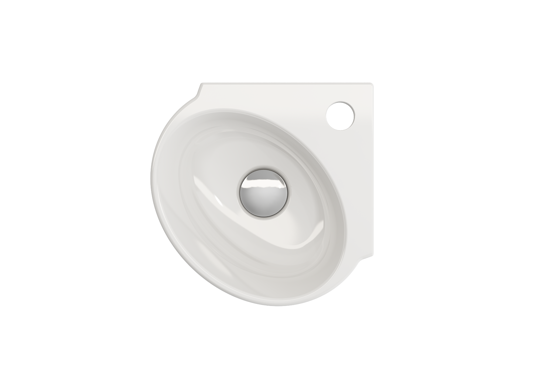 Wall-hung corner sink with single-hole faucet setting and overflow.