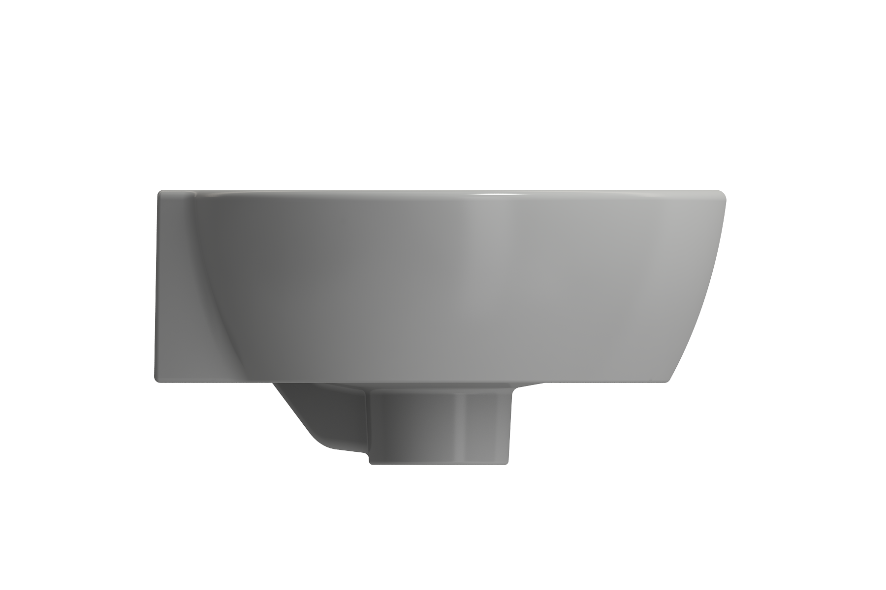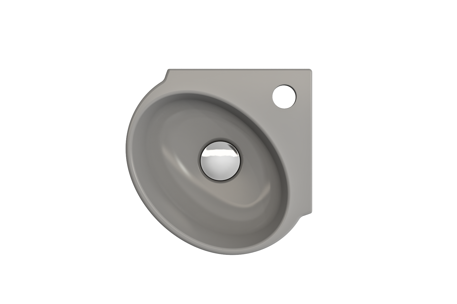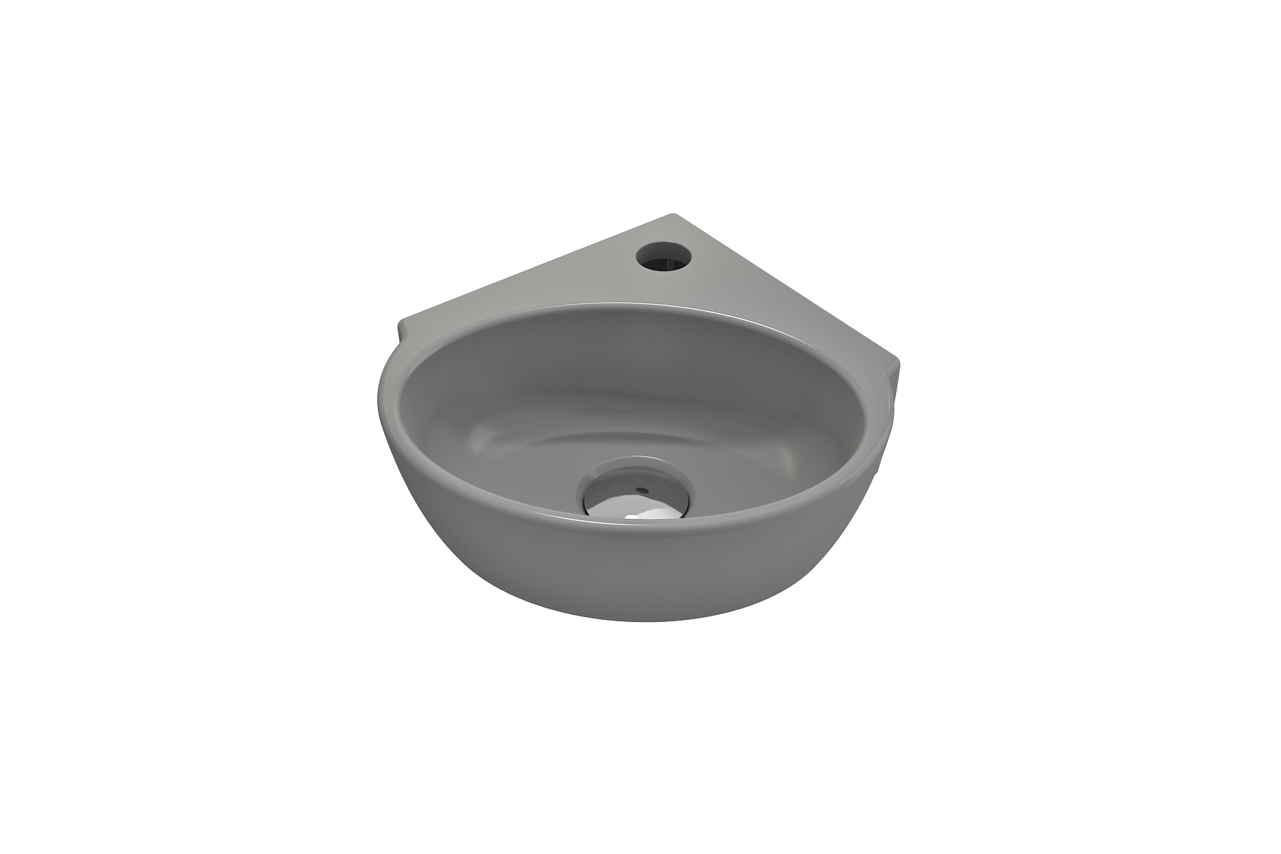 Wall-hung corner sink with single-hole faucet setting and overflow.