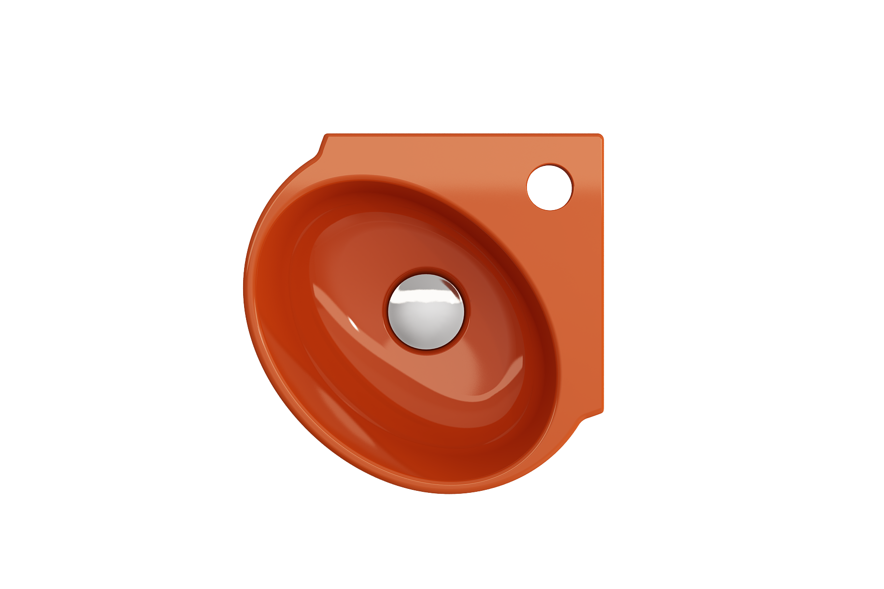 Wall-hung corner sink with single-hole faucet setting and overflow.