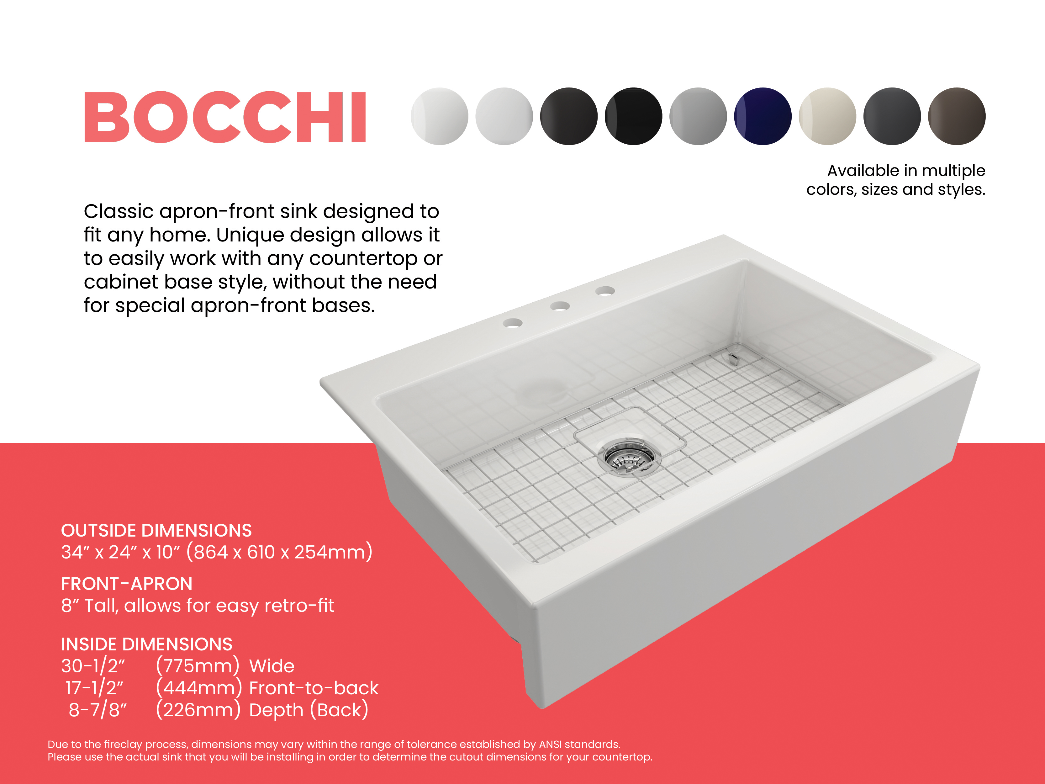 BOCCHI Farmhouse Sinks bring back the ultimate material to your kitchen. Fireclay, a 100% natural organic and recyclable material used by craftsman for centuries to create timeless appliances has now returned to your kitchen. With the firing in our kilns up to 2000°F temperatures, Fireclay becomes the most durable material used in today's kitchens. Thus, dealing with extreme heat coming from pots and pans is definitely not a problem. Due to their special glaze coating fused with the fireclay body, our sinks have a non-porous, uniform, scratch and stain resistant surface. With its protective bottom grid and distinctive looks, BOCCHI Farmhouse Sinks are truly crafted to match your design and functional desires.