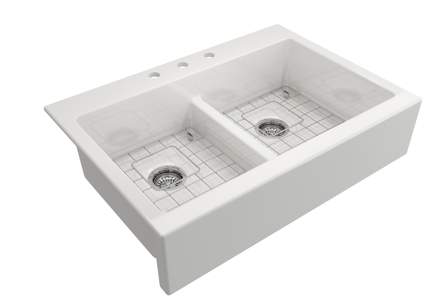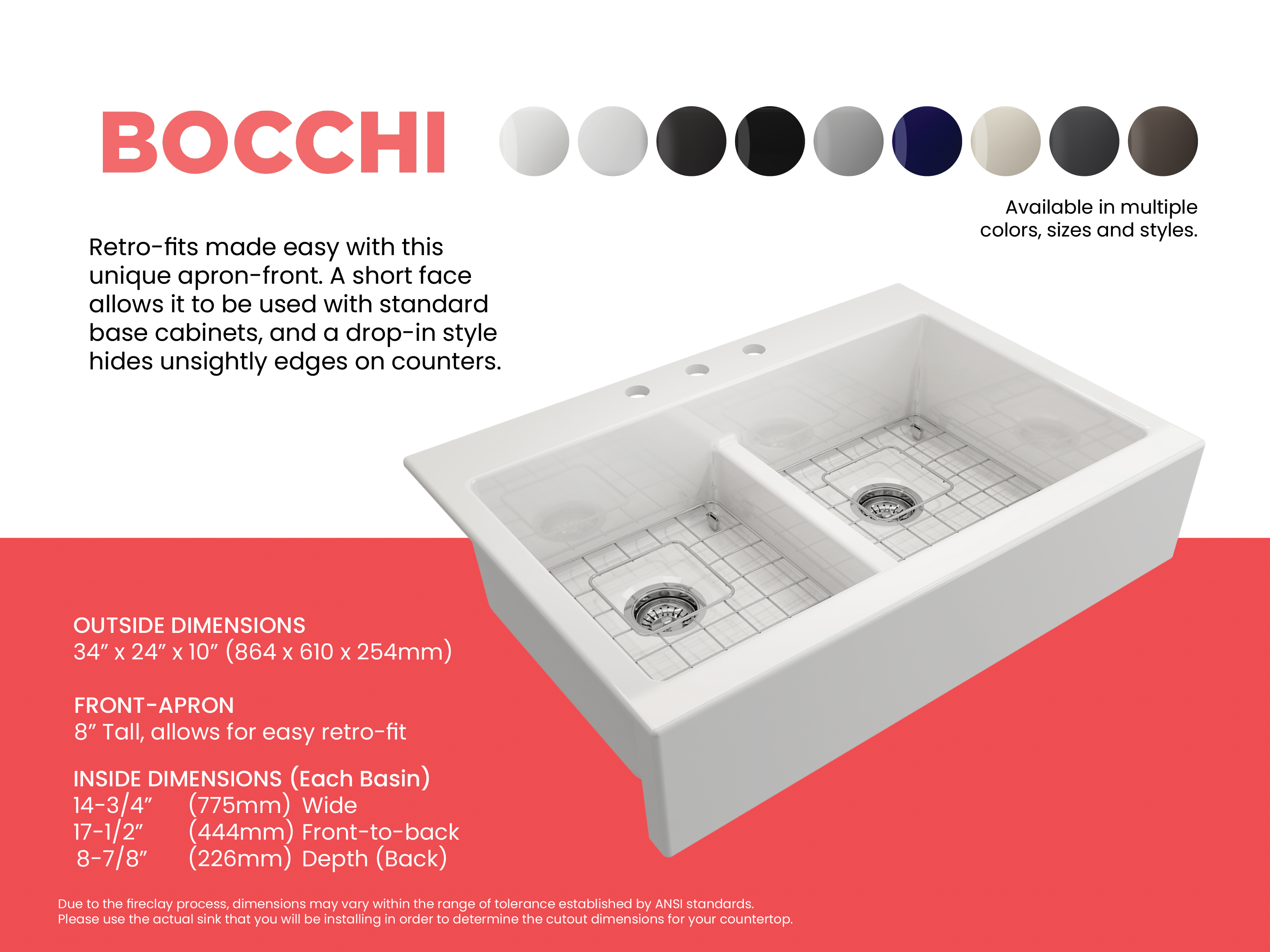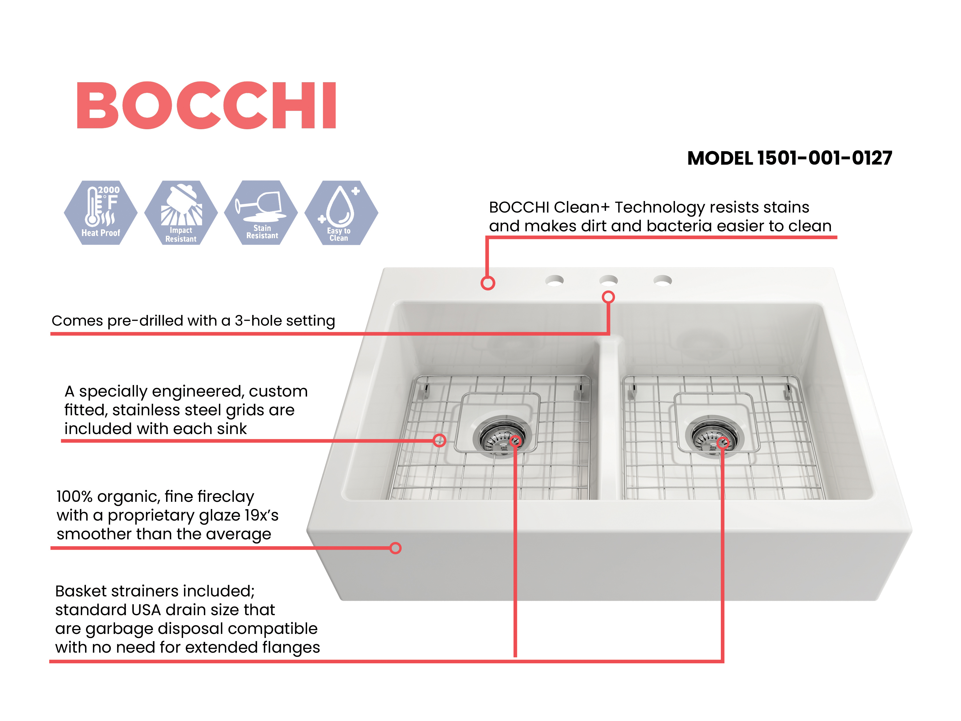 BOCCHI Farmhouse Sinks bring back the ultimate material to your kitchen. Fireclay, a 100% natural organic and recyclable material used by craftsman for centuries to create timeless appliances has now returned to your kitchen. With the firing in our kilns up to 2000°F temperatures, Fireclay becomes the most durable material used in today's kitchens. Thus, dealing with extreme heat coming from pots and pans is definitely not a problem. Due to their special glaze coating fused with the fireclay body, our sinks have a non-porous, uniform, scratch and stain resistant surface. With its protective bottom grid and distinctive looks, BOCCHI Farmhouse Sinks are truly crafted to match your design and functional desires.
