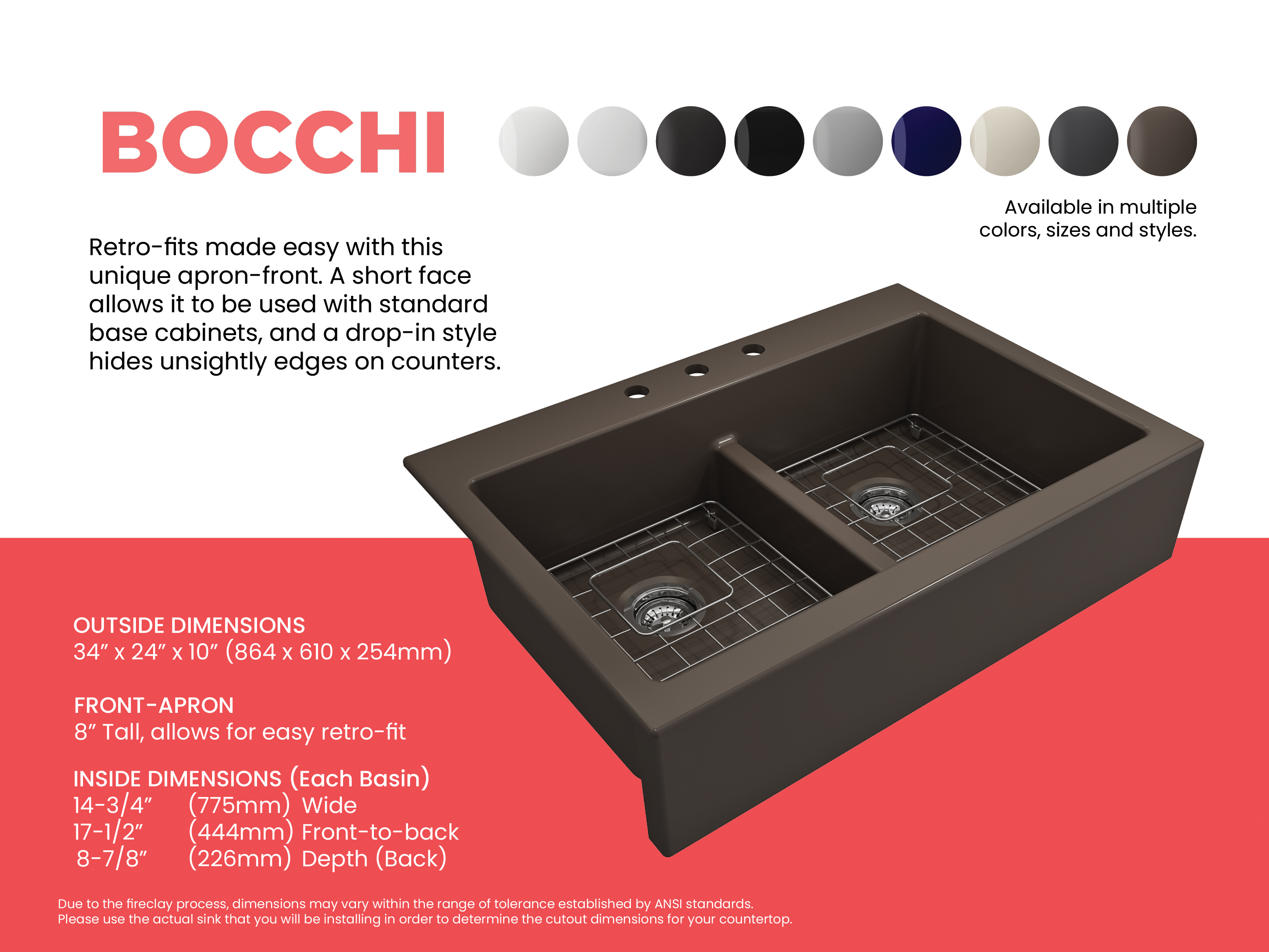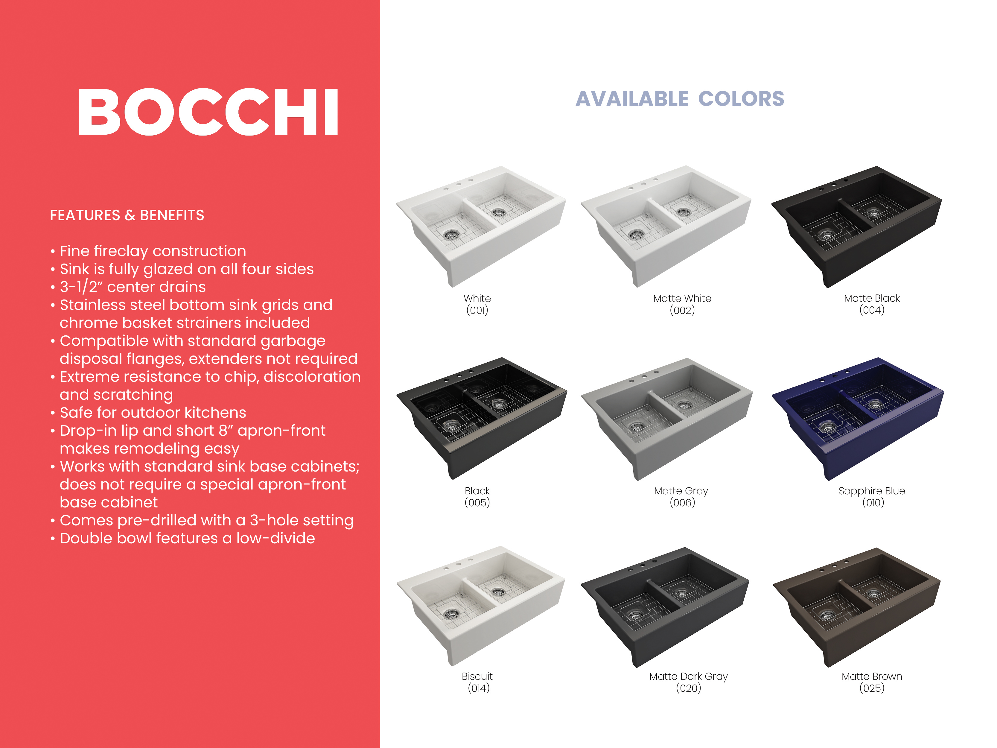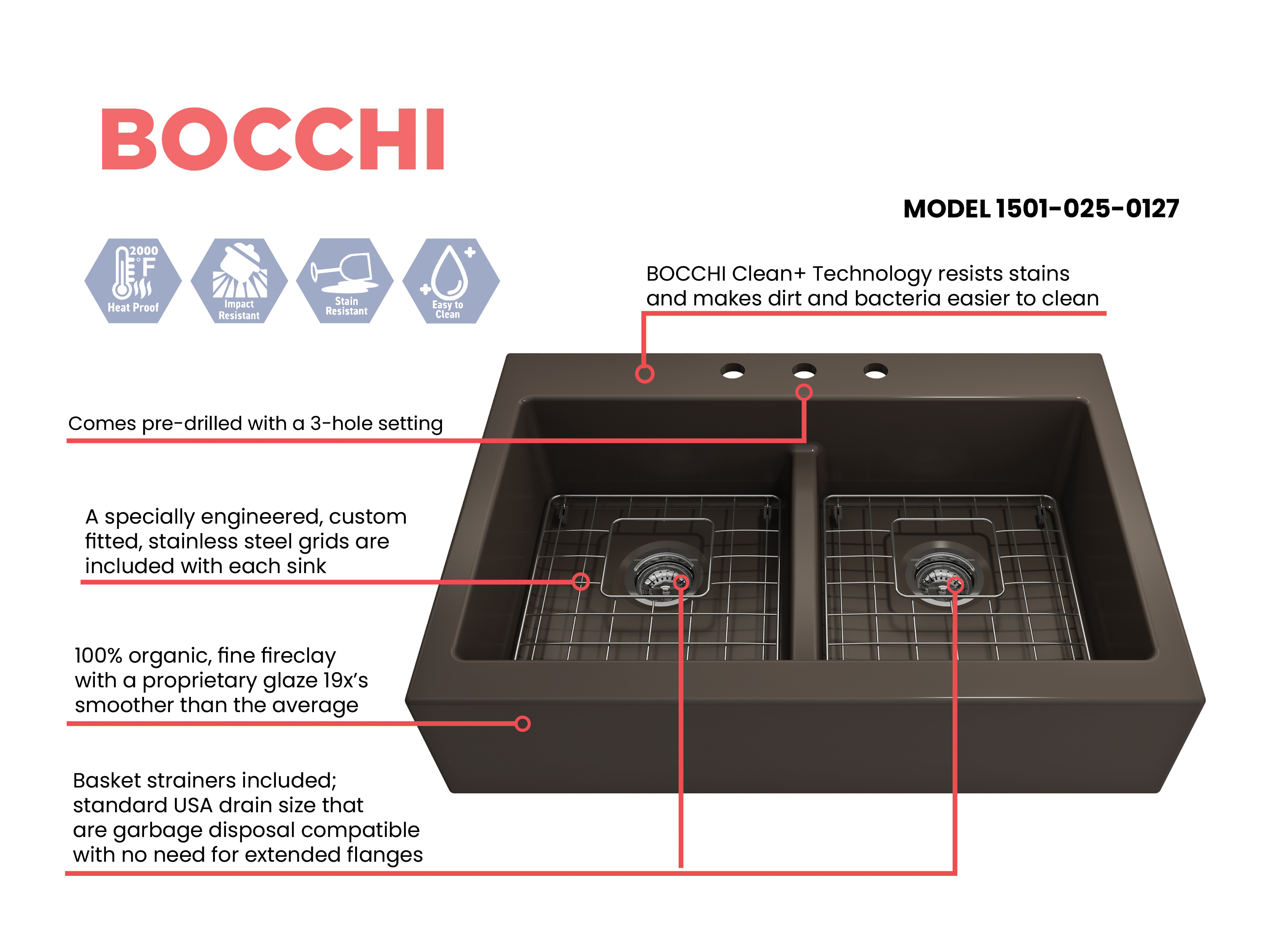 BOCCHI Farmhouse Sinks bring back the ultimate material to your kitchen. Fireclay, a 100% natural organic and recyclable material used by craftsman for centuries to create timeless appliances has now returned to your kitchen. With the firing in our kilns up to 2000°F temperatures, Fireclay becomes the most durable material used in today's kitchens. Thus, dealing with extreme heat coming from pots and pans is definitely not a problem. Due to their special glaze coating fused with the fireclay body, our sinks have a non-porous, uniform, scratch and stain resistant surface. With its protective bottom grid and distinctive looks, BOCCHI Farmhouse Sinks are truly crafted to match your design and functional desires.