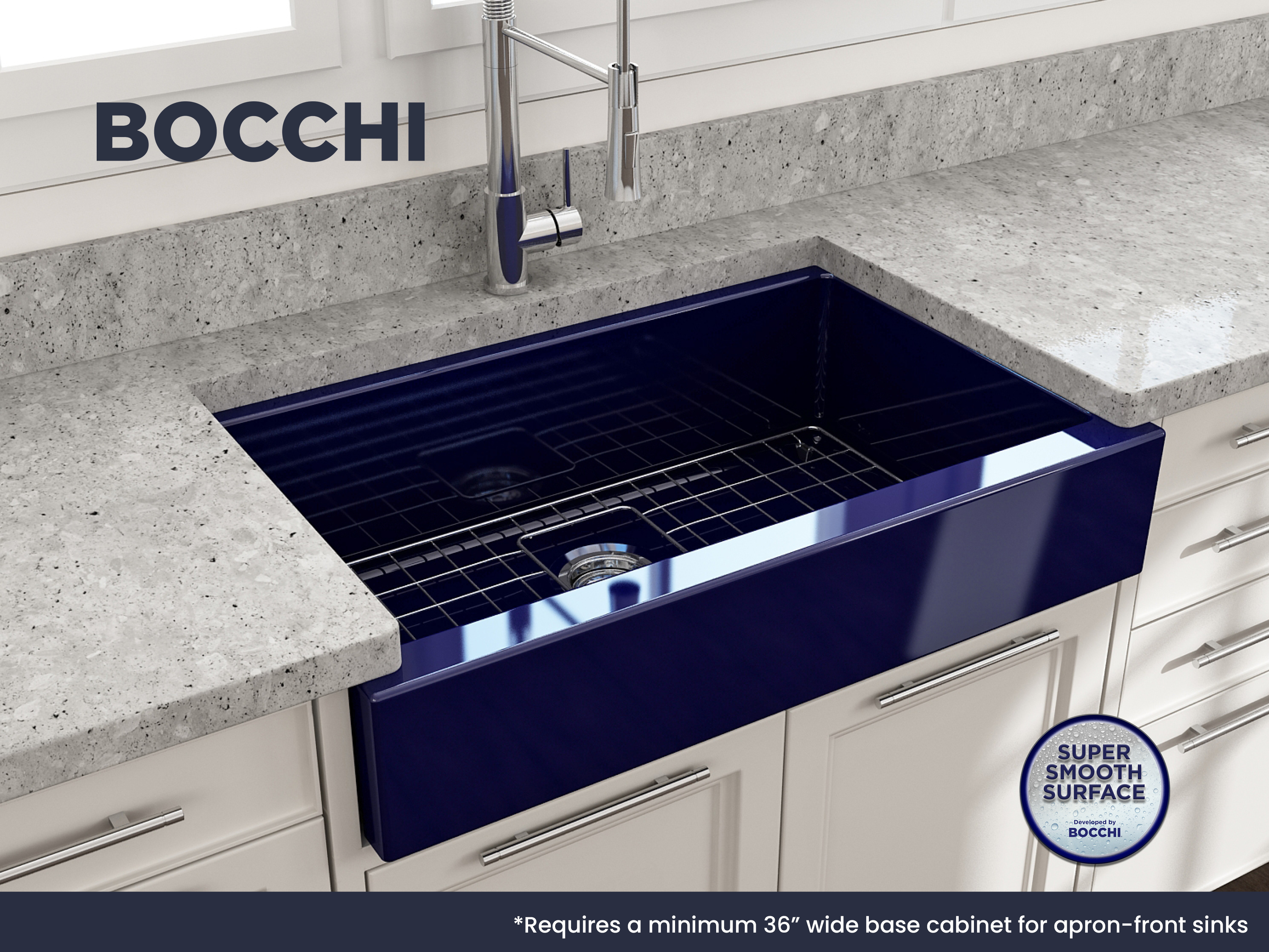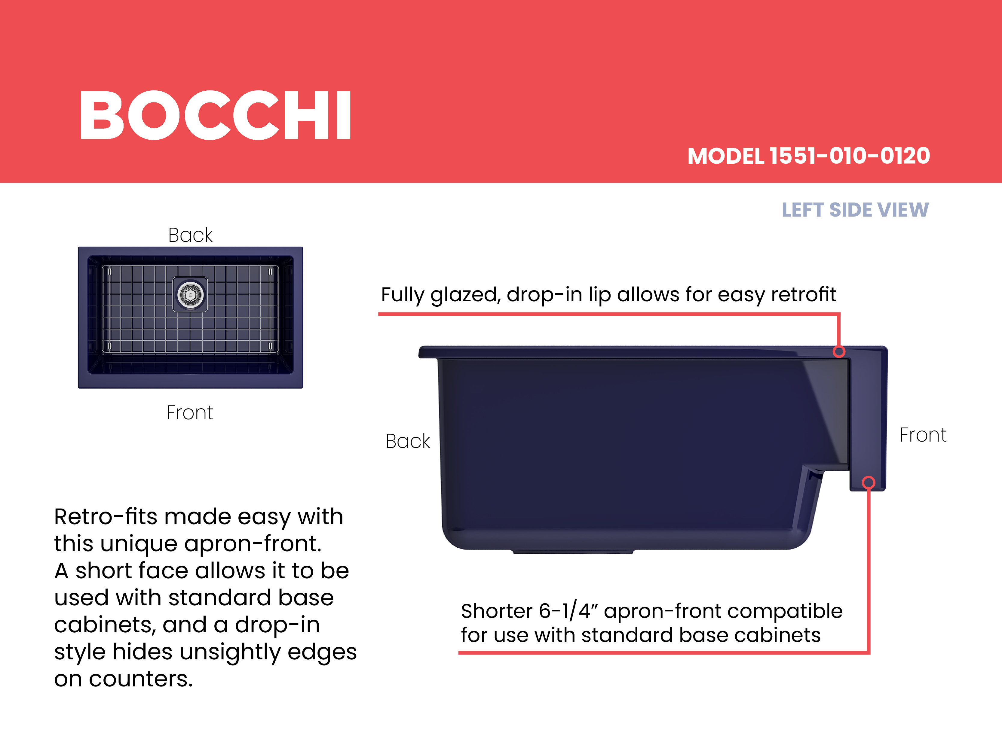 Nuova Pro sinks make remodels a breeze with a specially designed apron-fronts that cleverly hide imperfections and alterations in cabinets and counters. Featuring shorter faces to allow for use on standard base cabinets, they slant back to the deeper depth farmhouses are known for. Retrofits are made easy with these unique apron-fronts. A shorter 6.65Â inch face allow them to be used with standard base cabinets before dropping back to a deeper 10 inches. Drop-in installation recommended to accomodate the faucet deck.