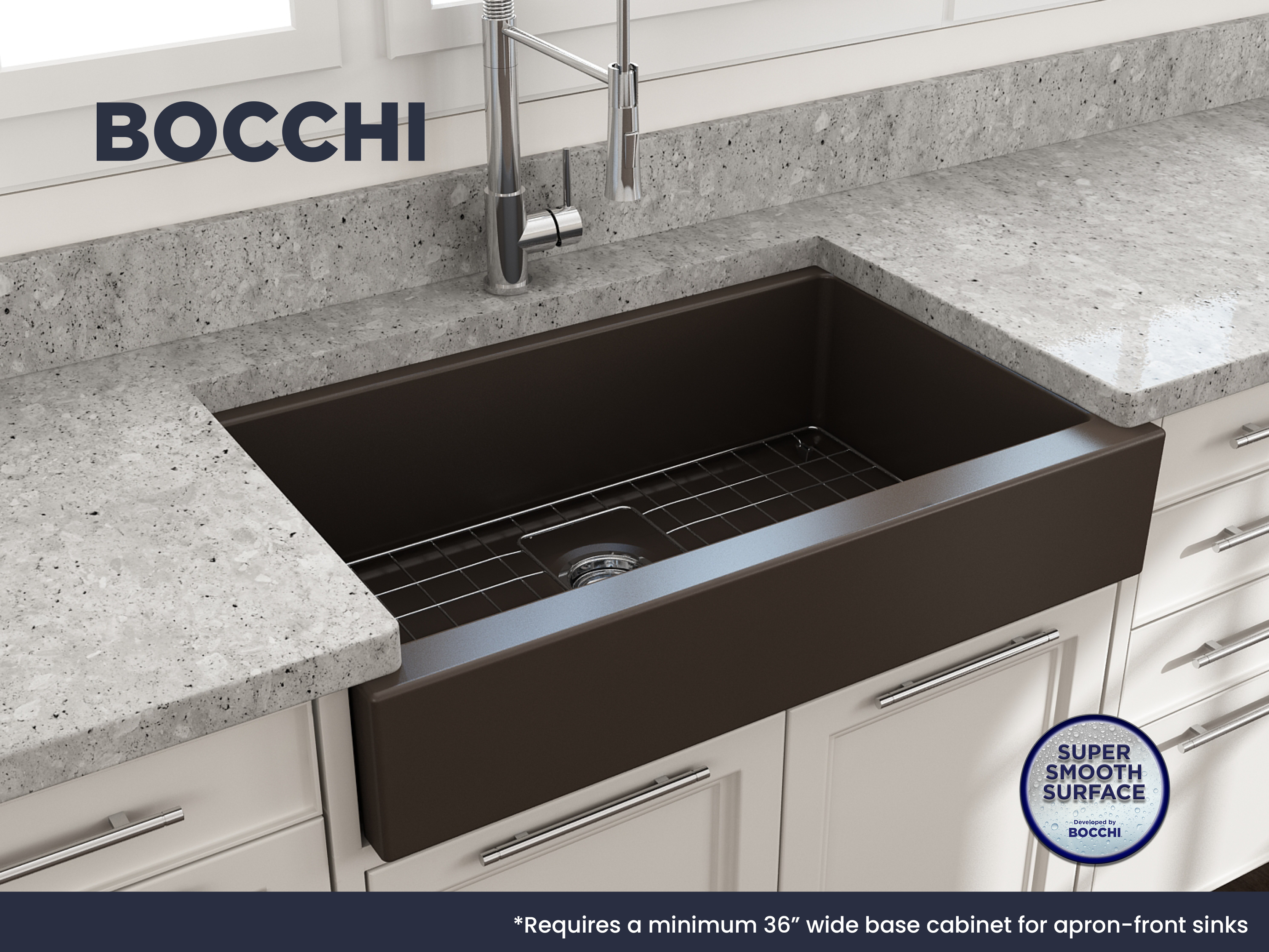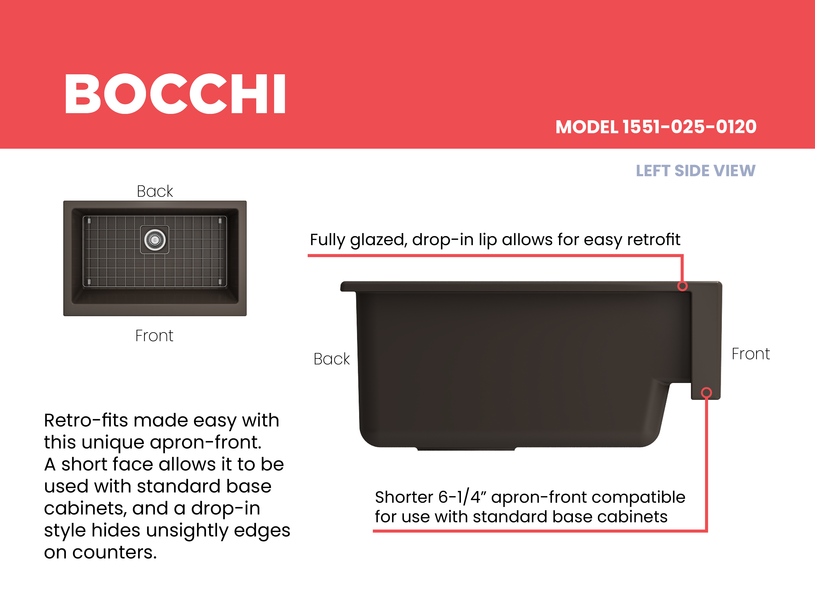 Nuova Pro sinks make remodels a breeze with a specially designed apron-fronts that cleverly hide imperfections and alterations in cabinets and counters. Featuring shorter faces to allow for use on standard base cabinets, they slant back to the deeper depth farmhouses are known for. Retrofits are made easy with these unique apron-fronts. A shorter 6.65Â inch face allow them to be used with standard base cabinets before dropping back to a deeper 10 inches. Drop-in installation recommended to accomodate the faucet deck.