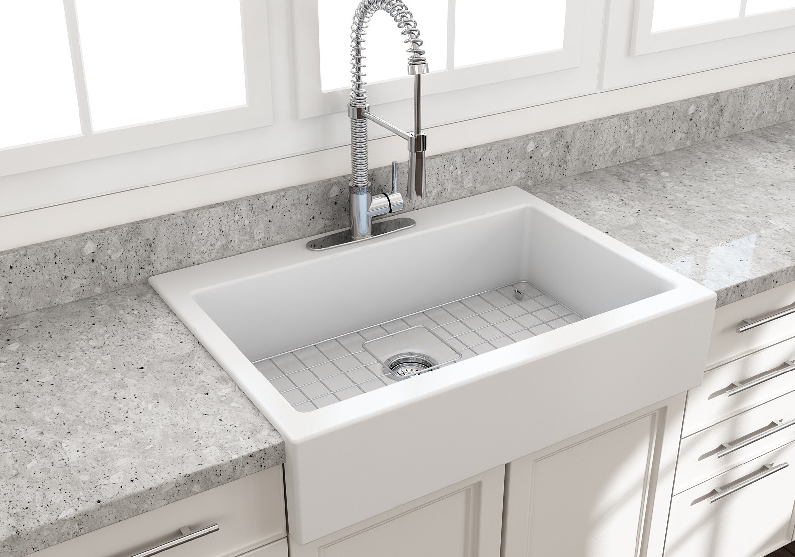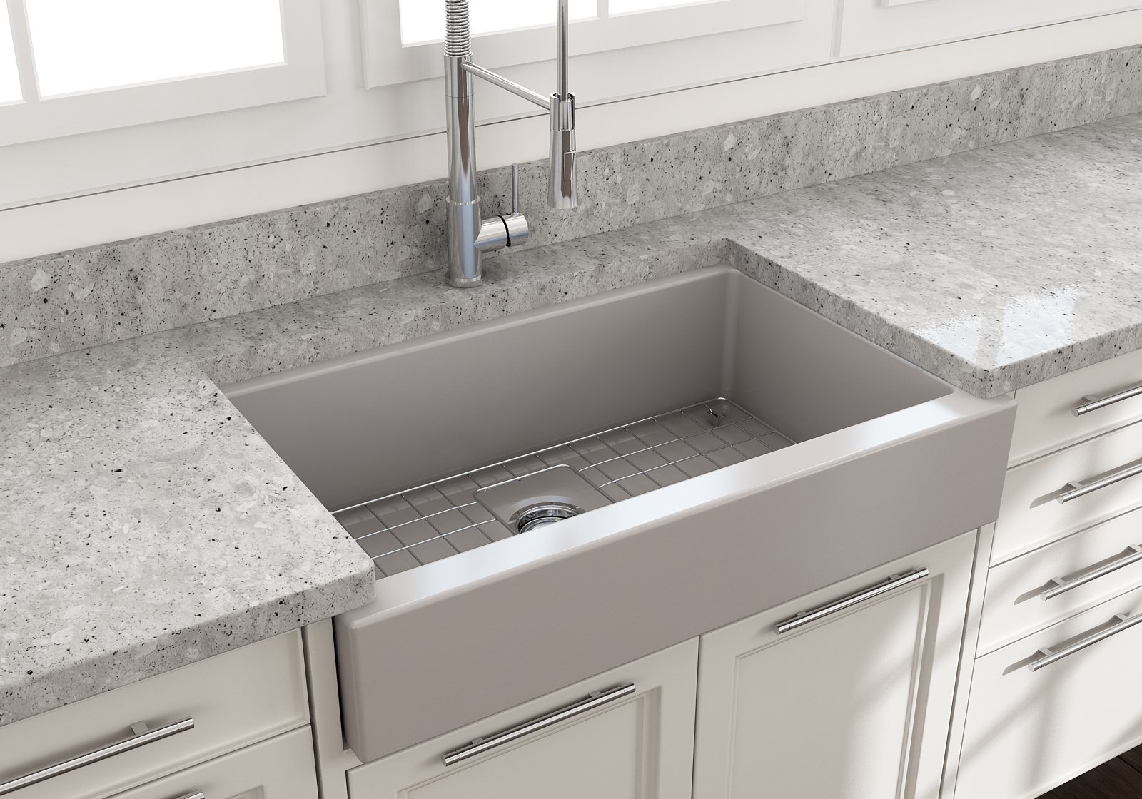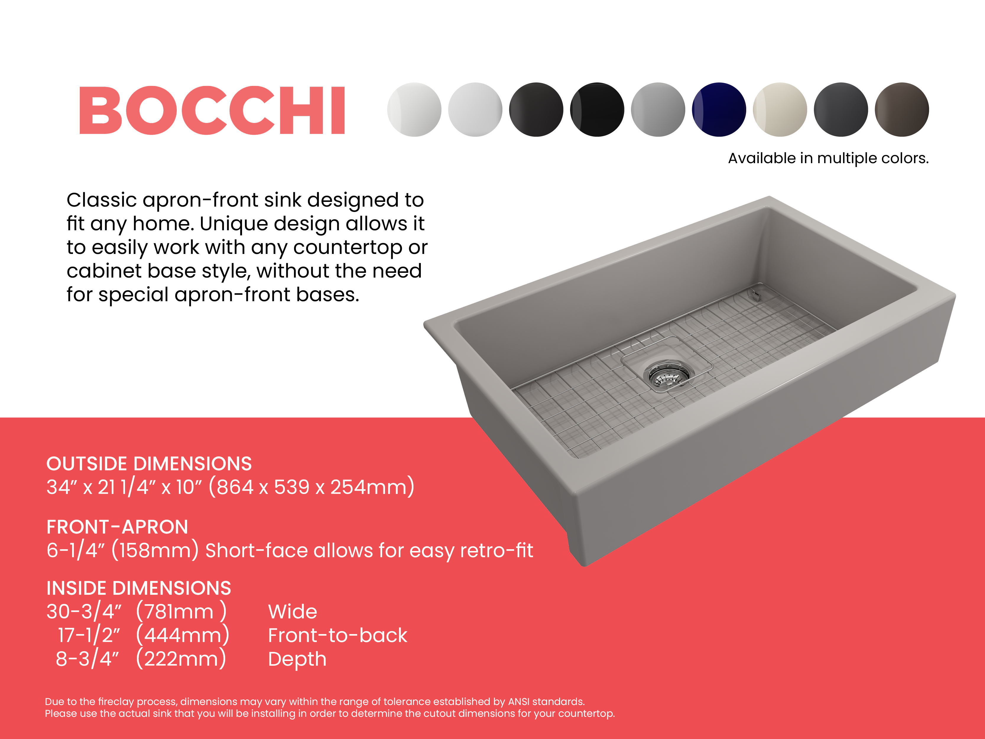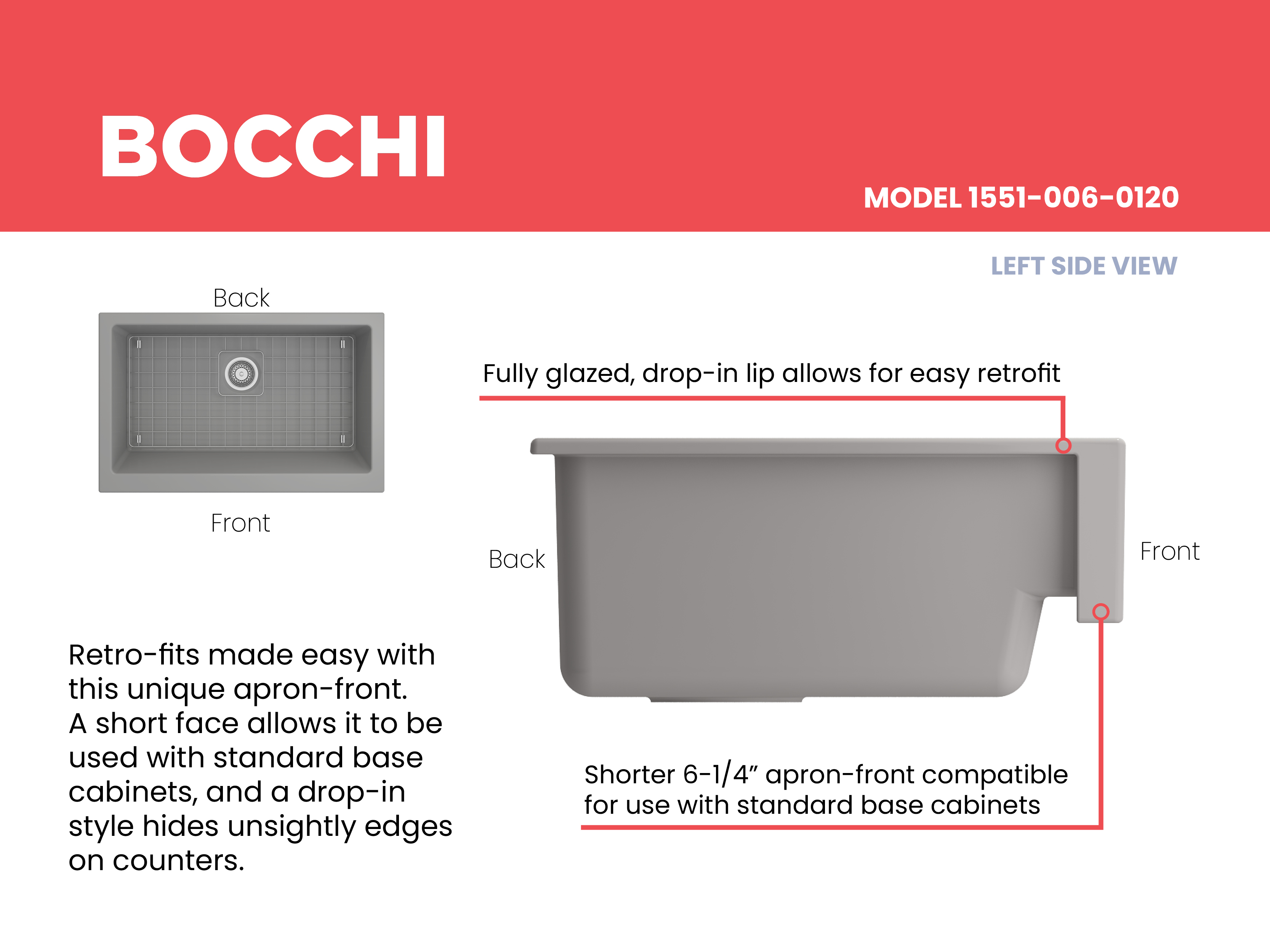 Nuova Pro sinks make remodels a breeze with a specially designed apron-fronts that cleverly hide imperfections and alterations in cabinets and counters. Featuring shorter faces to allow for use on standard base cabinets, they slant back to the deeper depth farmhouses are known for. Retrofits are made easy with these unique apron-fronts. A shorter 6.65Â inch face allow them to be used with standard base cabinets before dropping back to a deeper 10 inches. Drop-in installation recommended to accomodate the faucet deck.