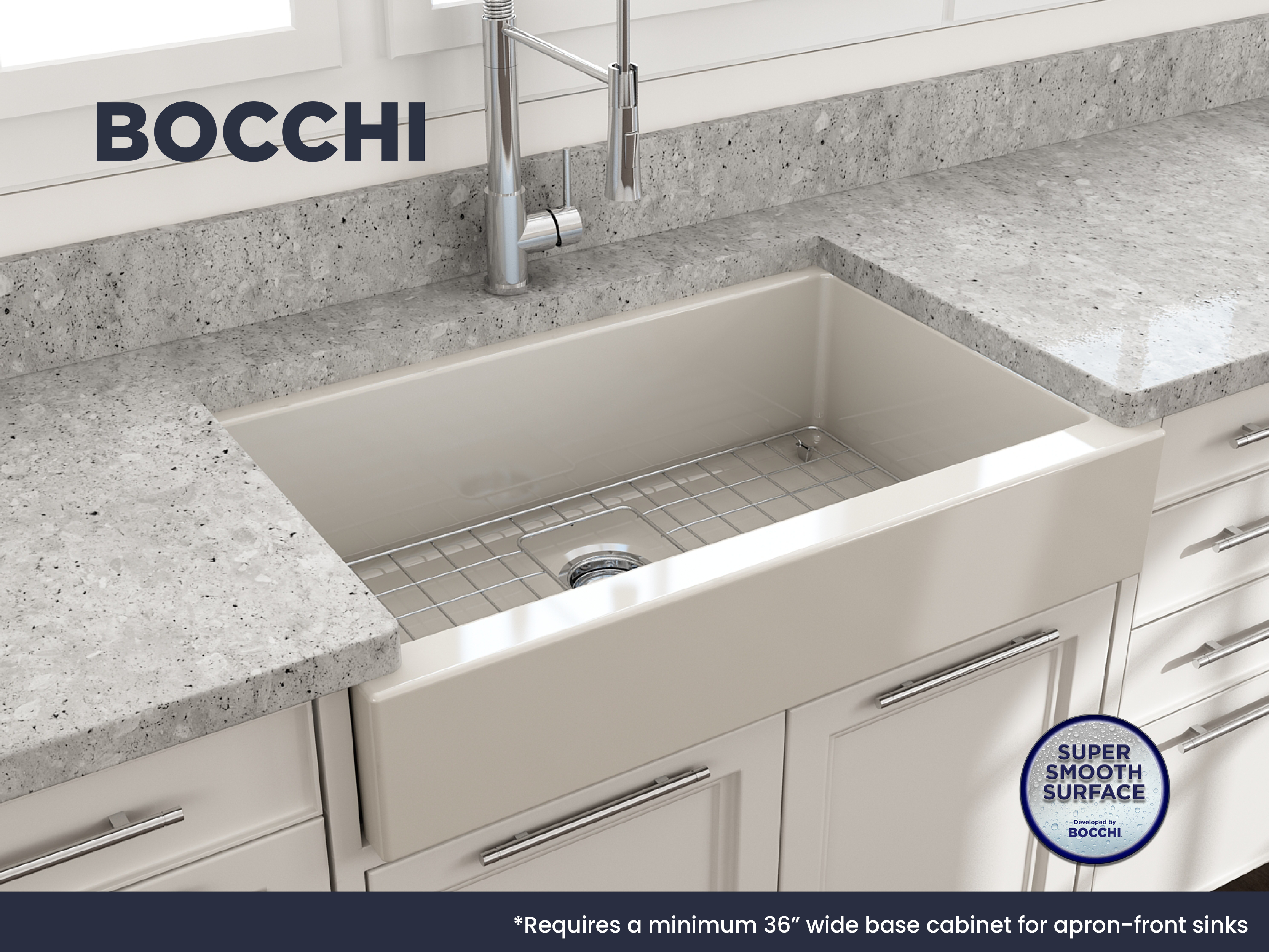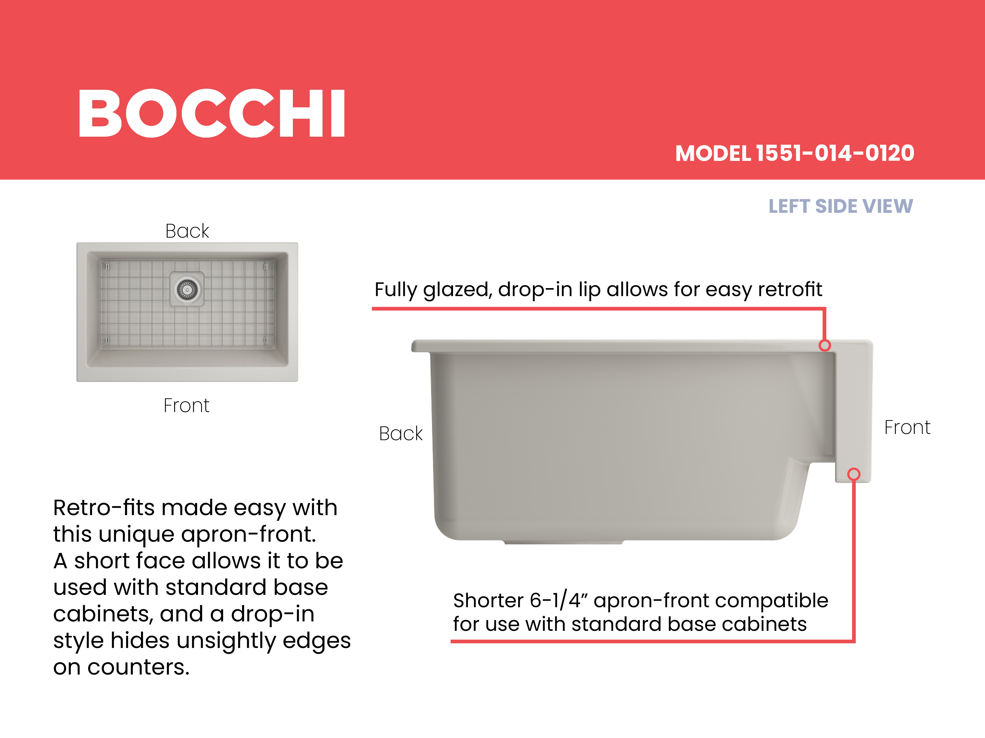 Nuova Pro sinks make remodels a breeze with a specially designed apron-fronts that cleverly hide imperfections and alterations in cabinets and counters. Featuring shorter faces to allow for use on standard base cabinets, they slant back to the deeper depth farmhouses are known for. Retrofits are made easy with these unique apron-fronts. A shorter 6.65Â inch face allow them to be used with standard base cabinets before dropping back to a deeper 10 inches. Drop-in installation recommended to accomodate the faucet deck.