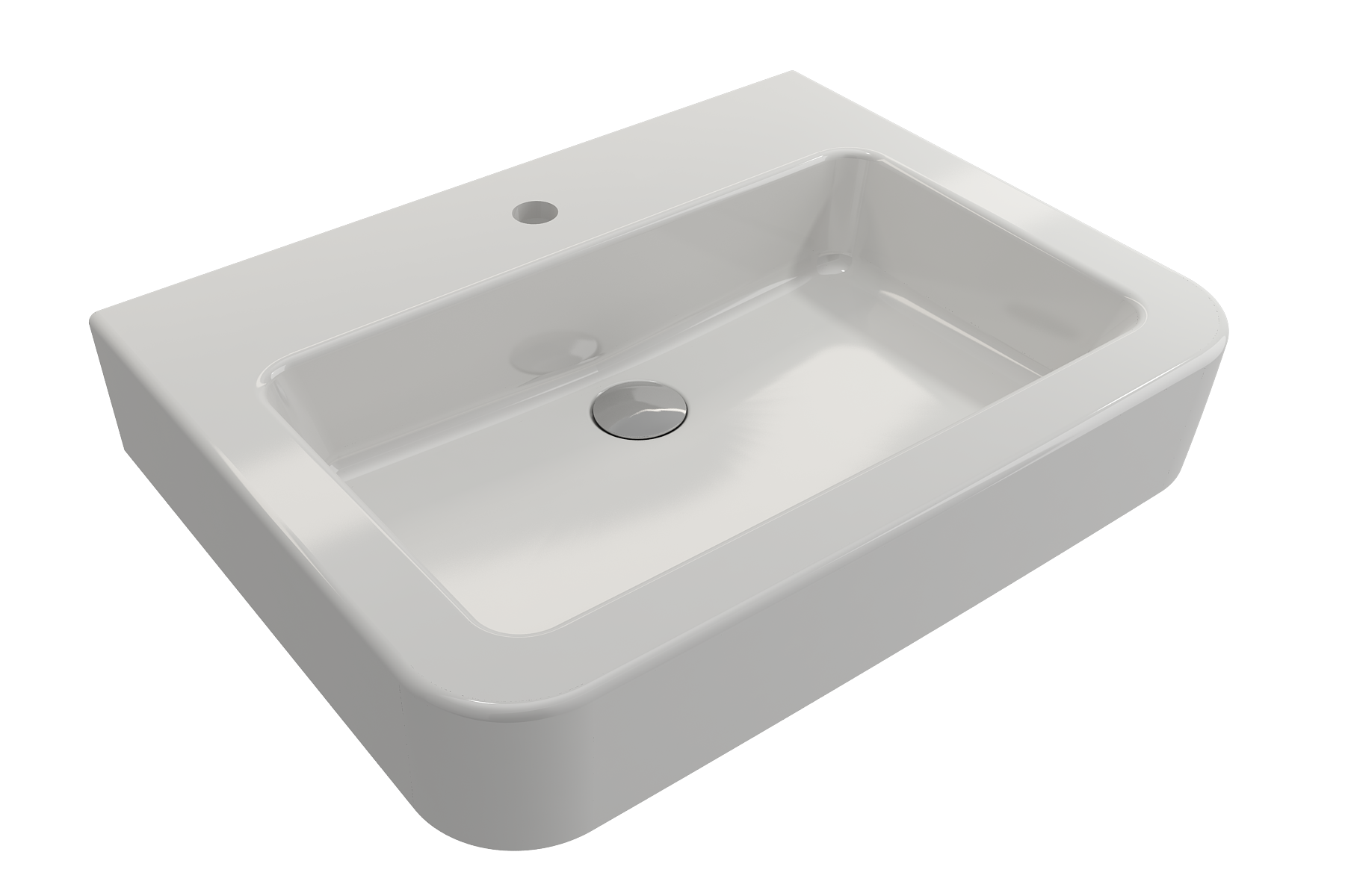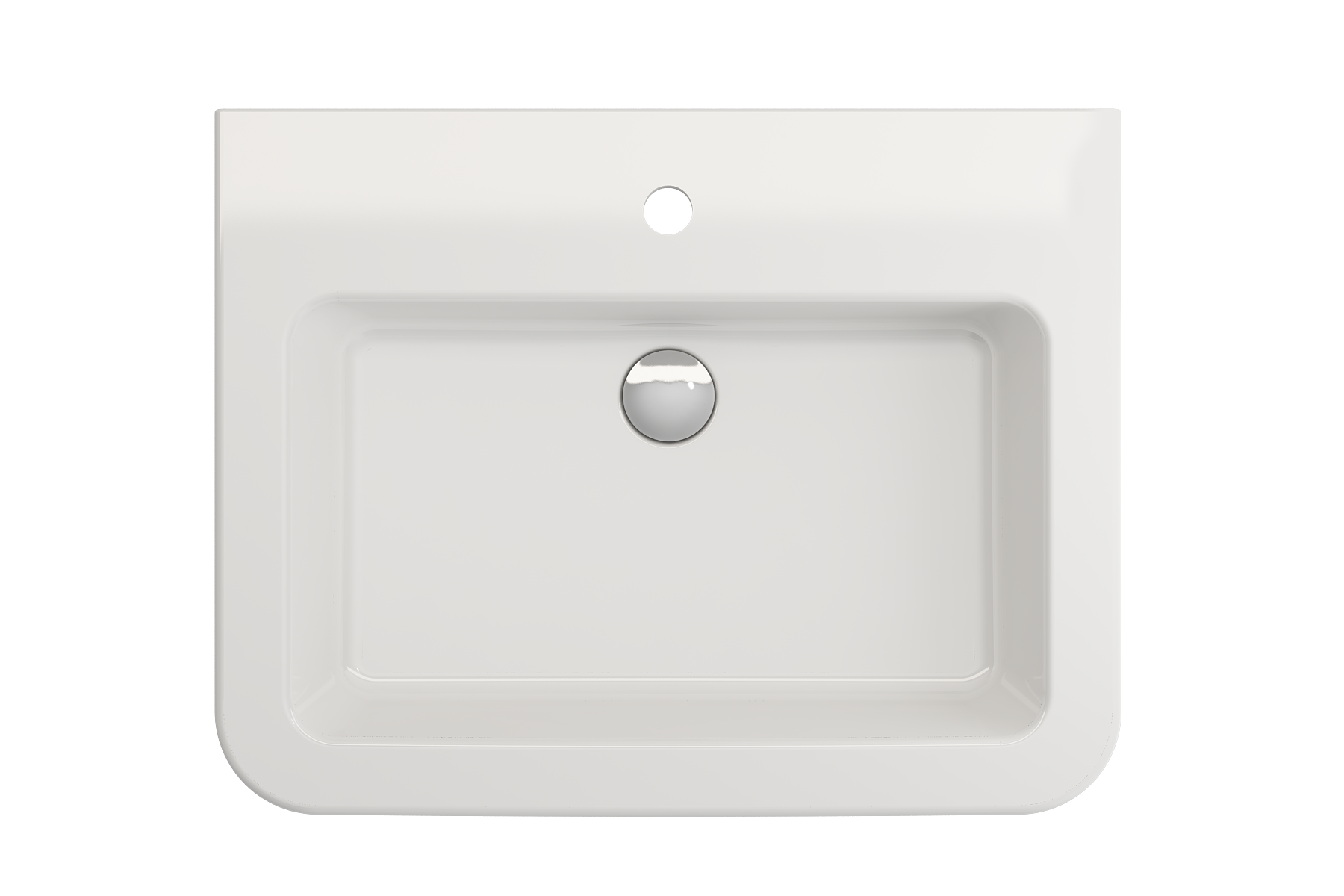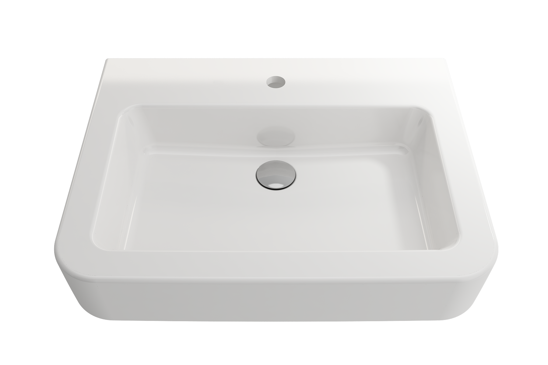 Bathroom sink with single-hole faucet setting. May be wall-hung, used with metal console legs, or counterset.